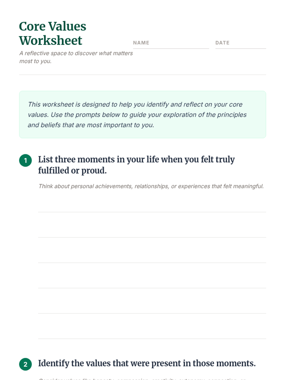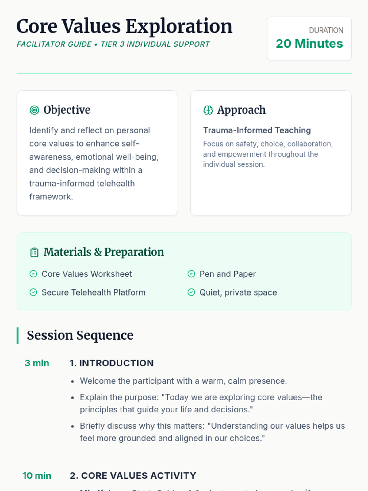A 20-minute trauma-informed session for adults to identify and reflect on their personal core values through guided mindfulness and structured reflection.
