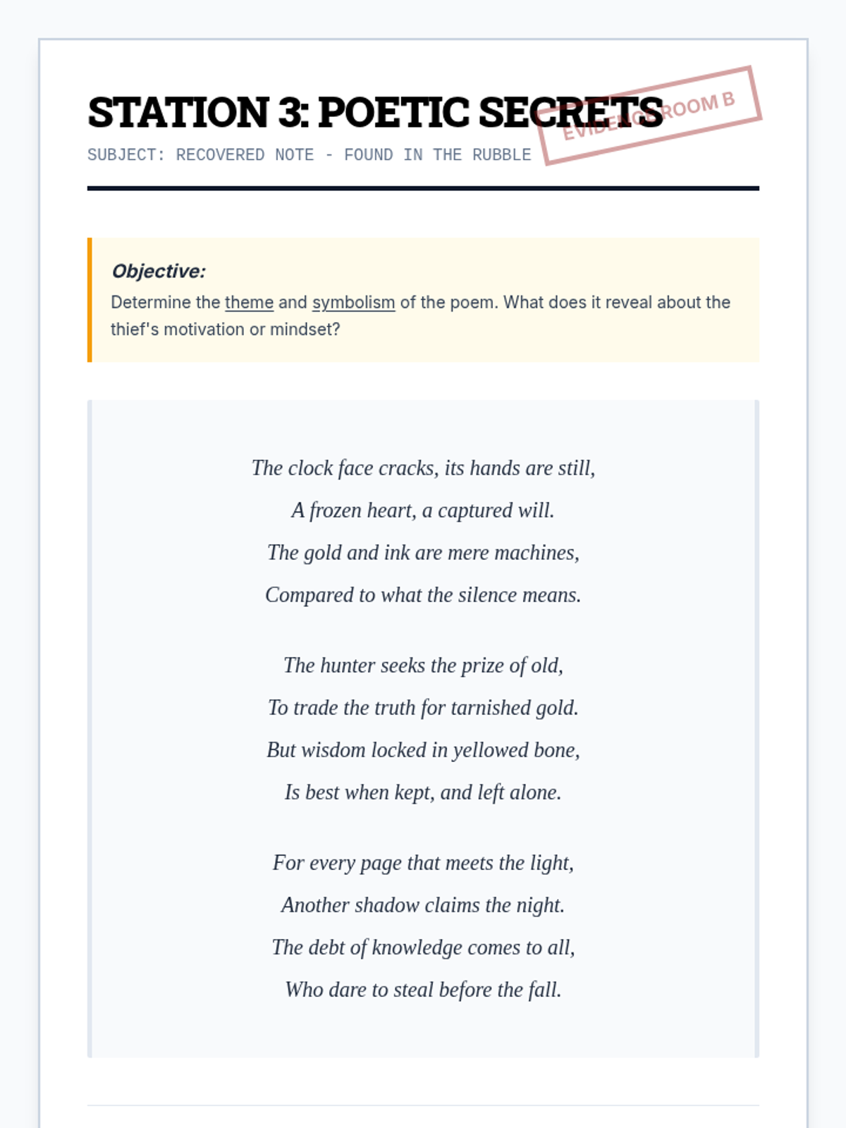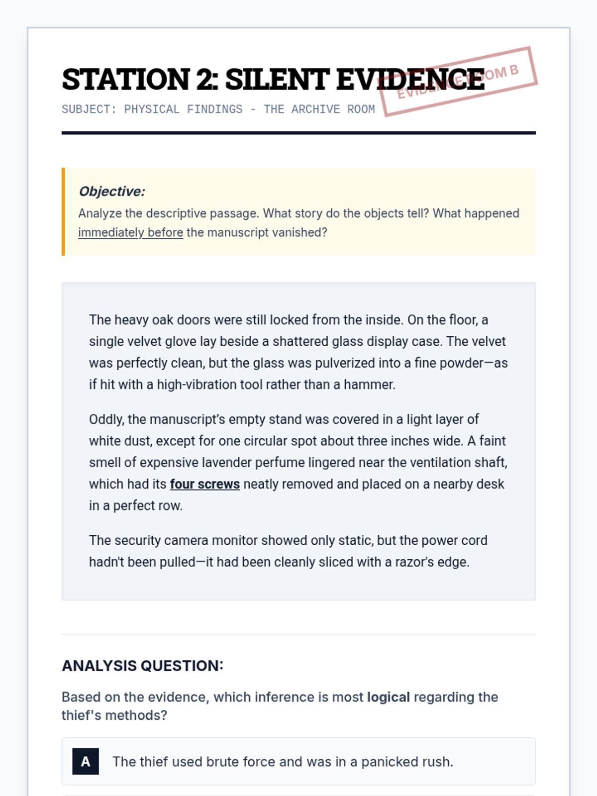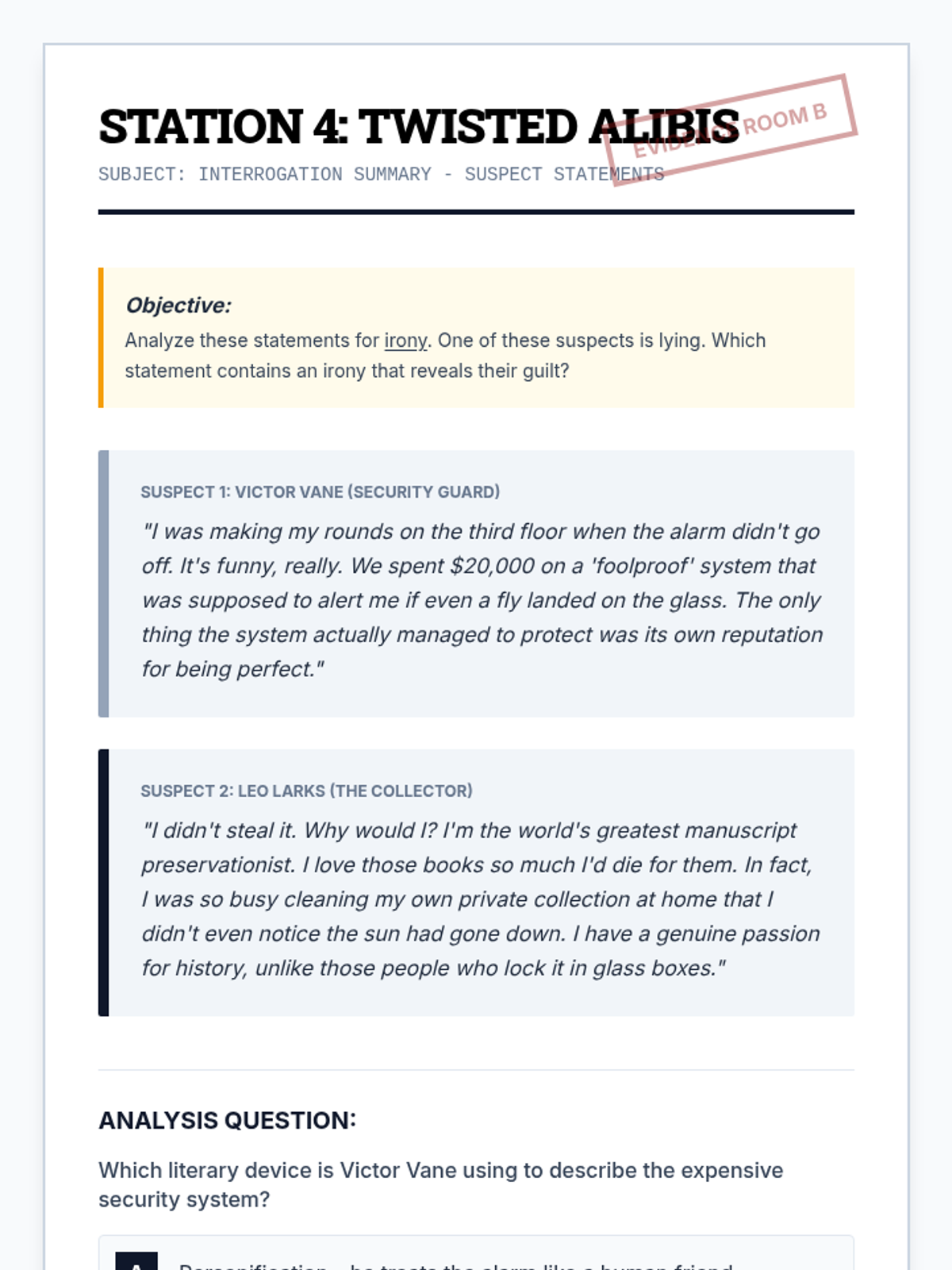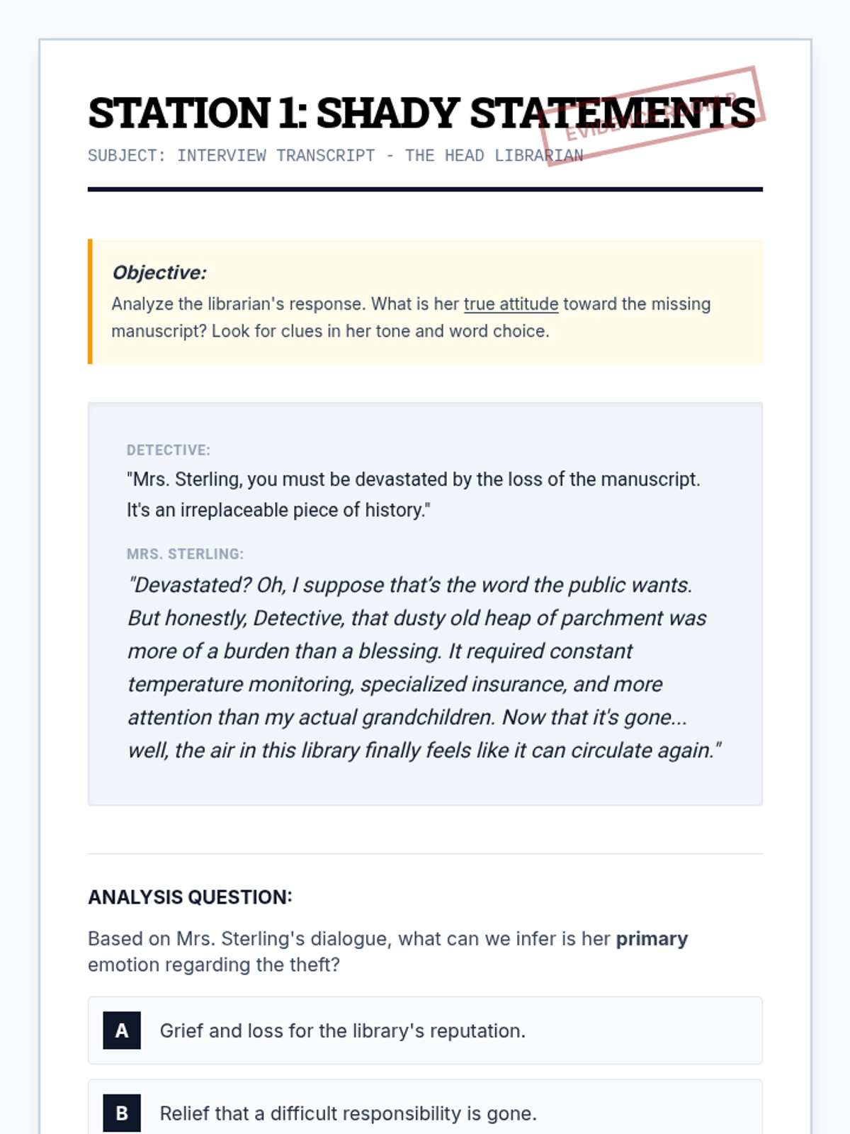 A high-stakes station-based escape room where students apply English 2 inferencing TEKS to solve a noir-style mystery. Students analyze dialogue, visual clues, and literary devices to crack the code.