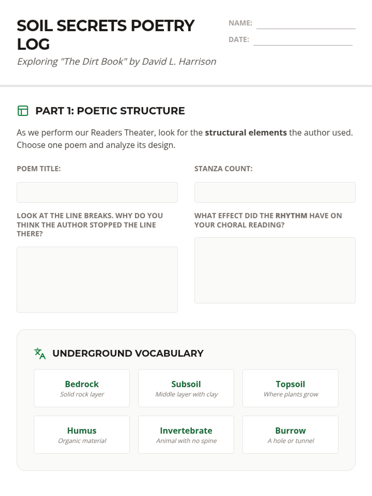 A multi-sensory lesson for 6th-grade emergent bilinguals that uses "The Dirt Book" to explore poetry structure and the underground ecosystem, culminating in a hands-on "dirt dessert" activity.