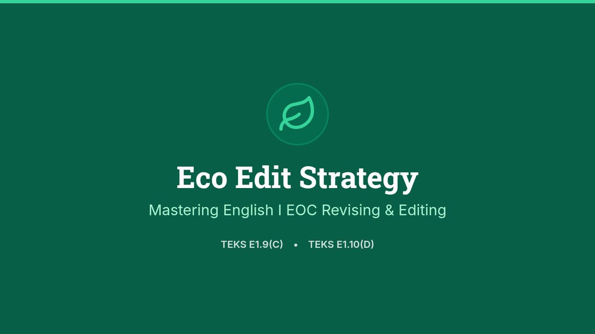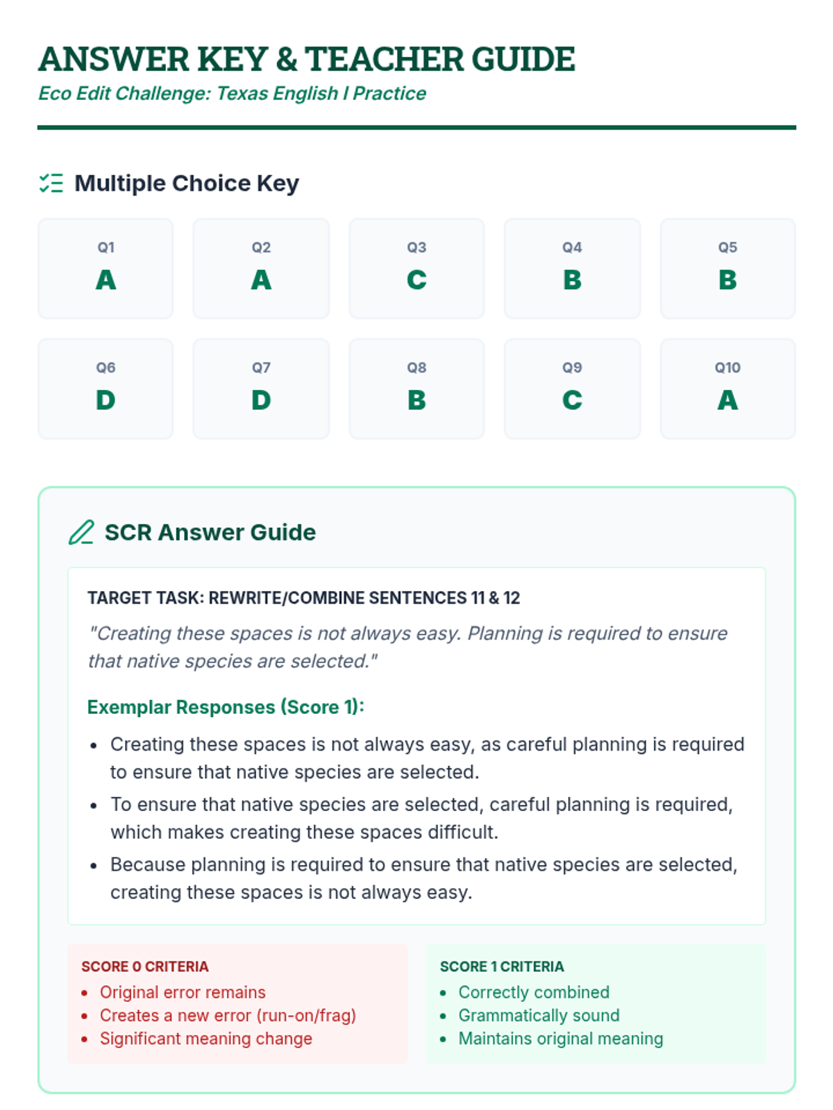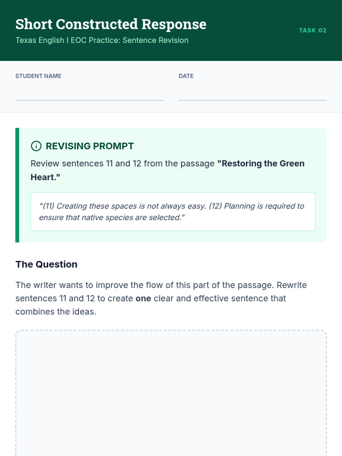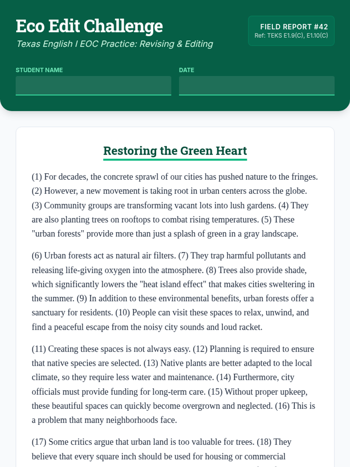 A practice assessment focused on revising and editing skills for the Texas English 1 EOC, featuring a passage on environmental conservation. Students will practice sentence combining, clarity, and grammatical corrections in a STAAR-aligned format.