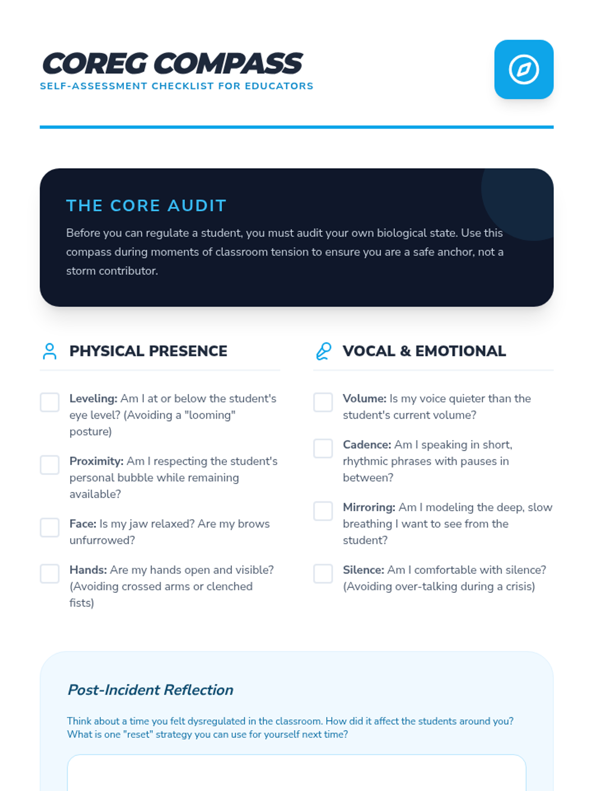 Focuses on the educator's role in co-regulation, emphasizing teacher self-control, voice volume, and physical proximity as tools to mirror calm for a dysregulated student.