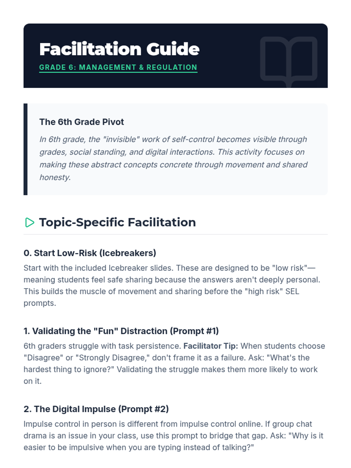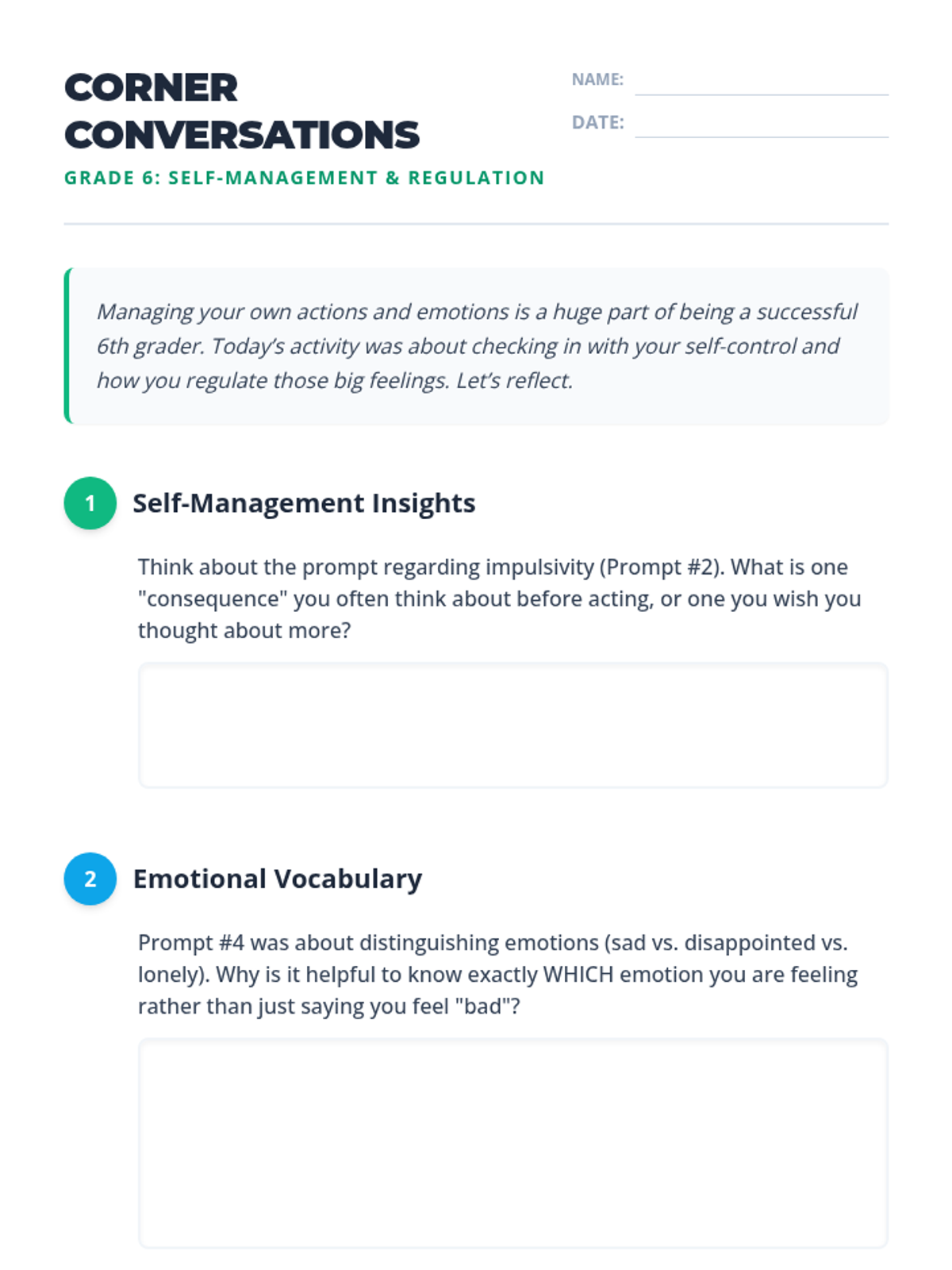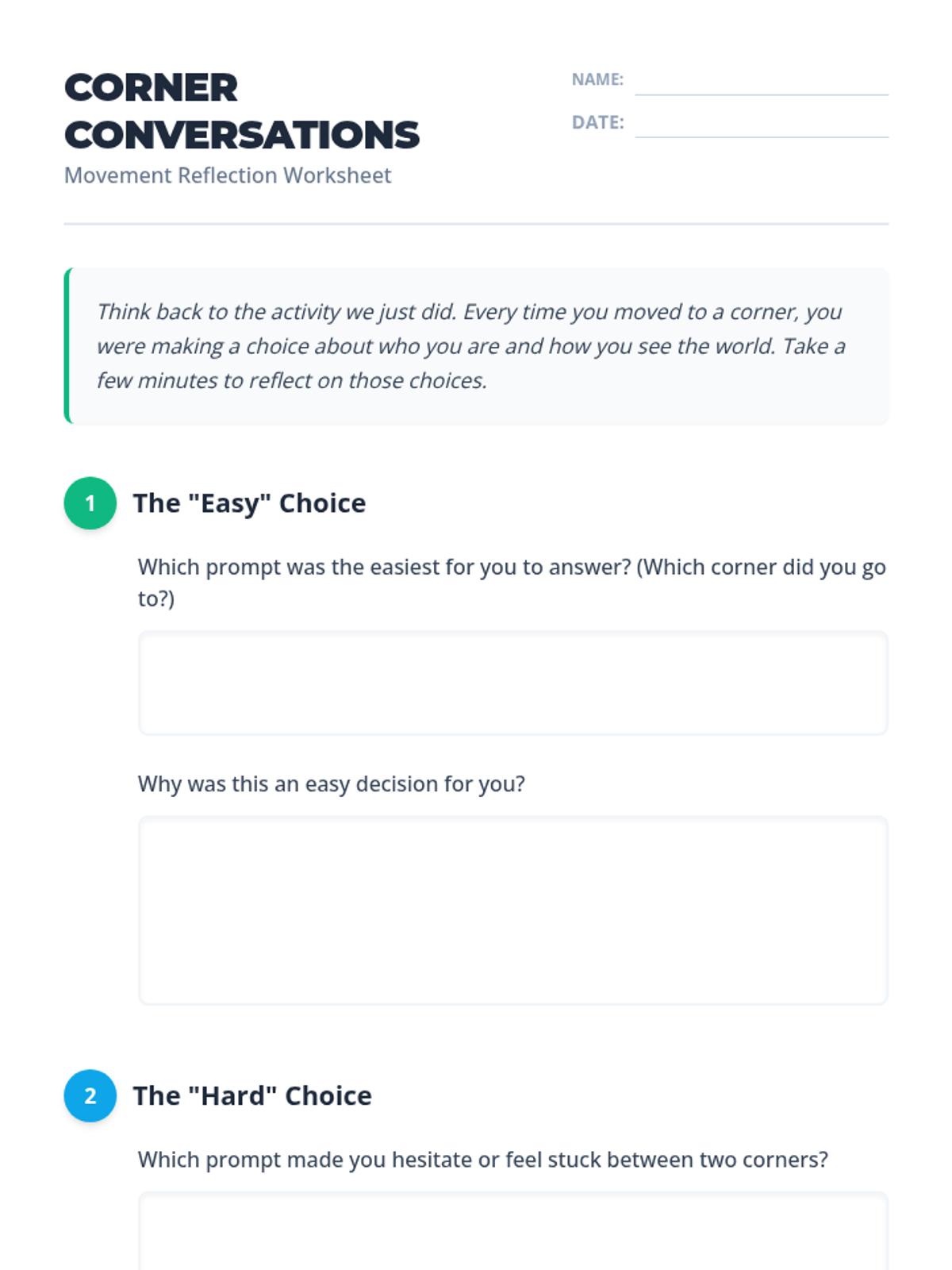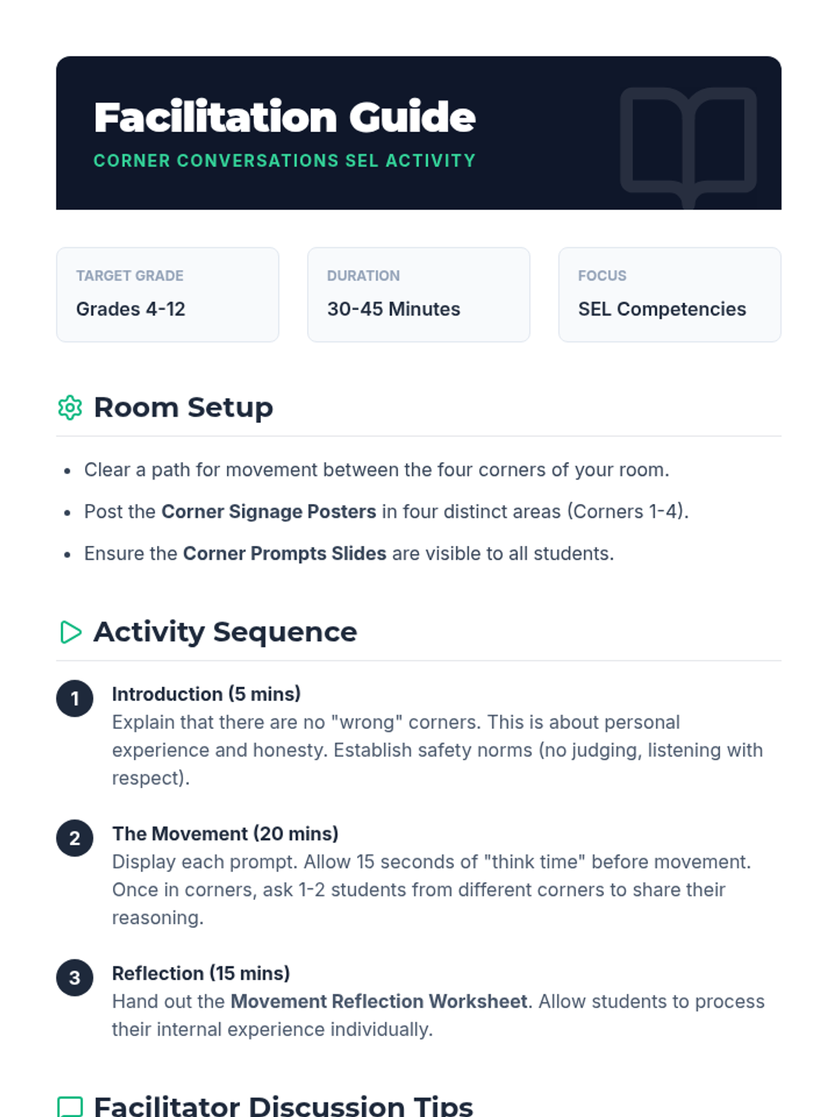 An interactive movement-based SEL activity where students explore self-awareness, emotional management, and social dynamics by moving to different corners of the room.