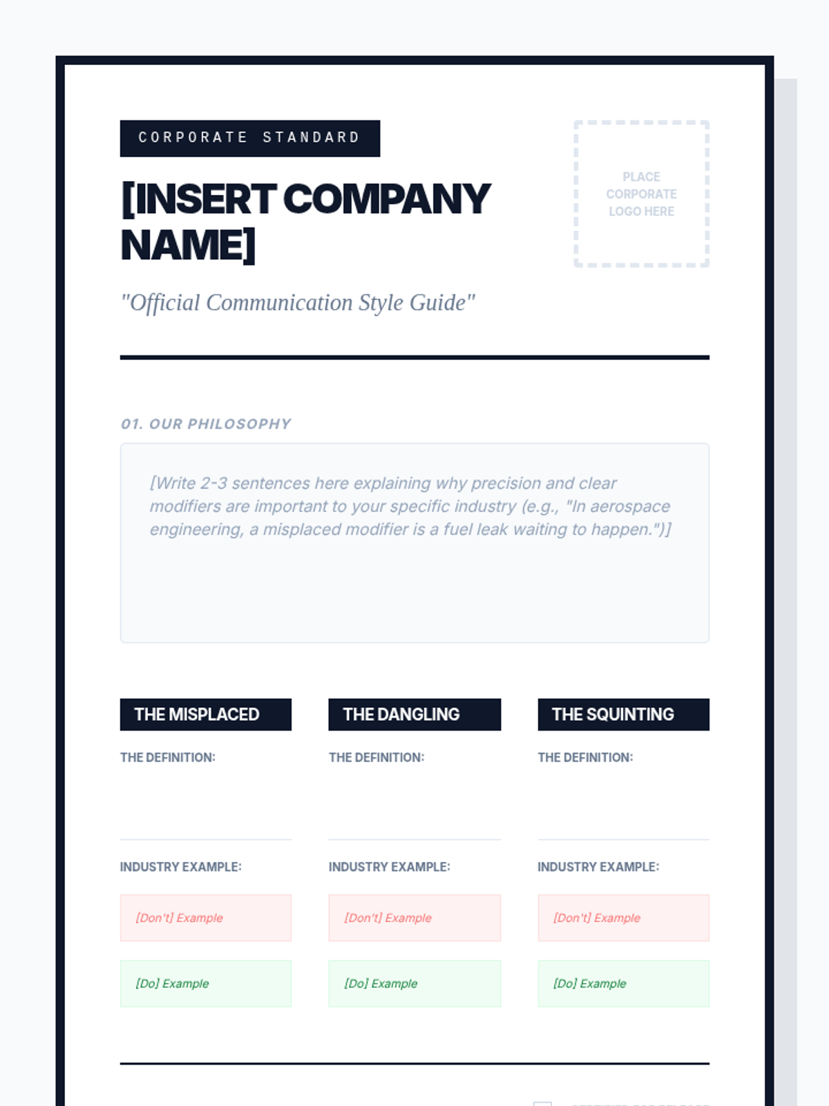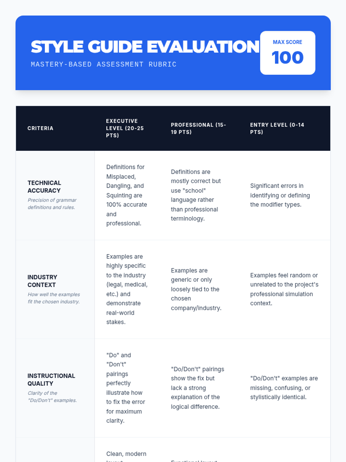 Students synthesize their learning by creating a professional corporate style guide that explains modifier rules and provides best practices for a fictional business.