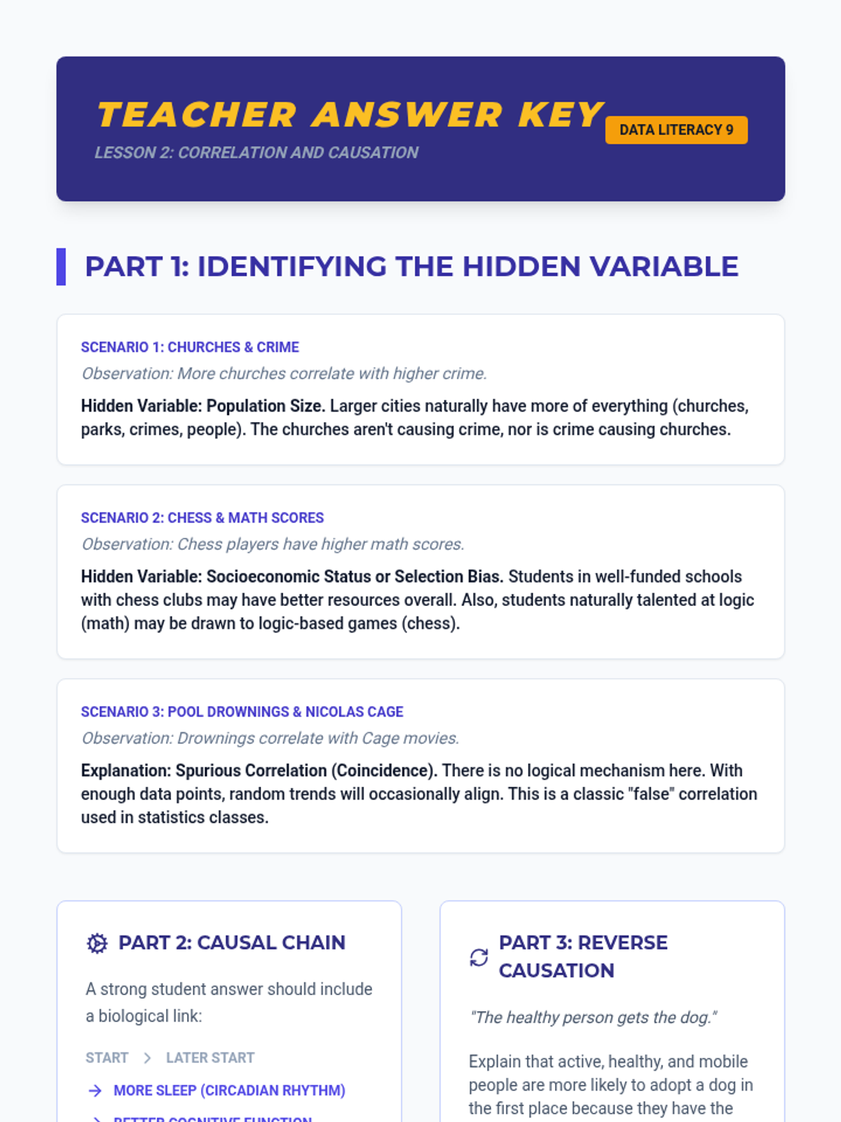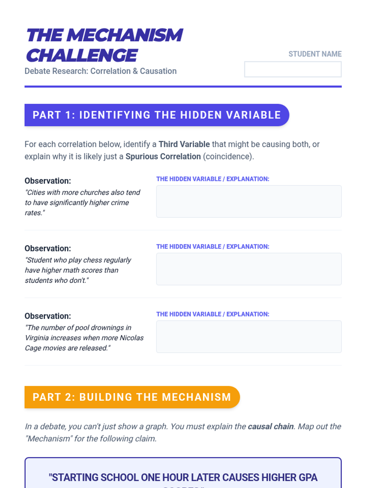 Students explore the logical gap between two events happening together and one causing the other. They look at humorous examples of spurious correlations to understand why they must research the mechanism of causation.