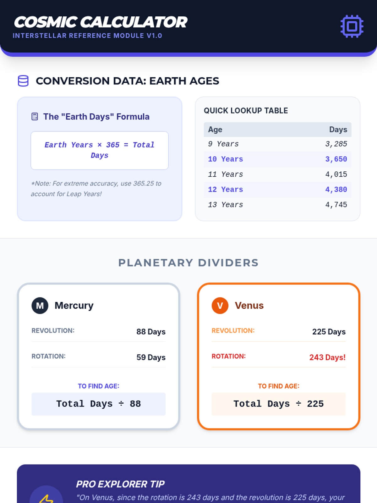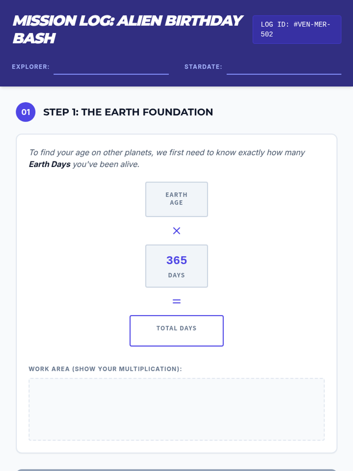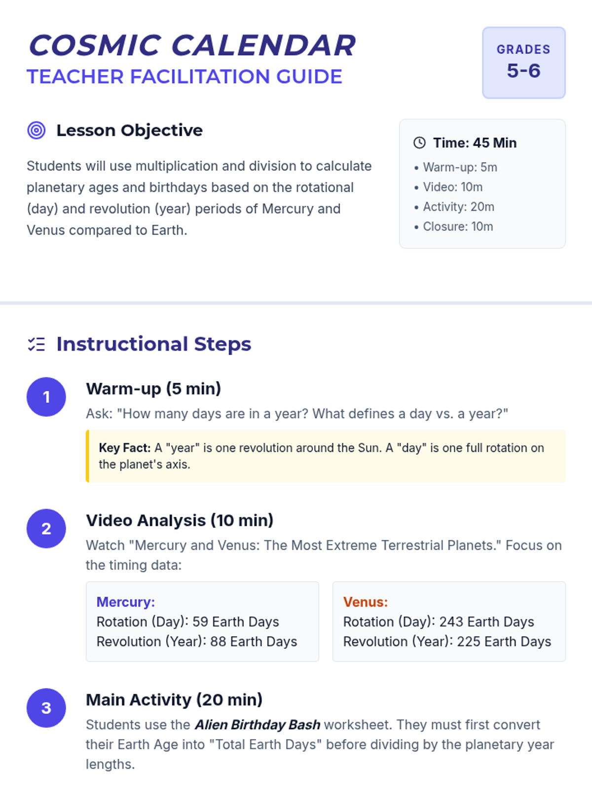 Students explore the unique rotational and revolution periods of Mercury and Venus, using mathematical operations to calculate their planetary ages and birthdays while analyzing the 'Venus Paradox' where a day is longer than a year.