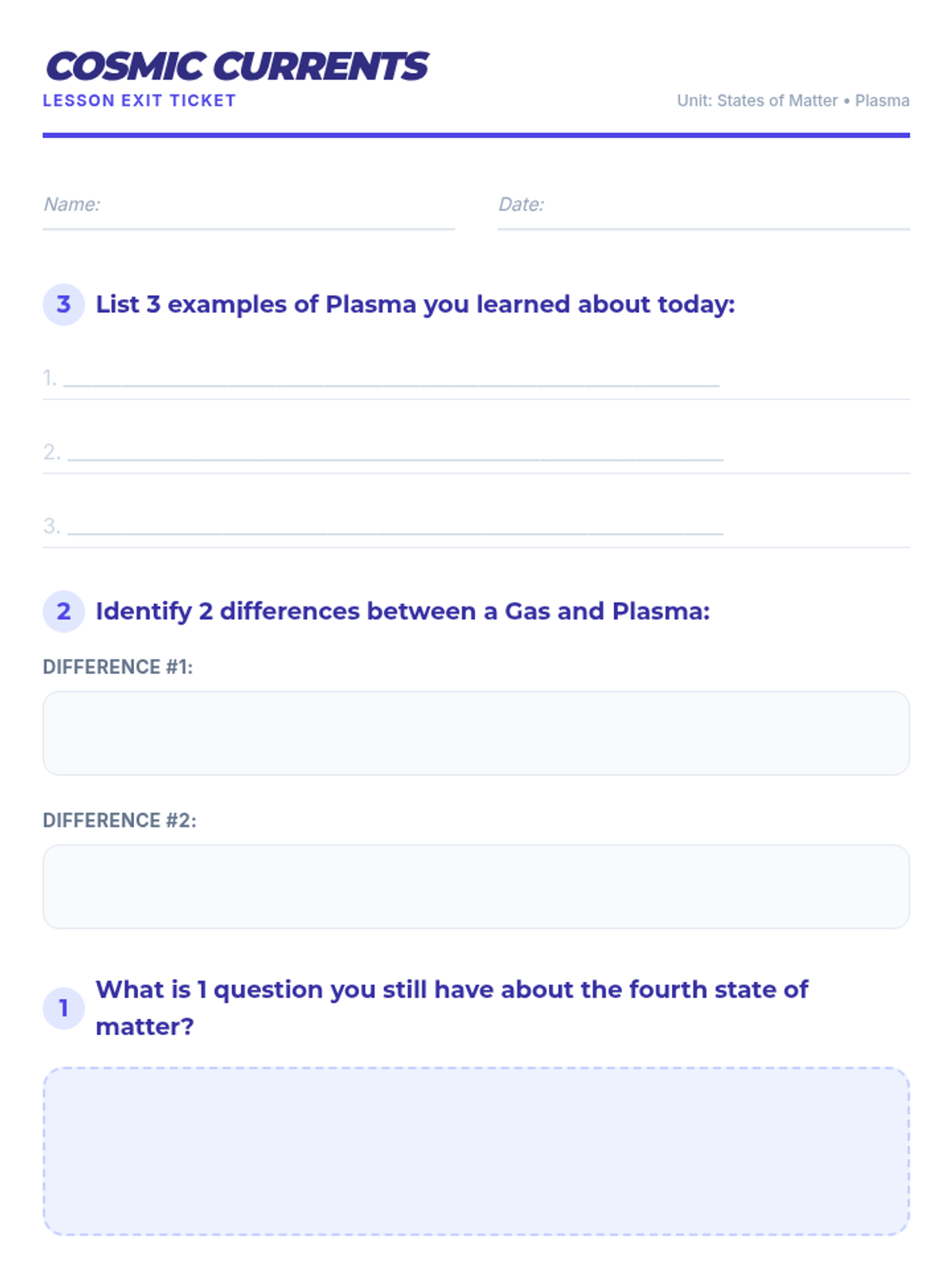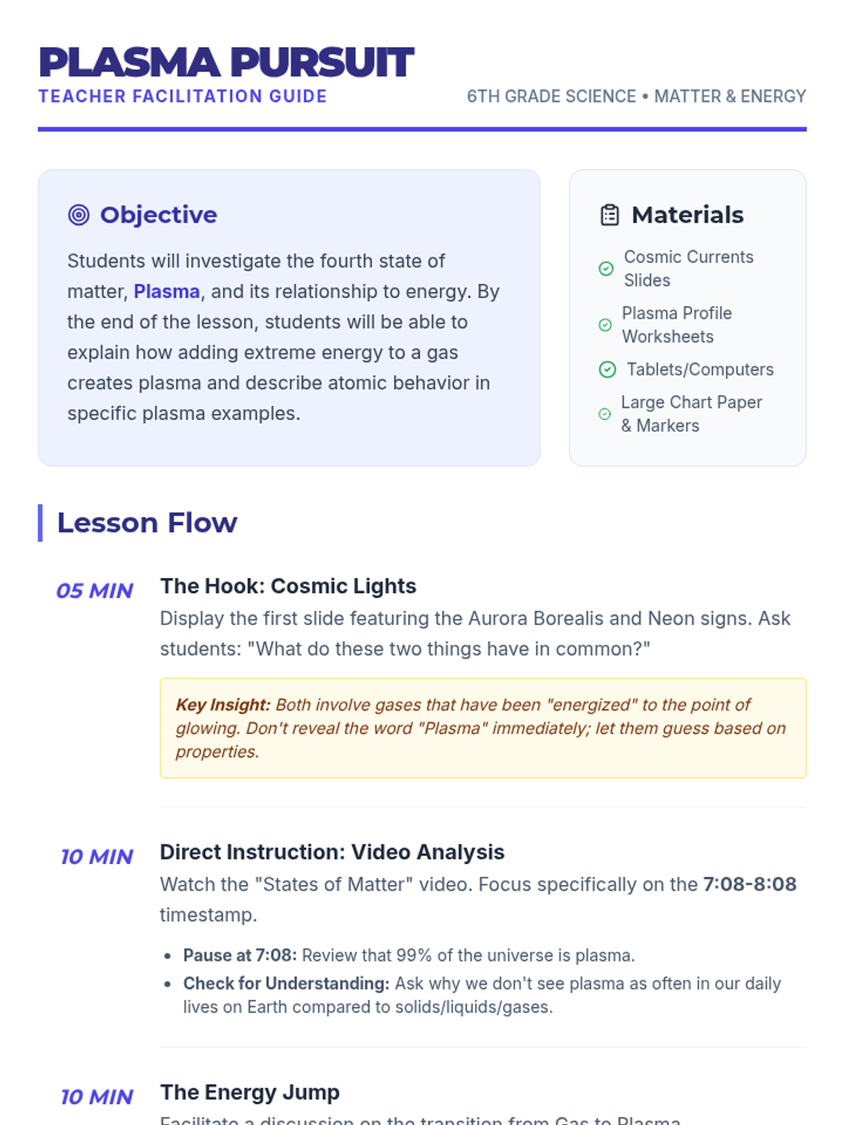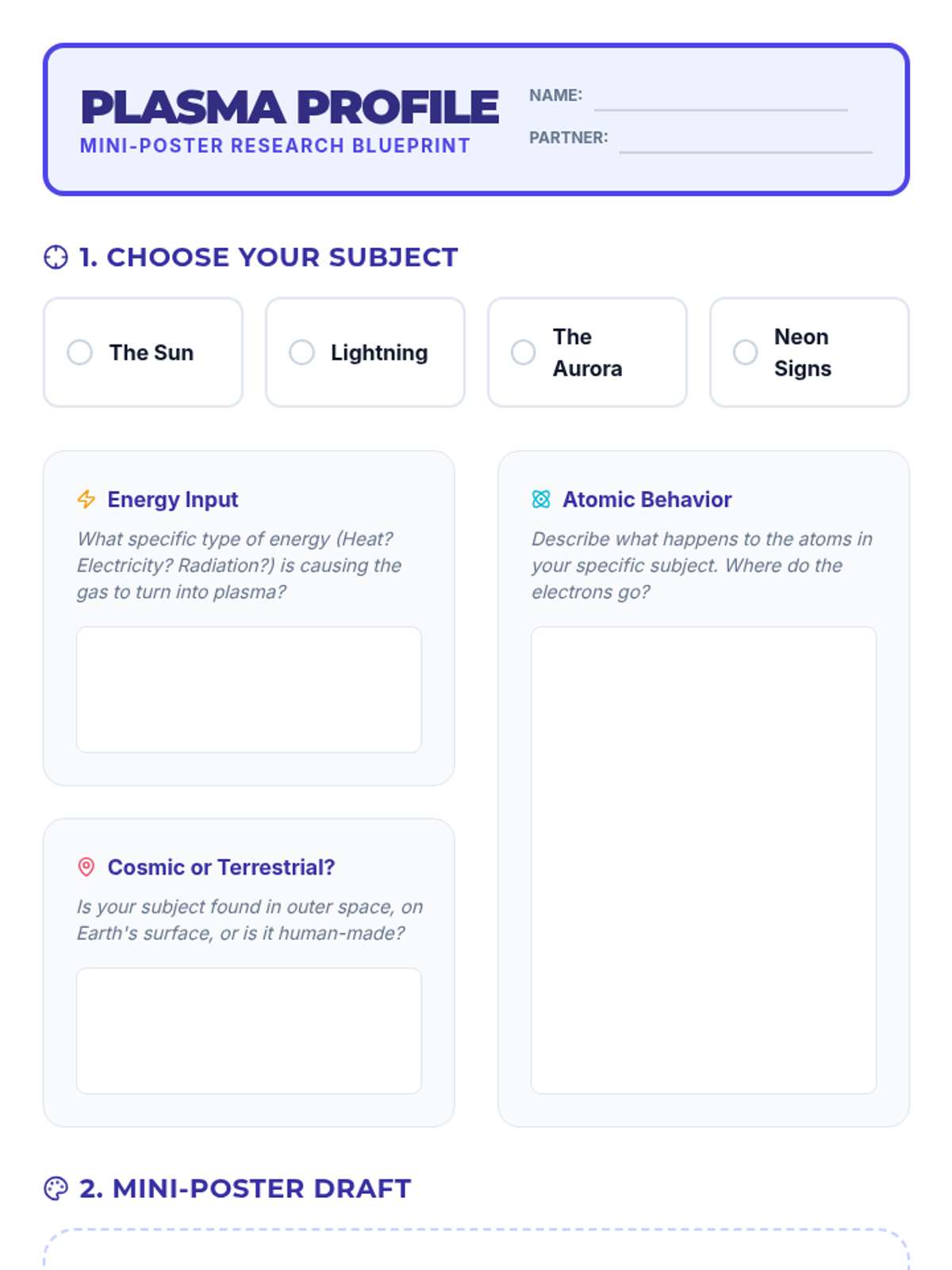 Students investigate the fourth state of matter, Plasma, by exploring how intense energy causes atoms to break apart. The lesson features a video analysis, collaborative research on cosmic and terrestrial plasma examples, and the creation of 'Plasma Profile' mini-posters.
