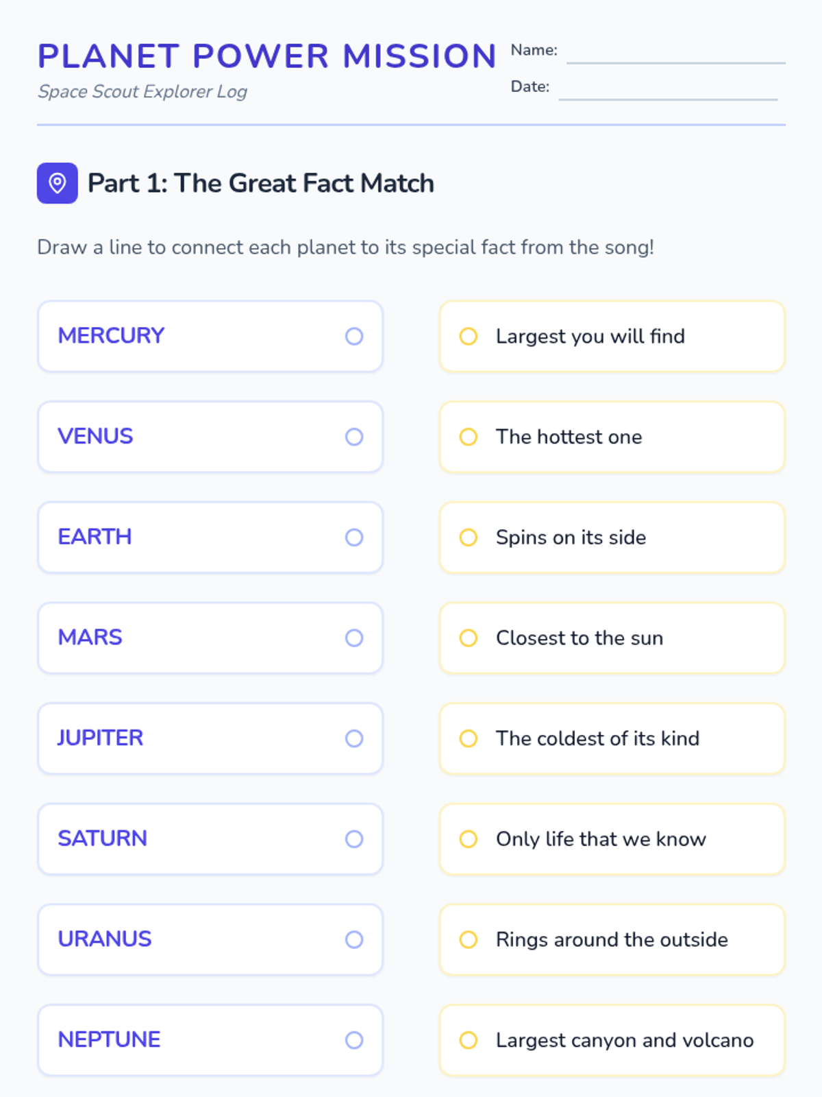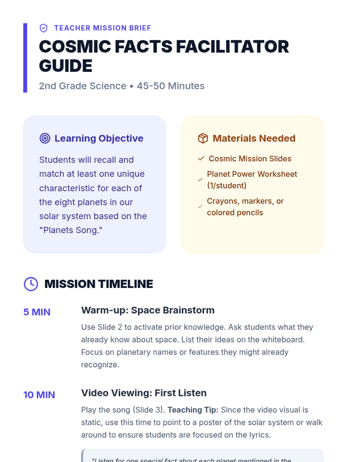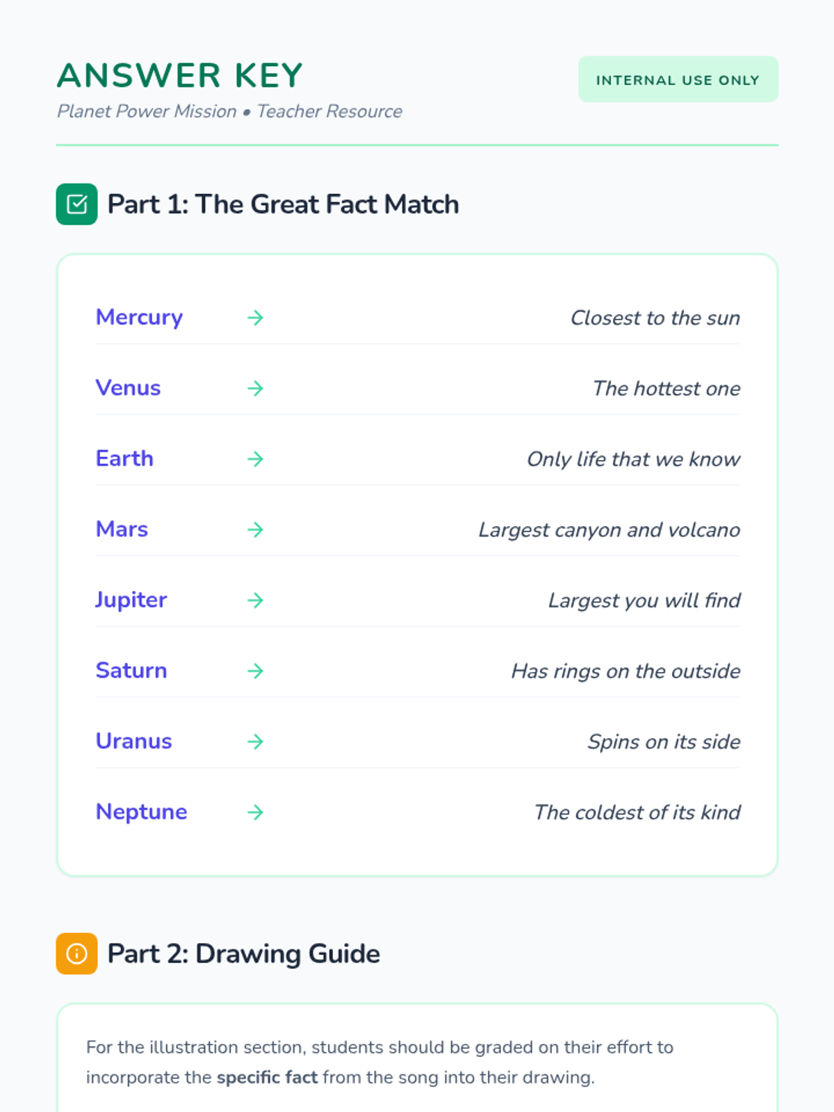 A 2nd-grade science lesson where students learn key facts about the eight planets in our solar system through a rhythmic song and matching activity.