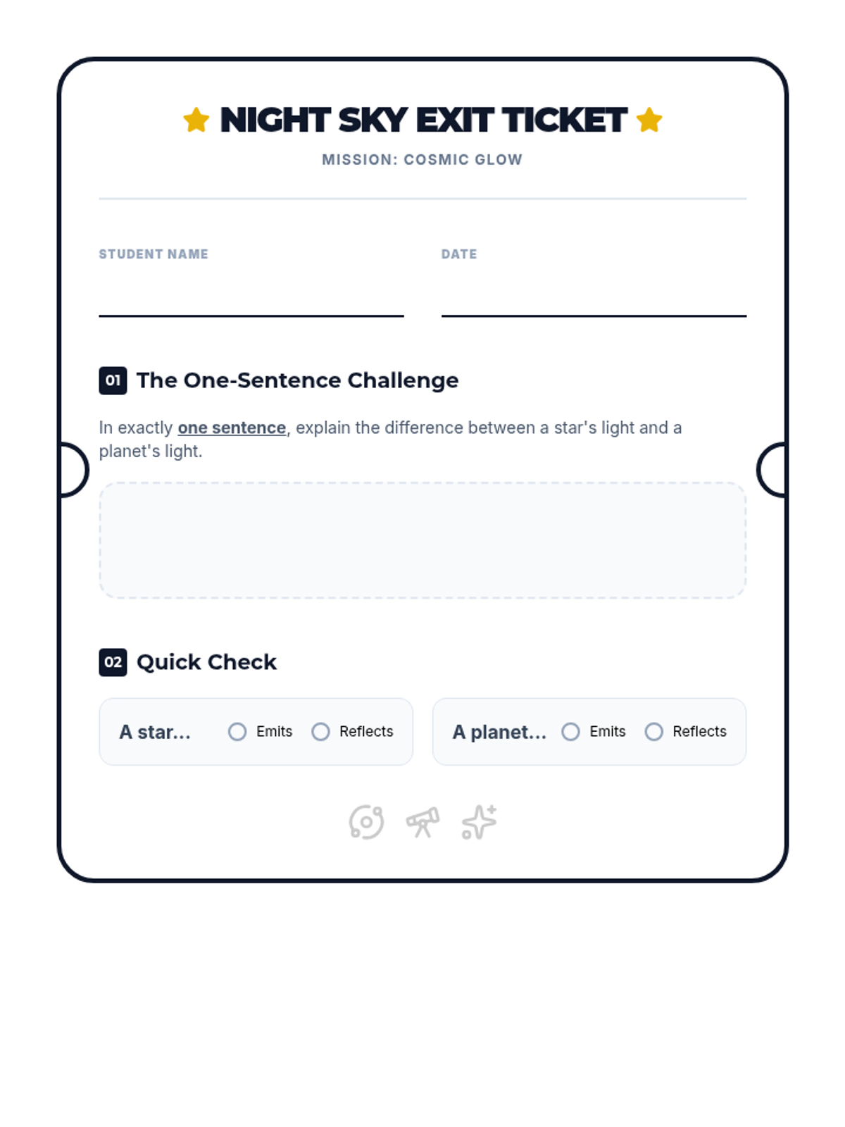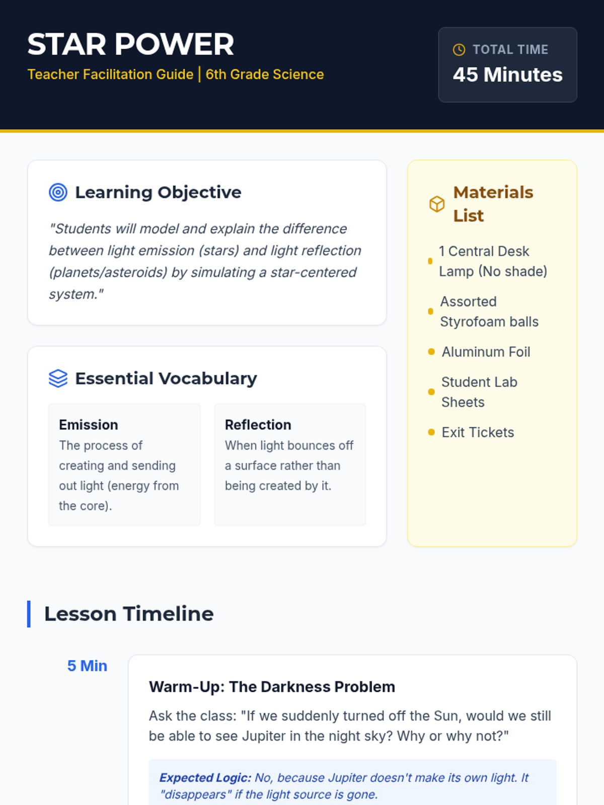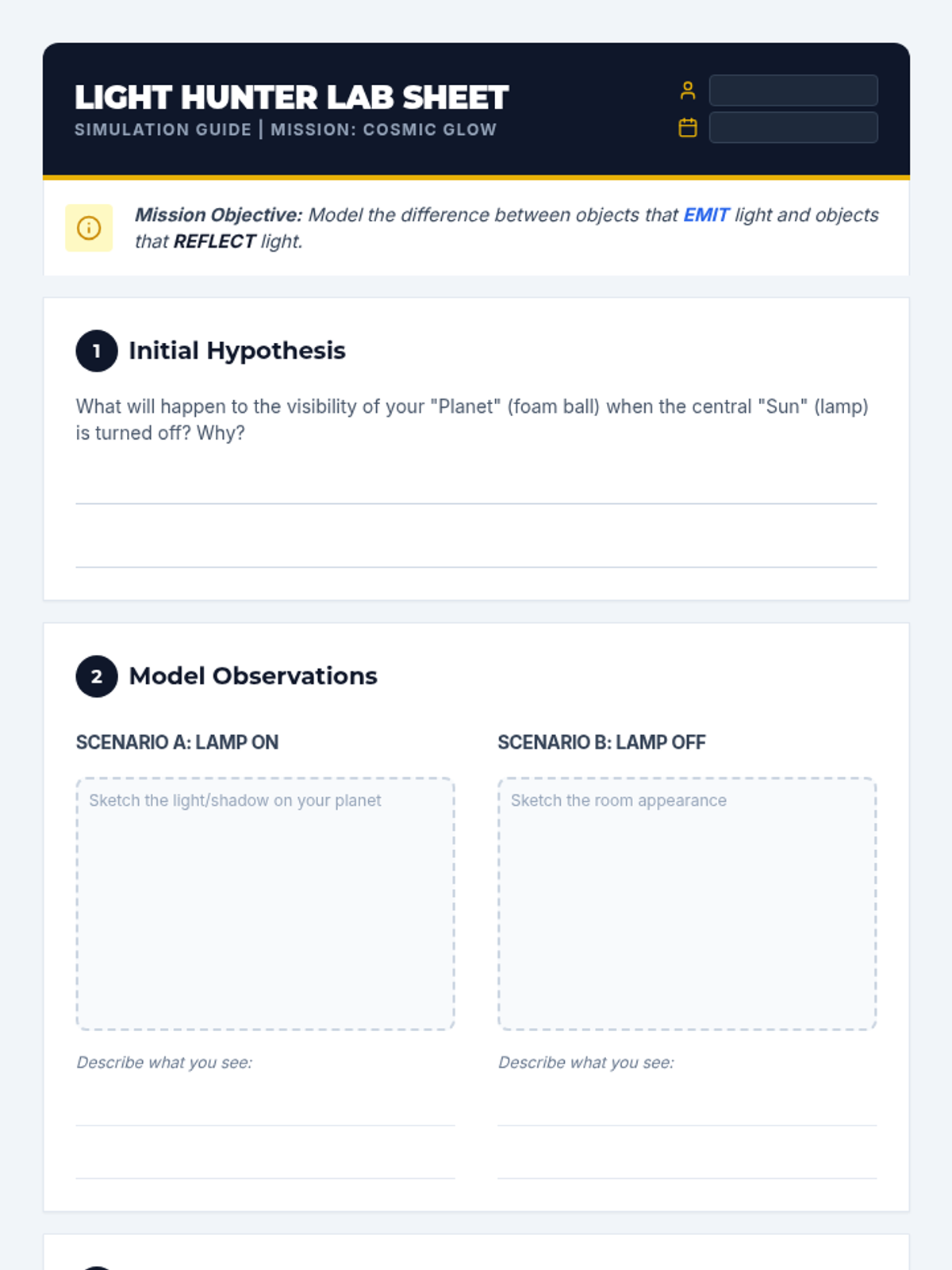 Students will investigate the fundamental difference between celestial objects that produce their own light (stars) and those that simply reflect it (planets and asteroids) through a video-based inquiry and a hands-on physical simulation.