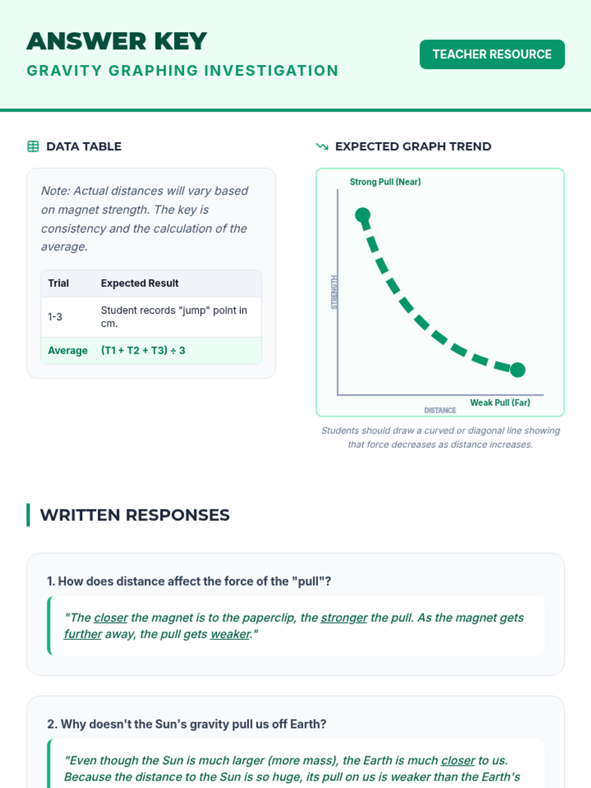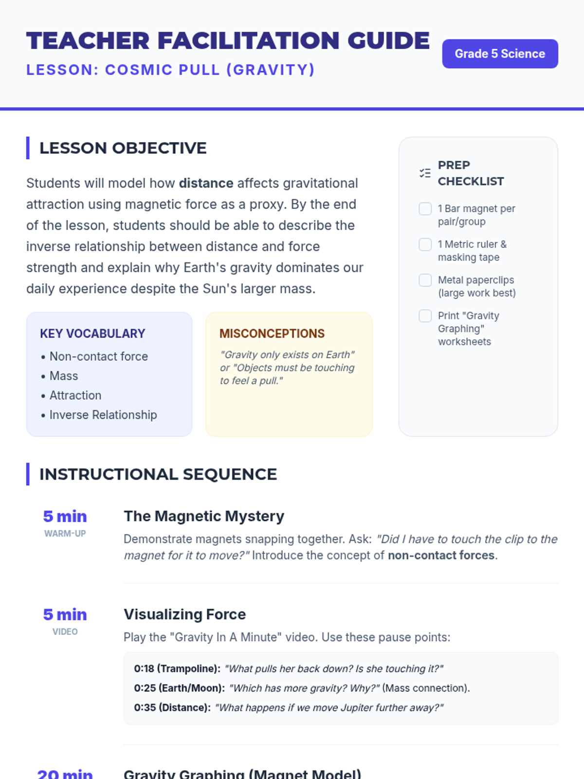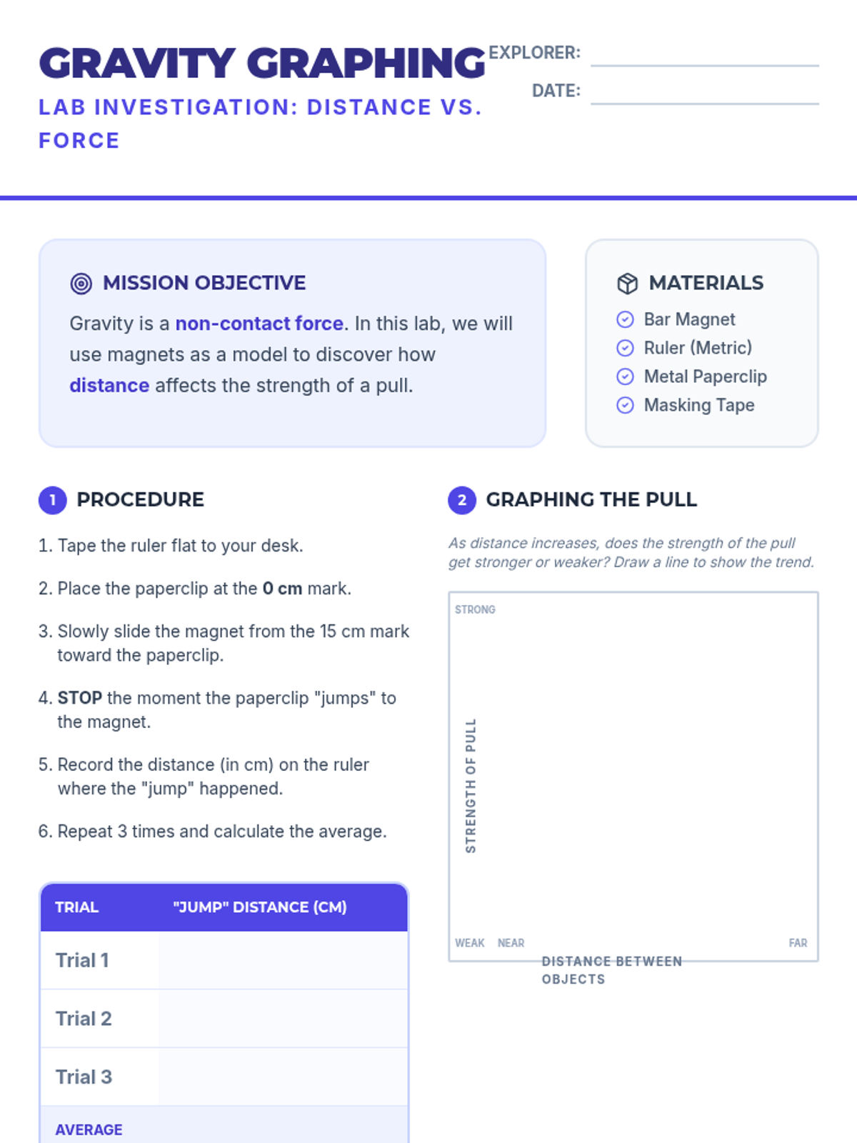 A 5th-grade science lesson exploring the relationship between distance and gravitational force through a hands-on magnetic simulation and planetary data analysis.