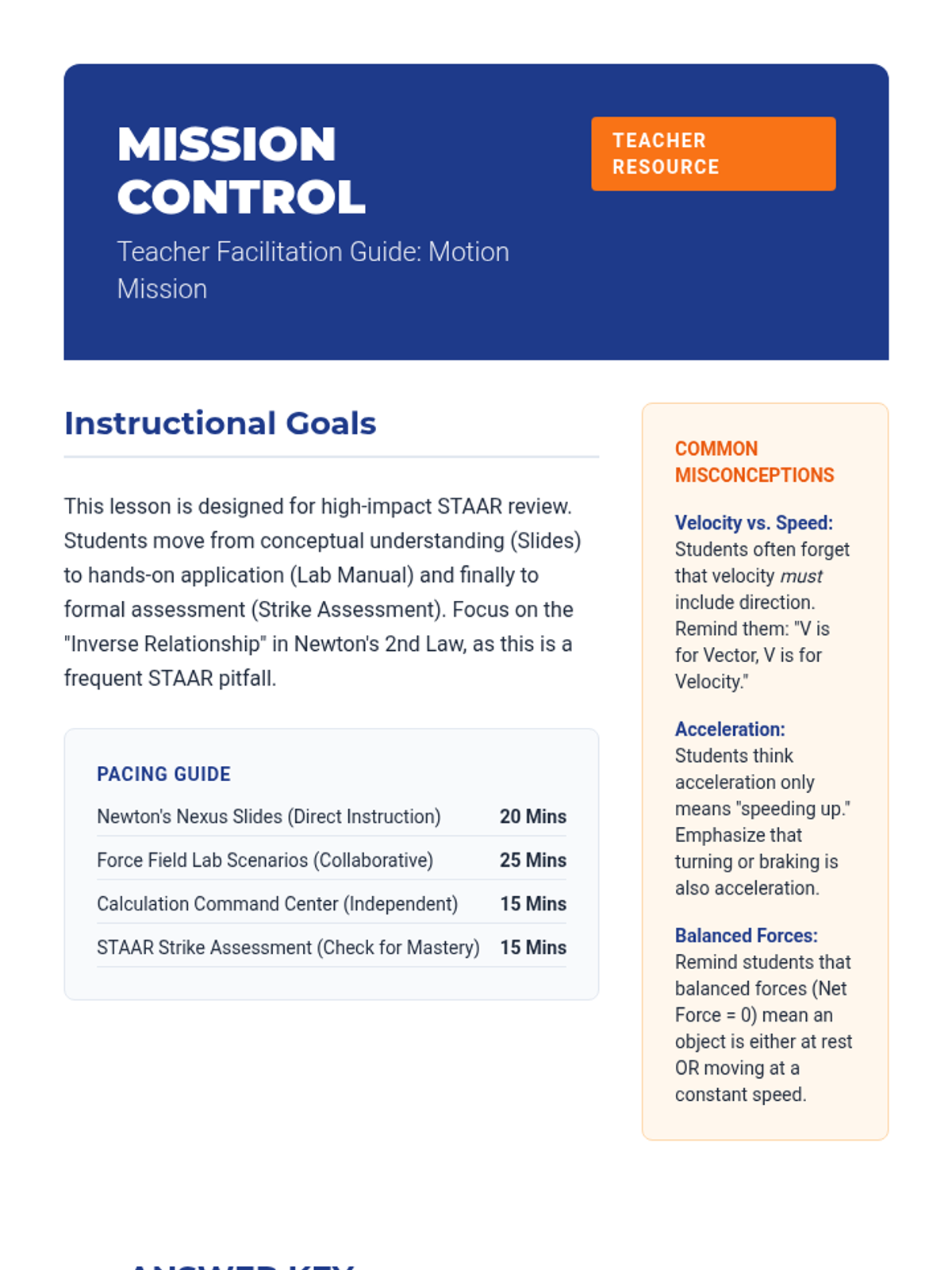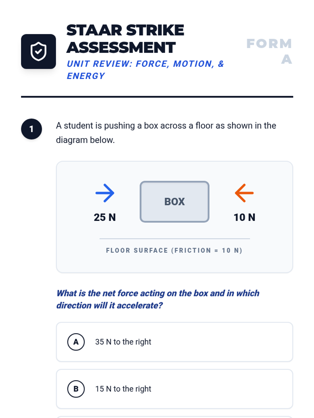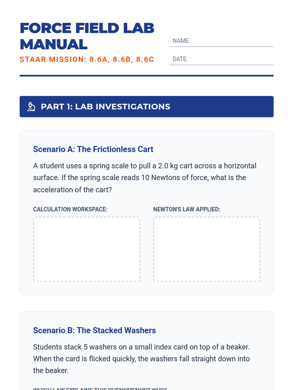 A comprehensive 8th-grade STAAR review lesson focusing on Newton's Laws, force, motion, and energy calculations. Students will engage with lab scenarios, visual models, and practice questions aligned to Texas TEKS 8.6A, 8.6B, and 8.6C.