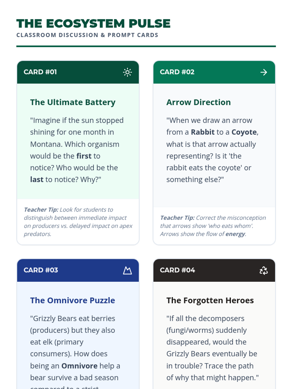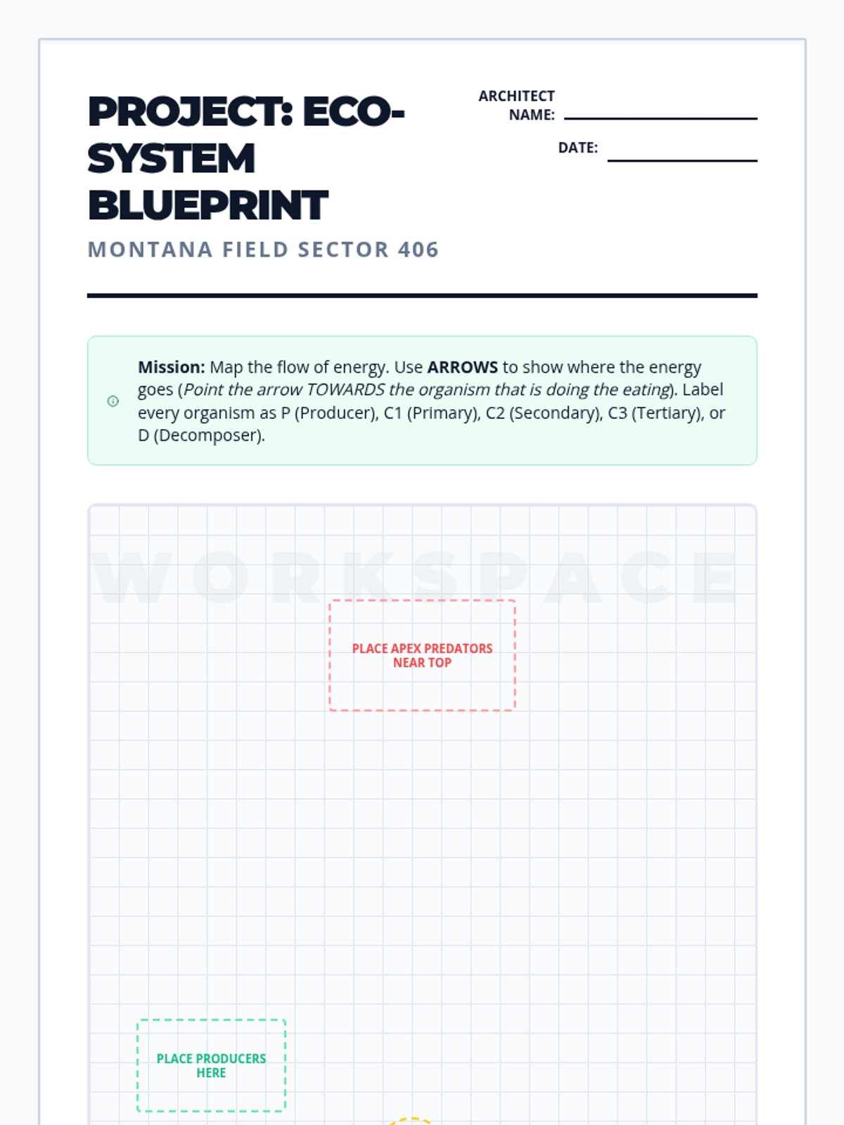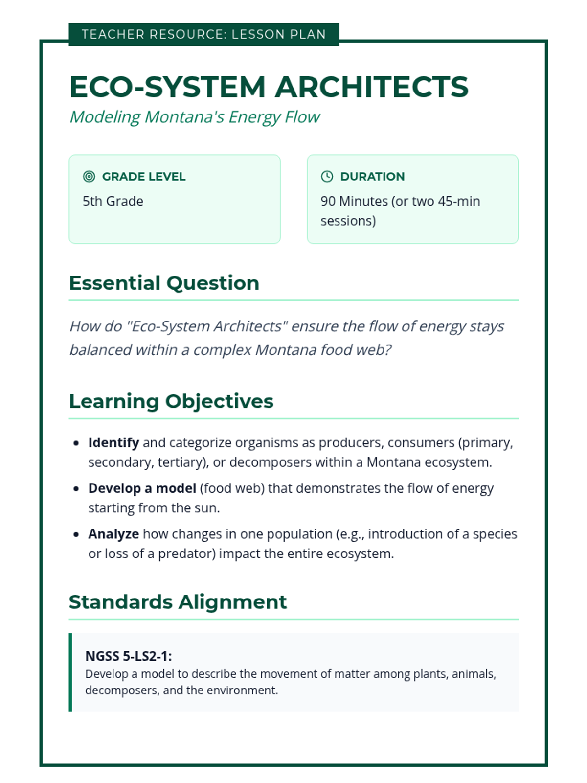 Fifth grade students act as environmental engineers to model energy flow in Montana ecosystems. They identify roles within food webs and predict the impacts of population changes on biological communities.