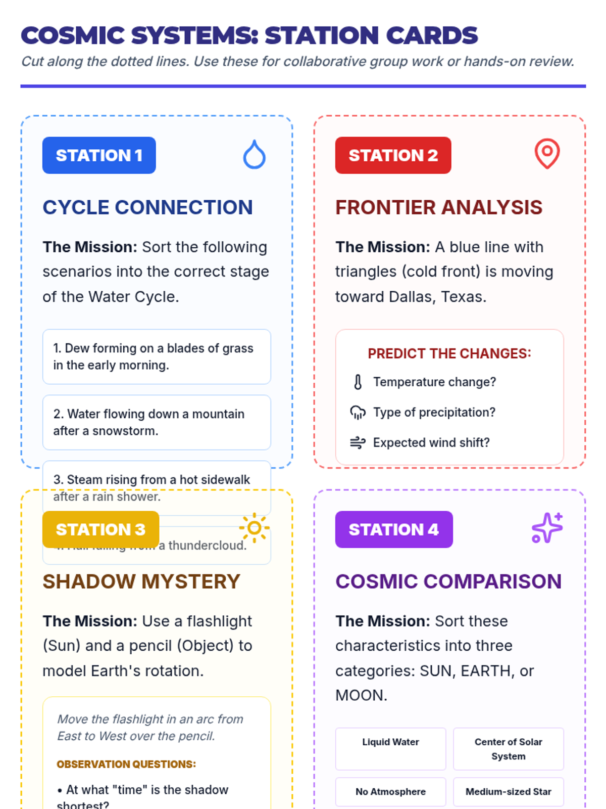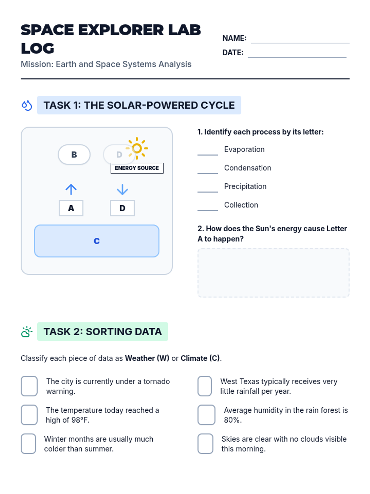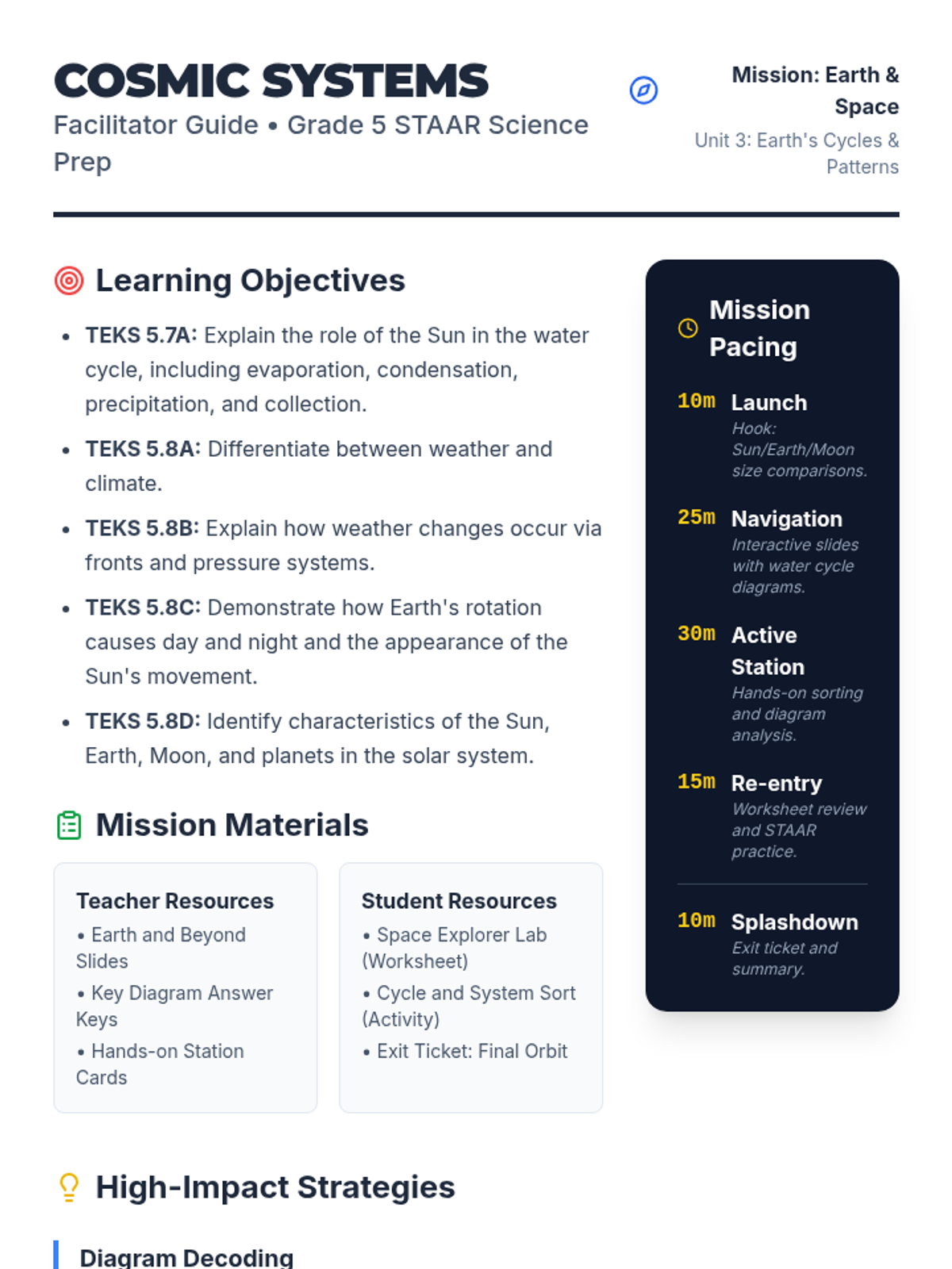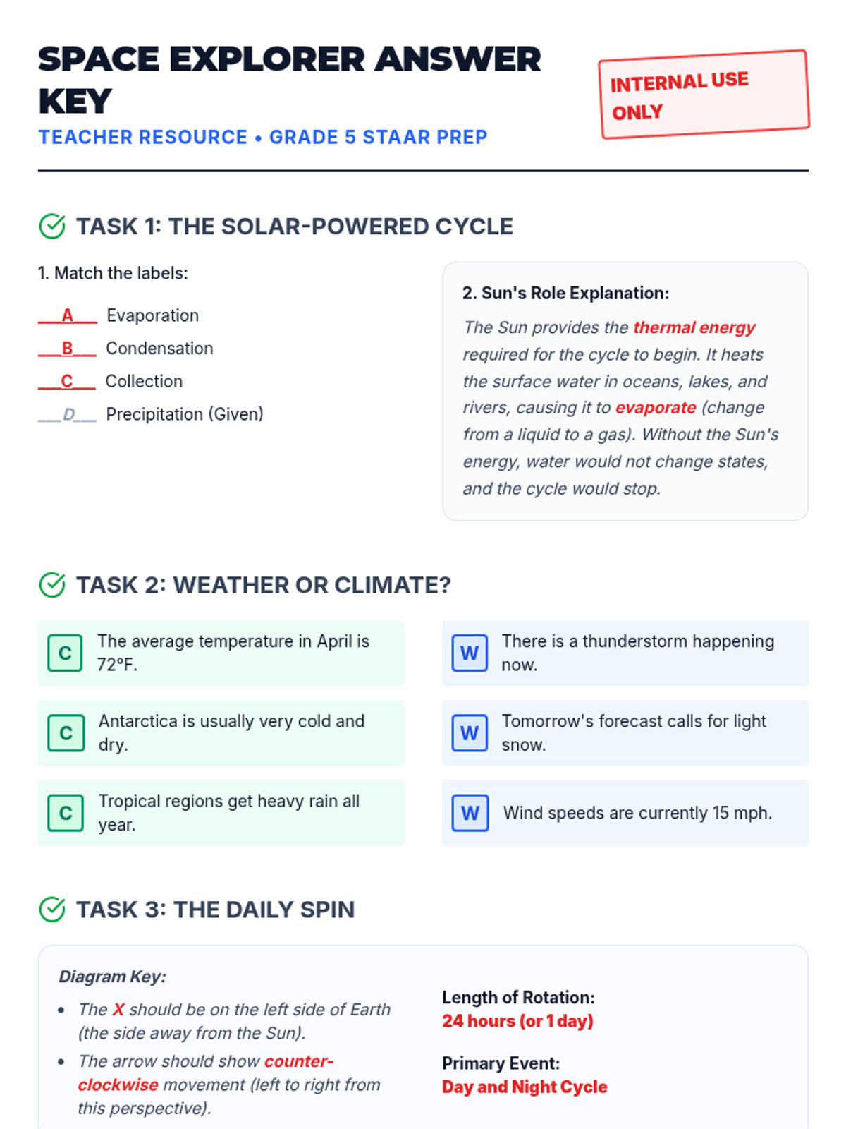 A comprehensive 5th grade STAAR Science prep lesson covering the water cycle, weather patterns, and the solar system through diagram analysis and hands-on review.
