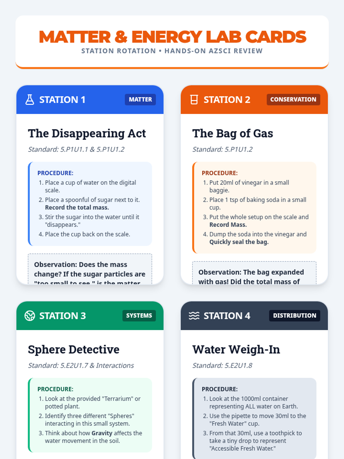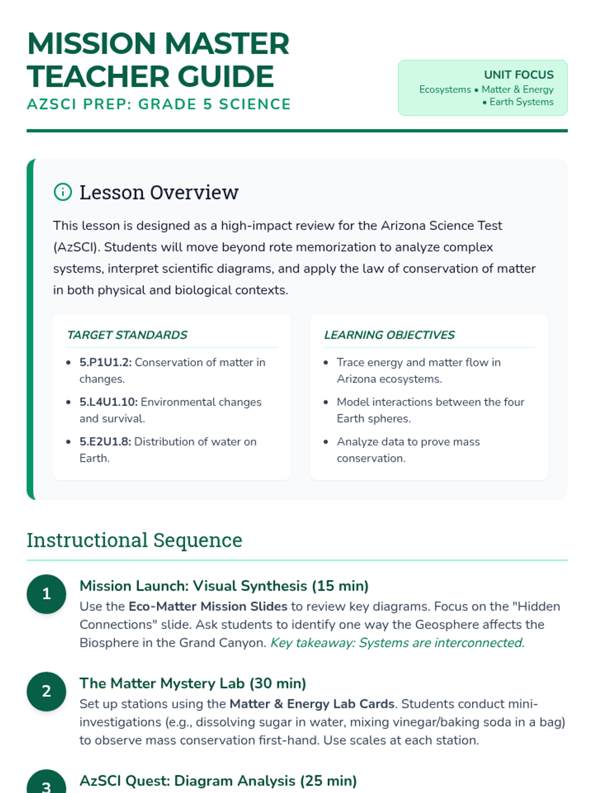 A comprehensive AzSCI prep lesson for 5th grade covering ecosystems, matter and energy, and Earth systems through diagram analysis and hands-on review.