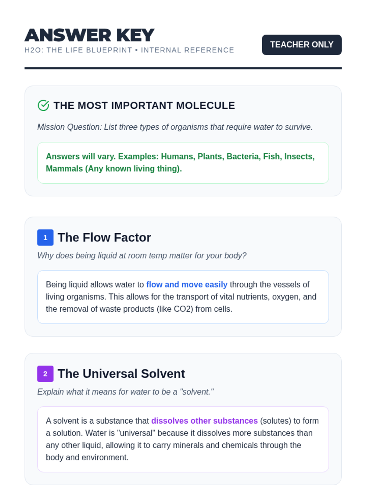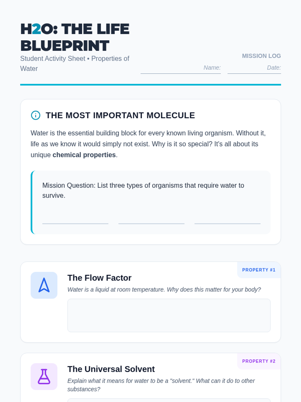 A dynamic lesson exploring the unique chemical properties of water and why it is the essential building block for all life on Earth.