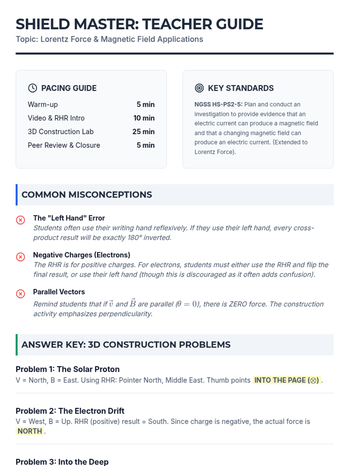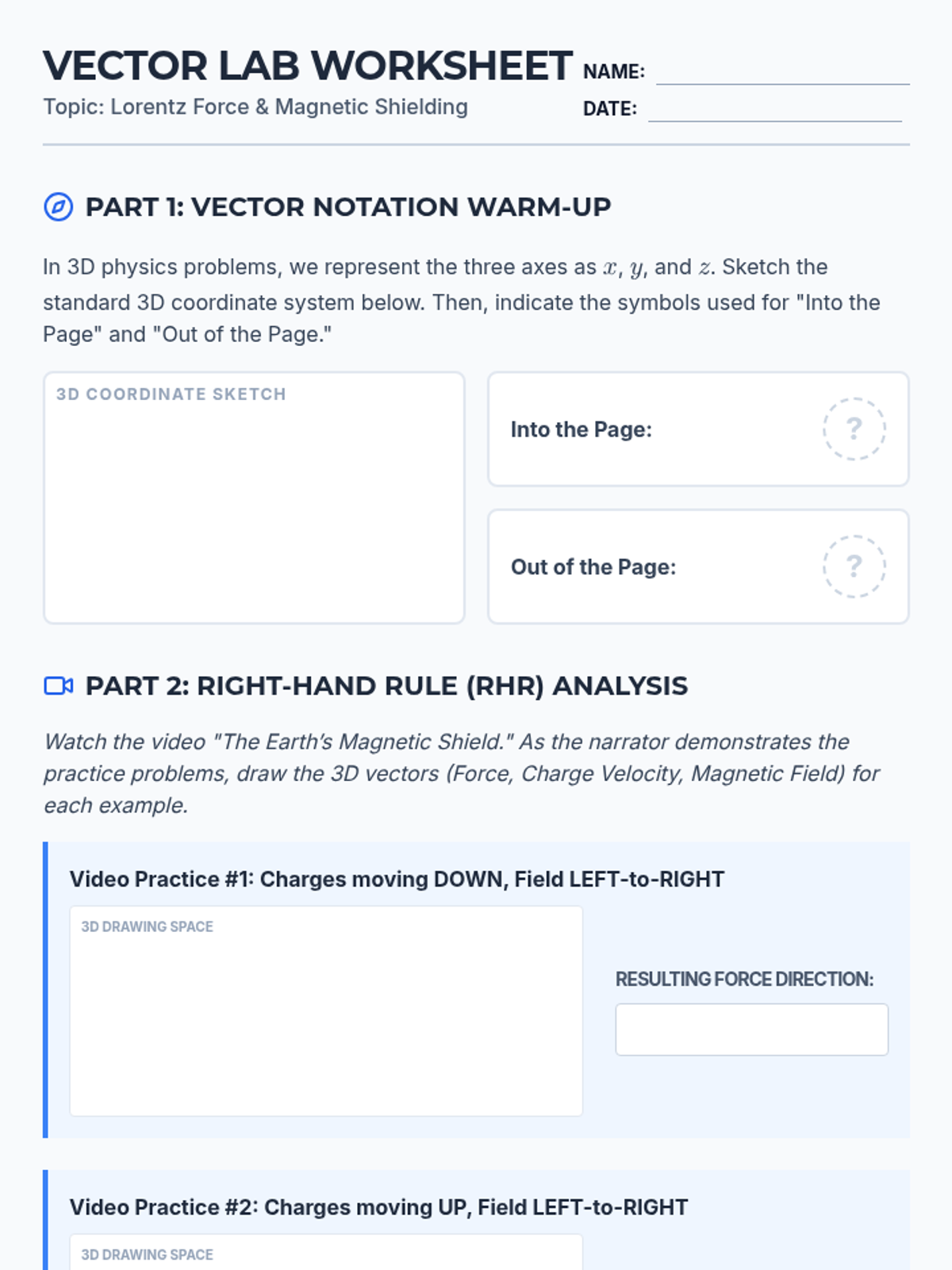 An advanced physics lesson focusing on the Lorentz Force and the Right-Hand Rule. Students analyze how Earth's magnetic field protects the planet from solar radiation through 3D vector modeling and video analysis.