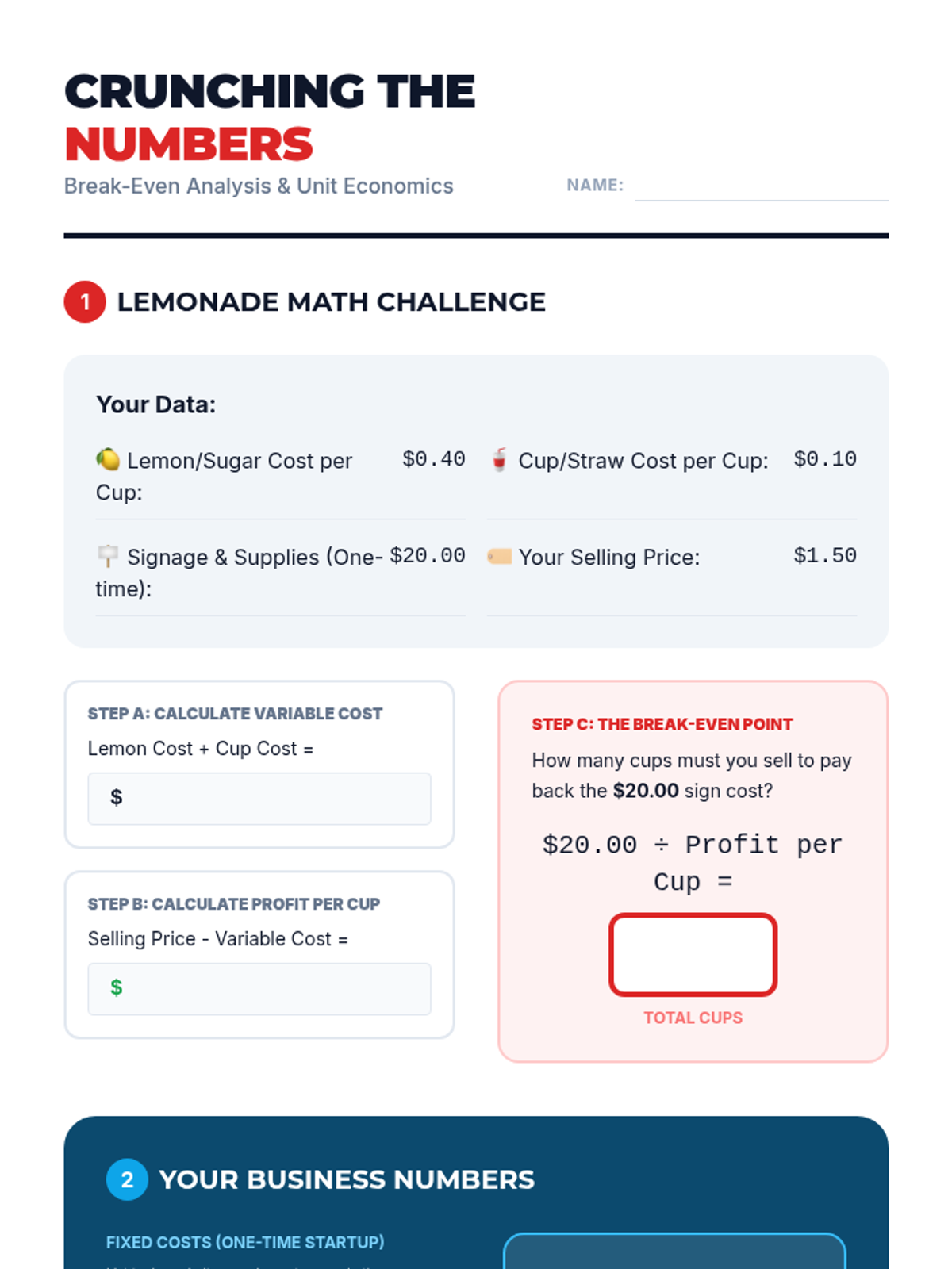 Students calculate unit economics and break-even points to understand the relationship between costs, prices, and profit.