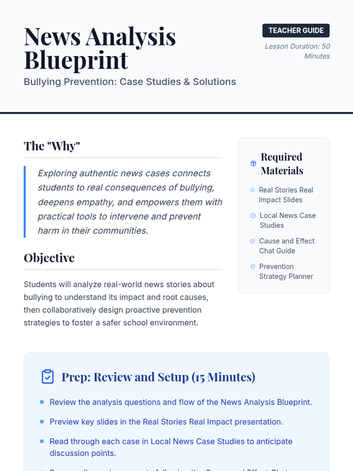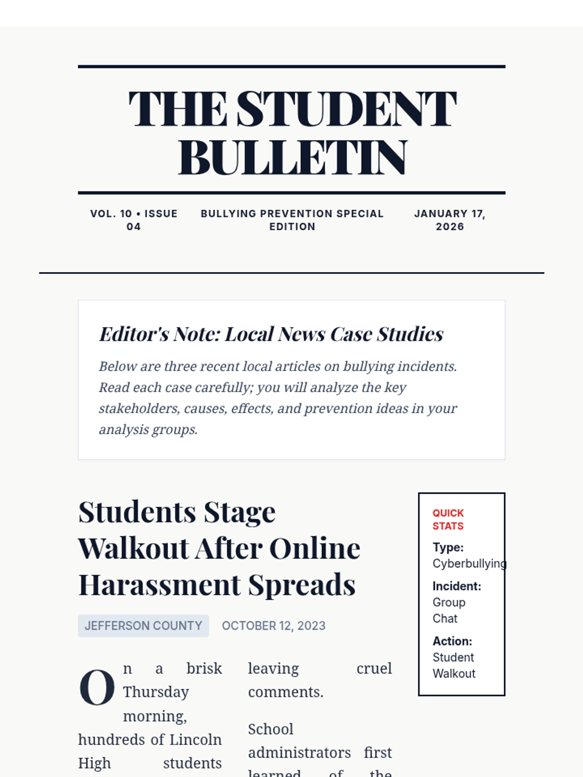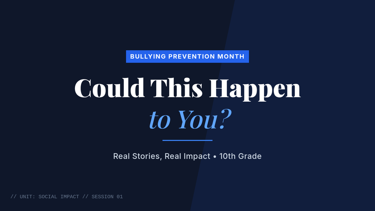 A Tier 1 bullying prevention lesson for 10th graders that uses authentic news stories to analyze the impact of bullying and develop proactive prevention strategies.