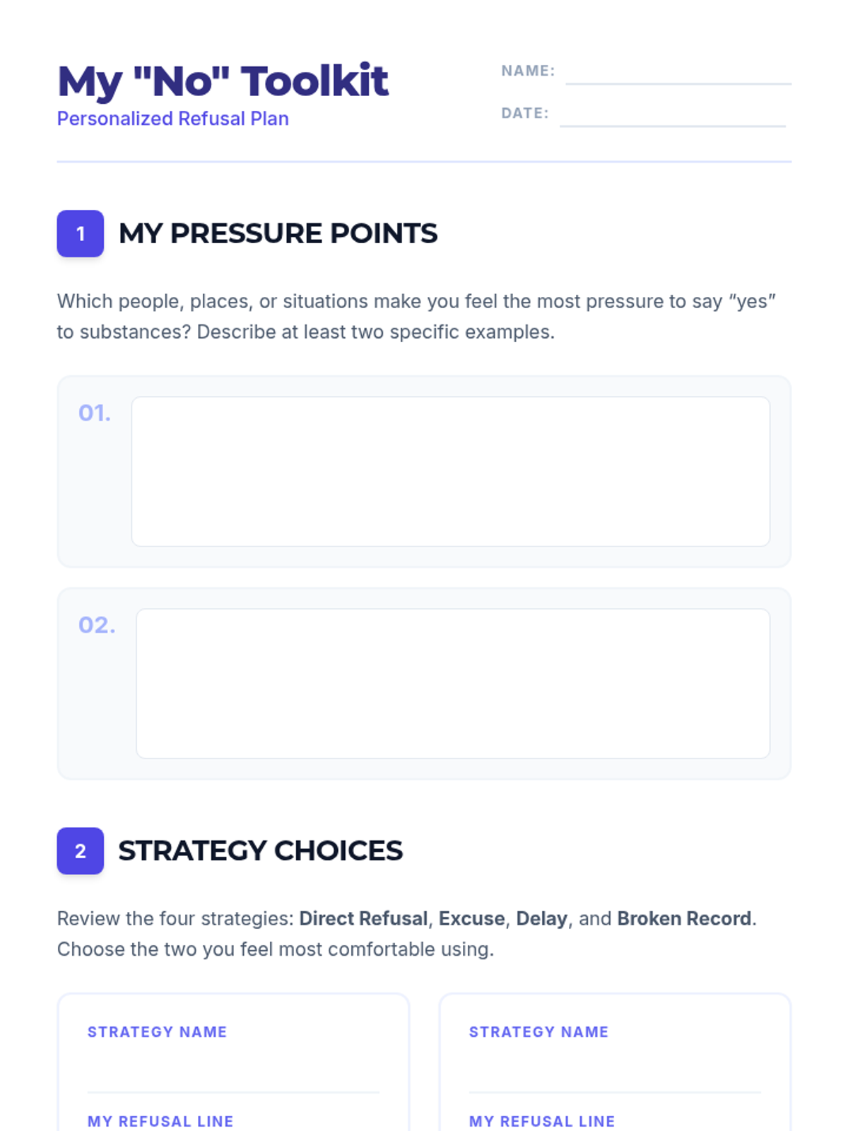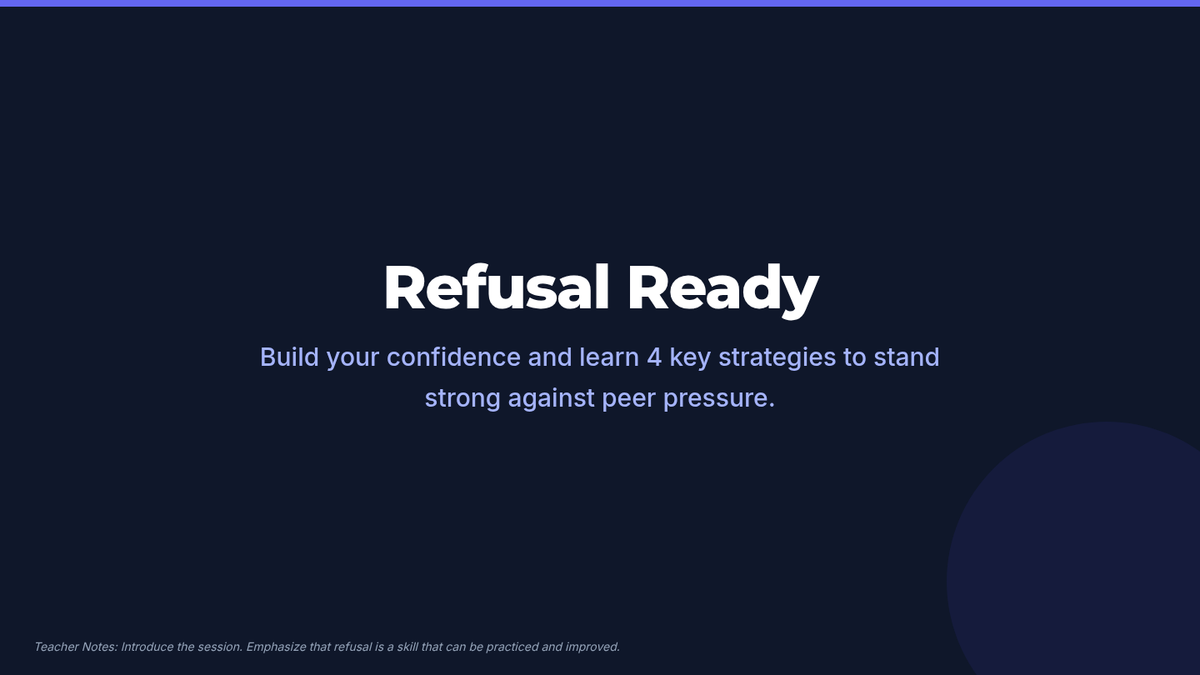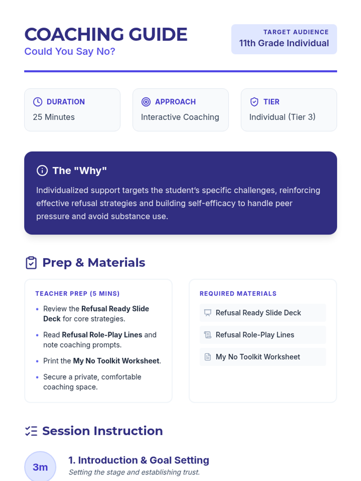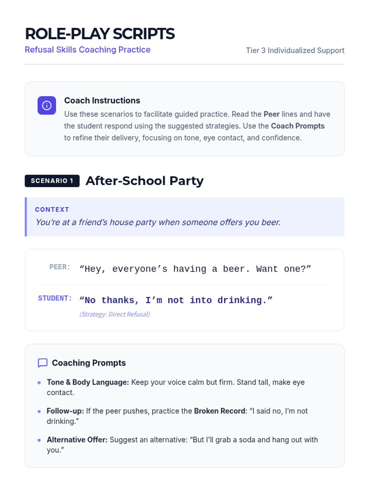 A Tier 3 individualized coaching session for 11th-grade students to build effective refusal skills against substance use peer pressure through role-play and personalized planning.