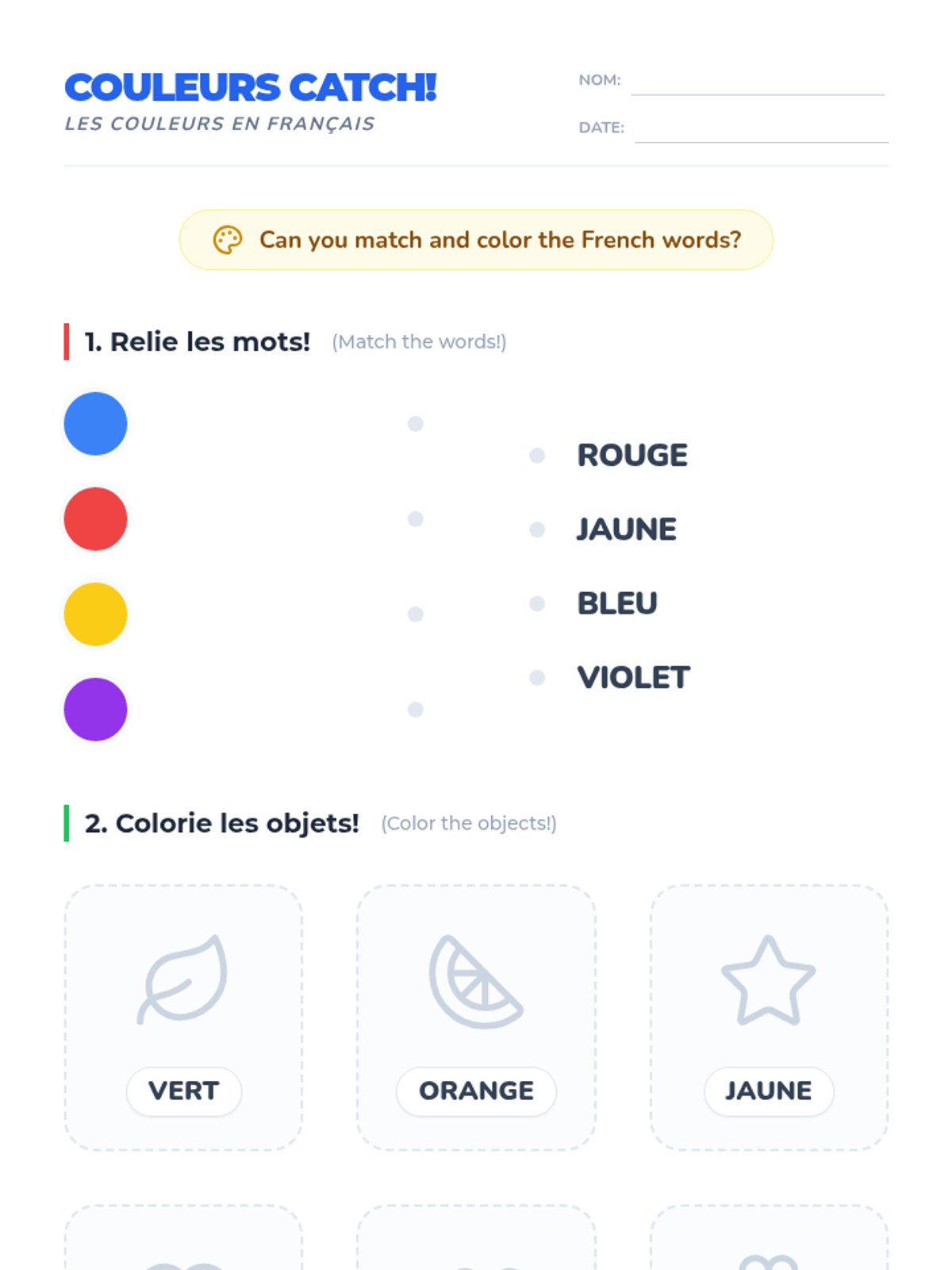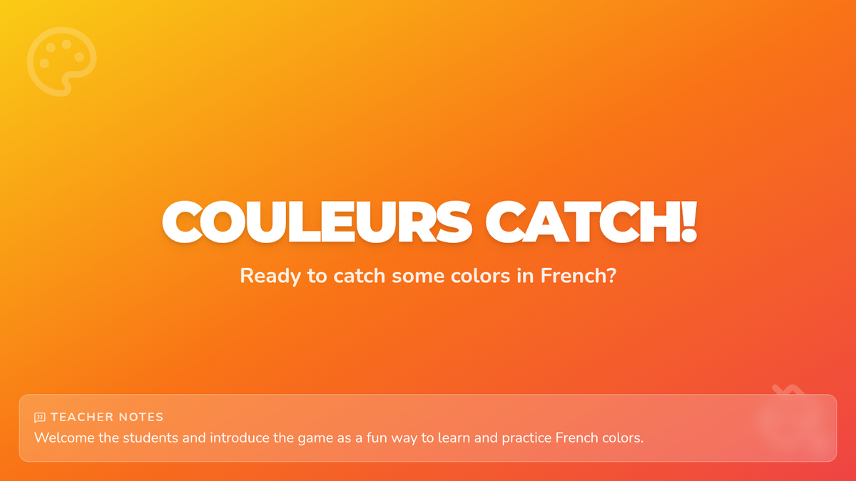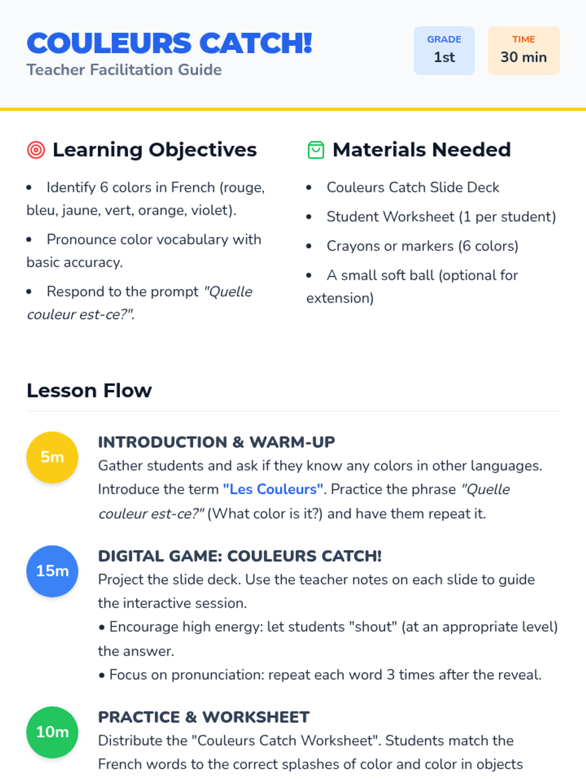 A high-energy 30-minute lesson where 1st graders learn French color vocabulary through an interactive "catch" game and visual matching activities.