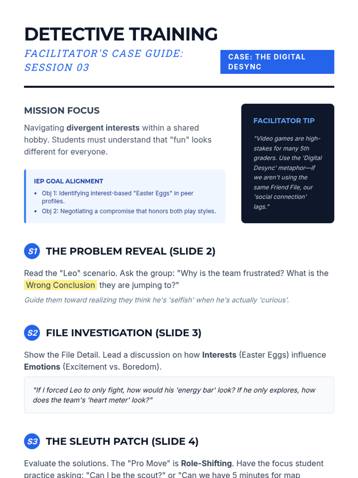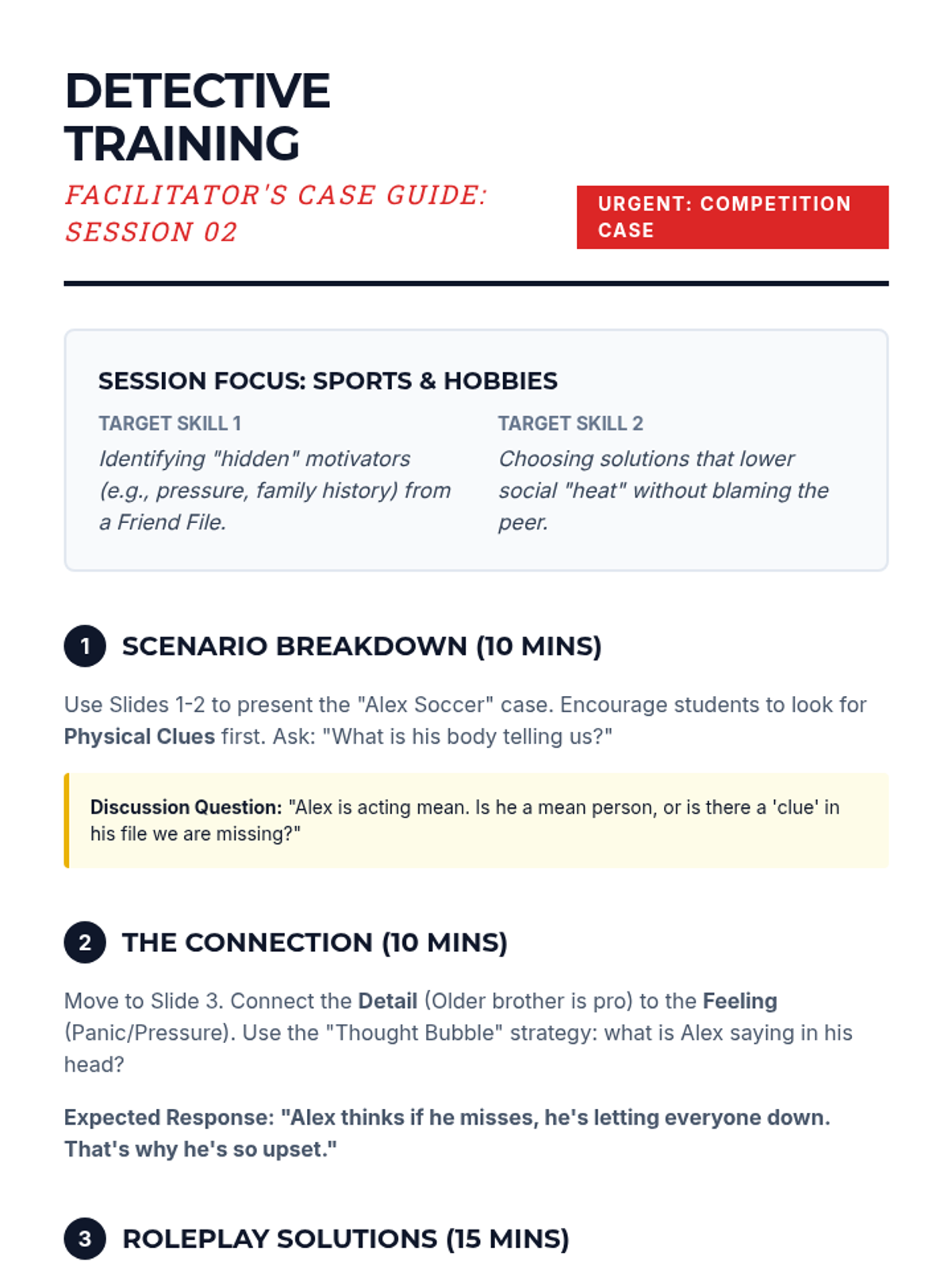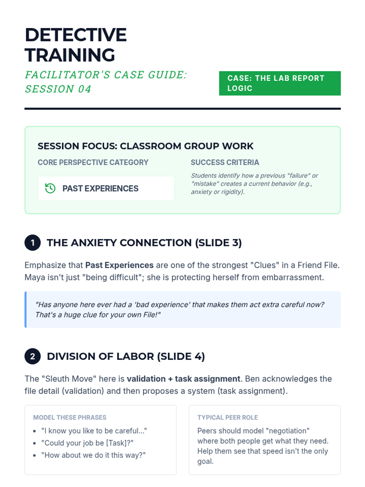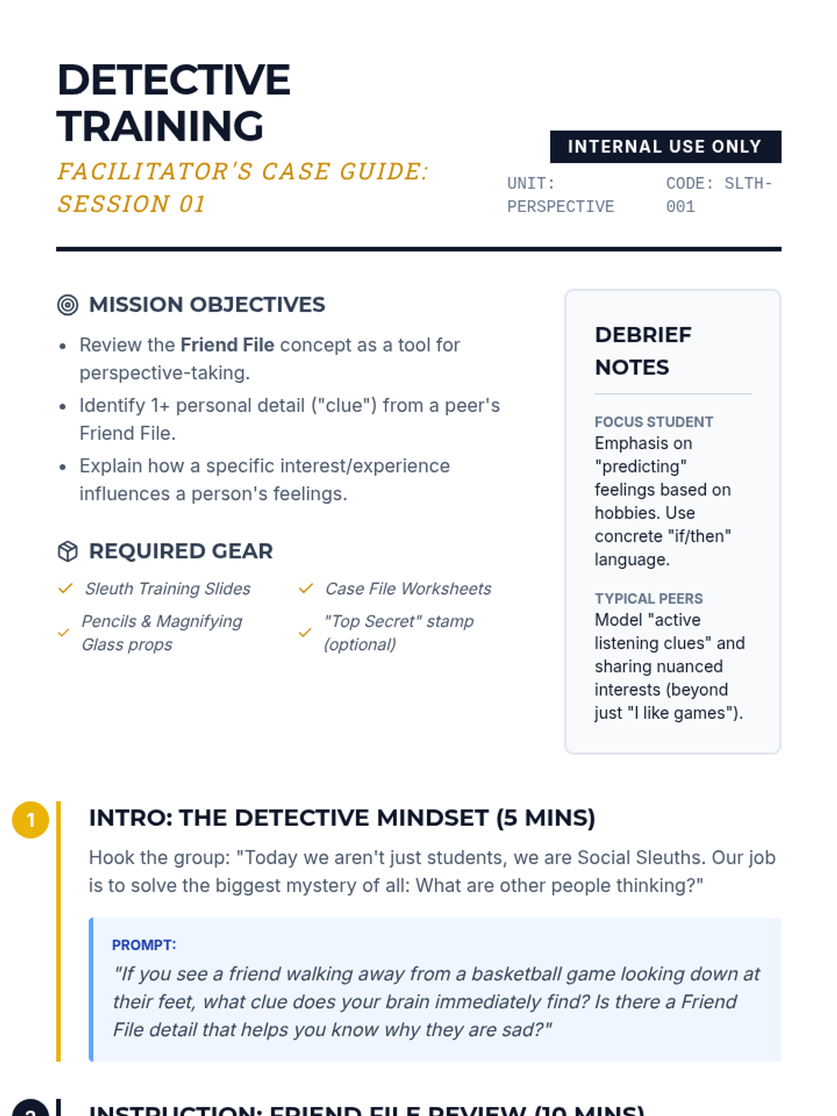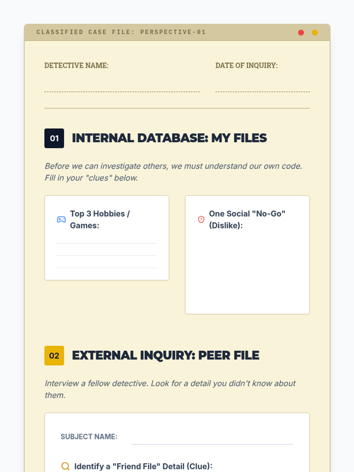 Introduction to the Detective's Tool: The Friend File. Students review how to collect 'clues' about peers and understand that everyone has a unique mental file that influences their reactions.