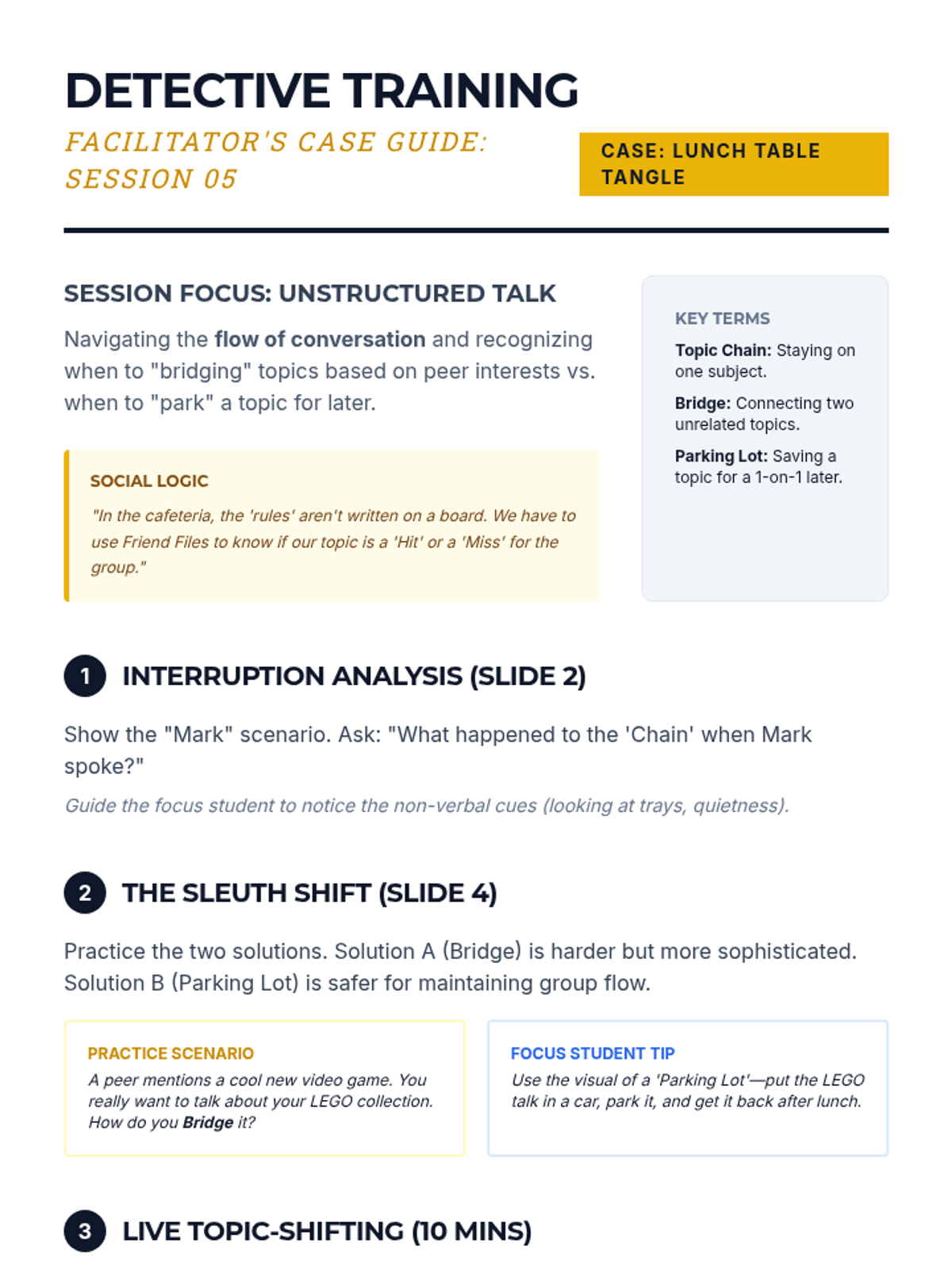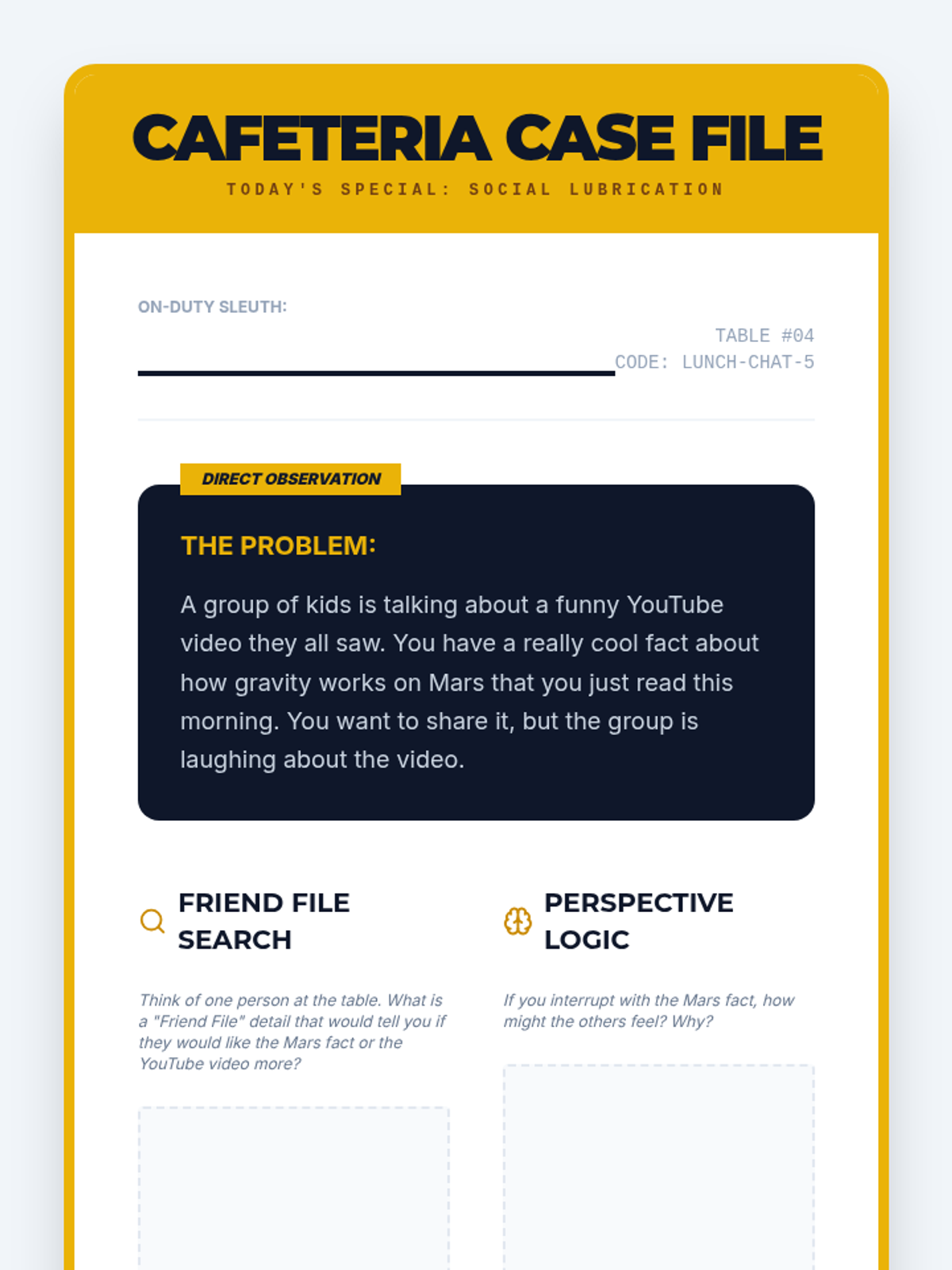 Mastering the unstructured social environment of the cafeteria. Students practice using Friend Files to navigate lunchroom talk, identifying when to shift topics based on peer interest clues.