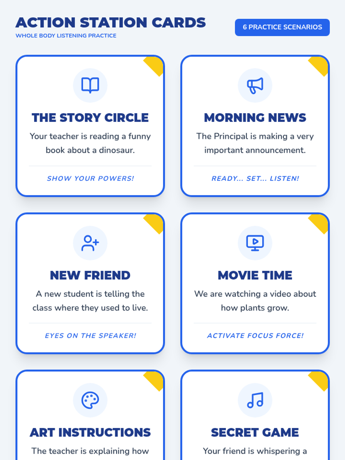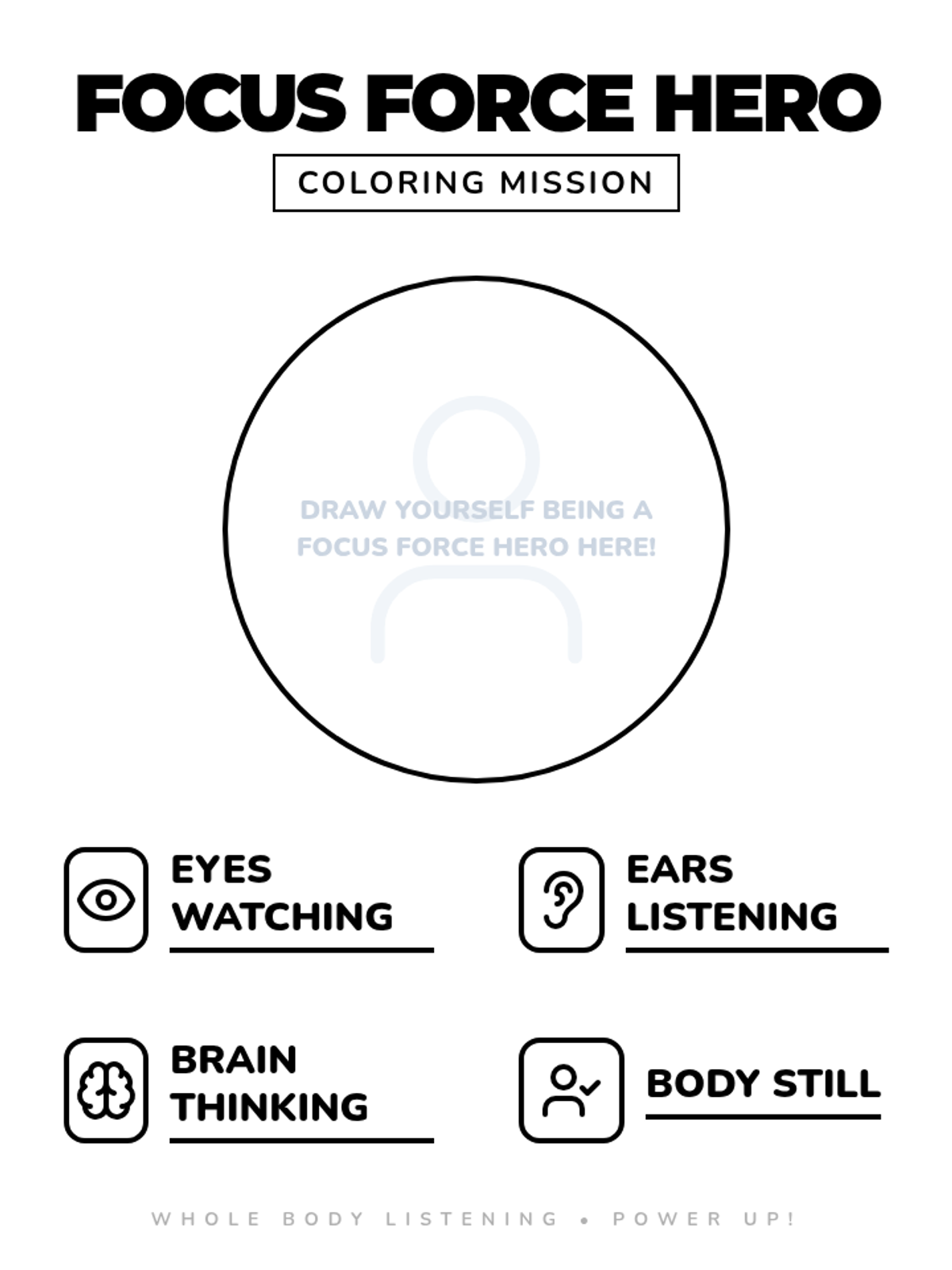 A quick 15-minute lesson focusing on the four pillars of whole-body listening: eyes watching, ears listening, brain thinking, and a still body. Includes visual slides, hands-on practice, and creative reinforcement.