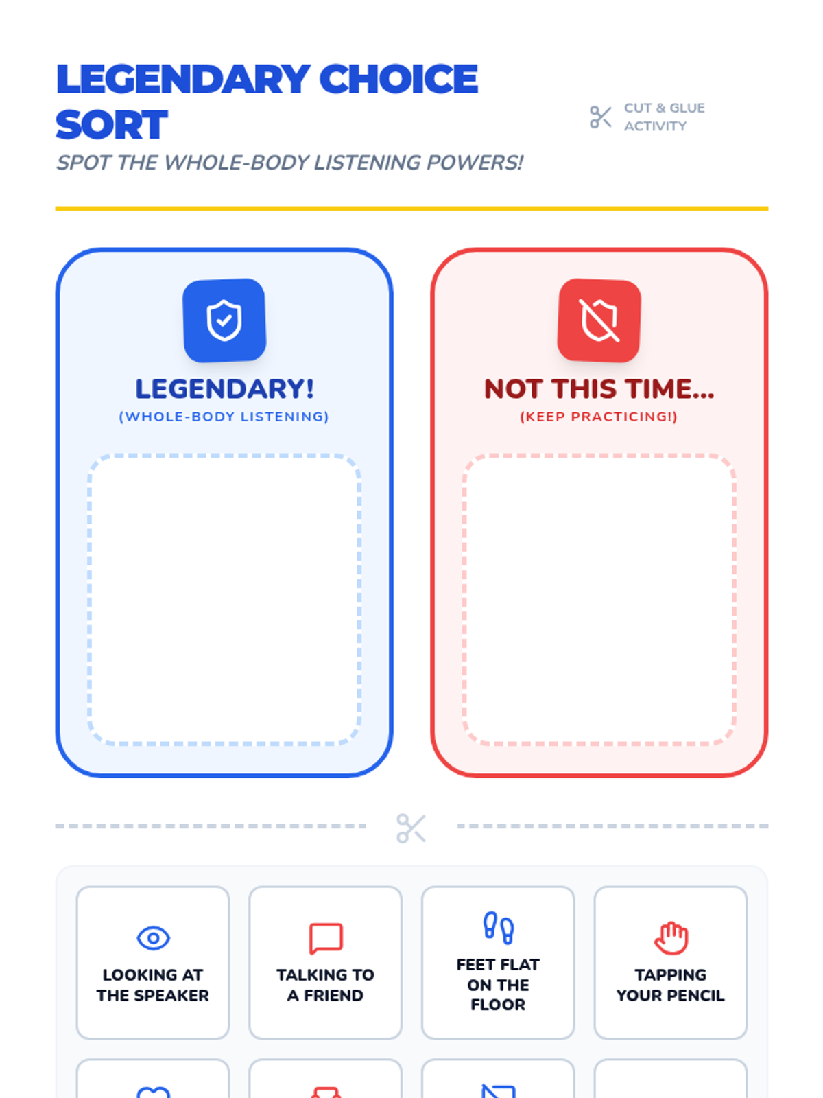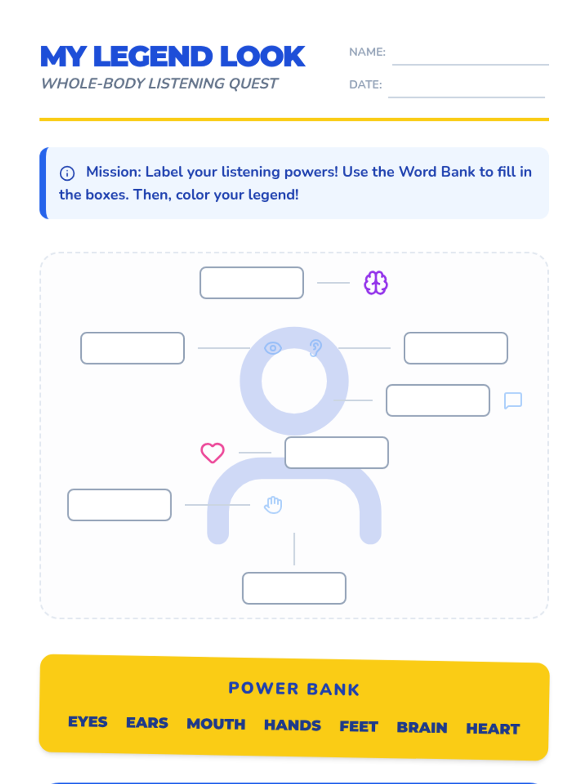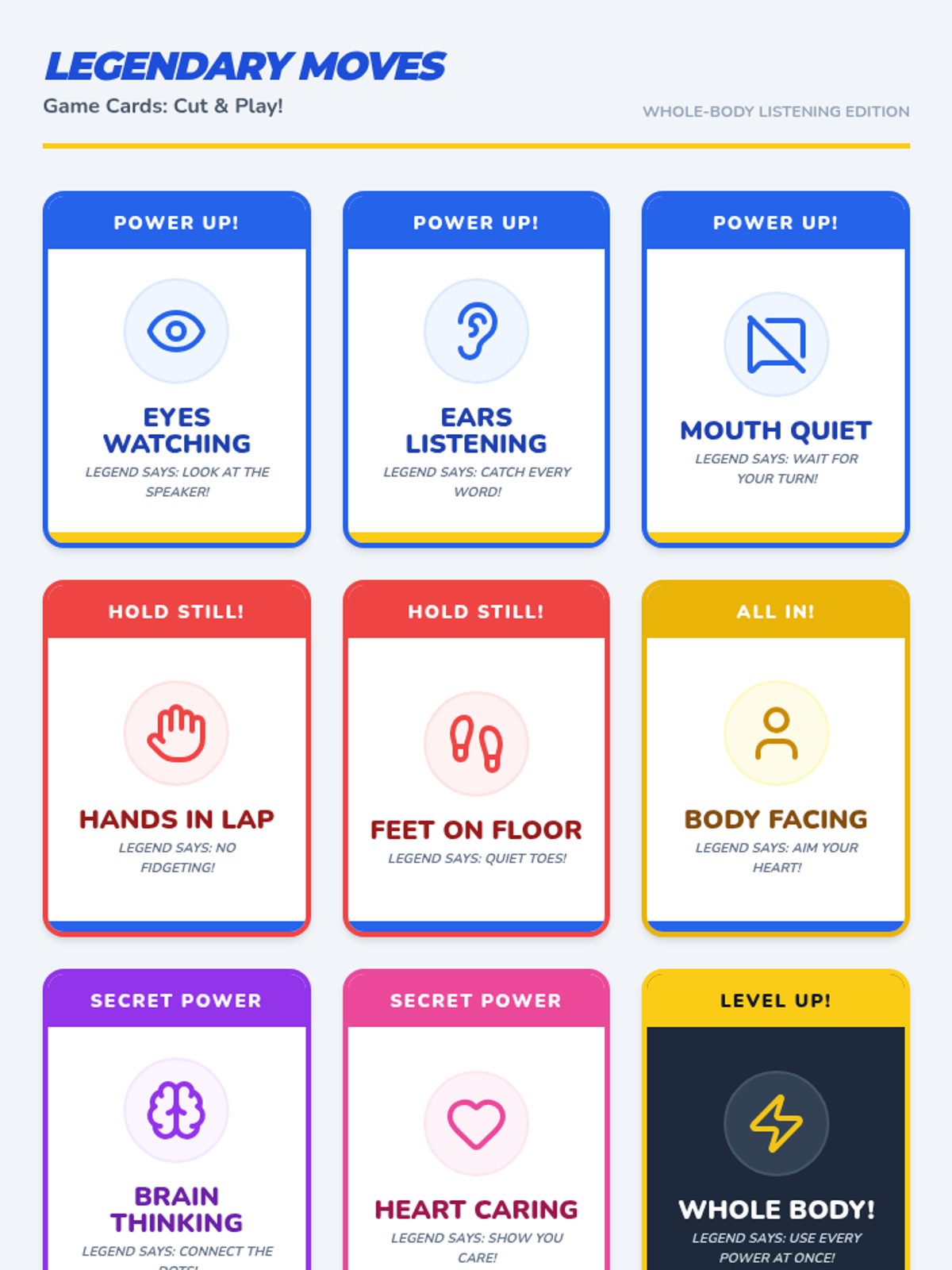 A playful, superhero-themed lesson for K-2 students to master 'whole-body listening.' Students will discover how their eyes, hands, feet, and hearts help them become legendary listeners through movement, visuals, and interactive play.