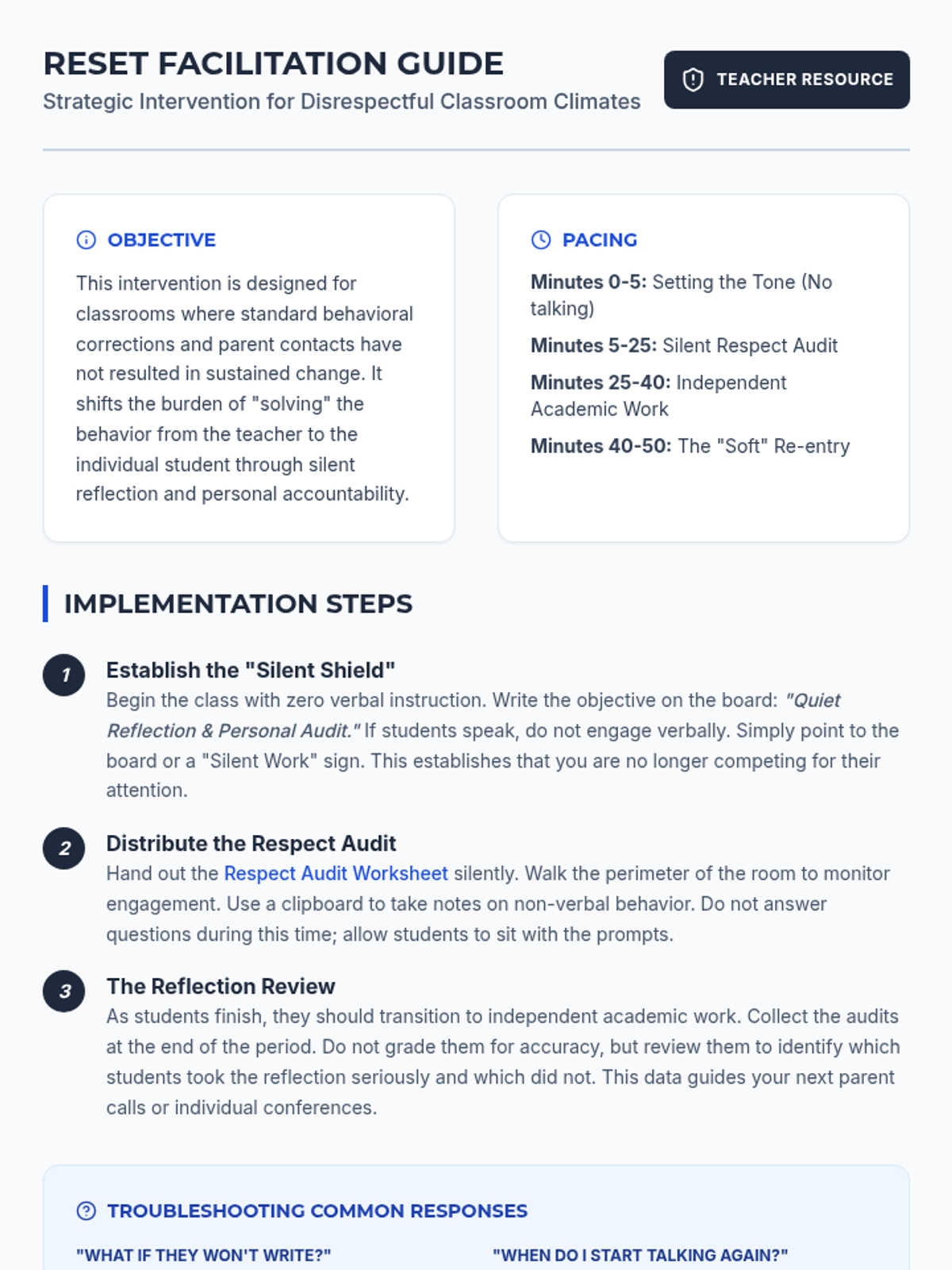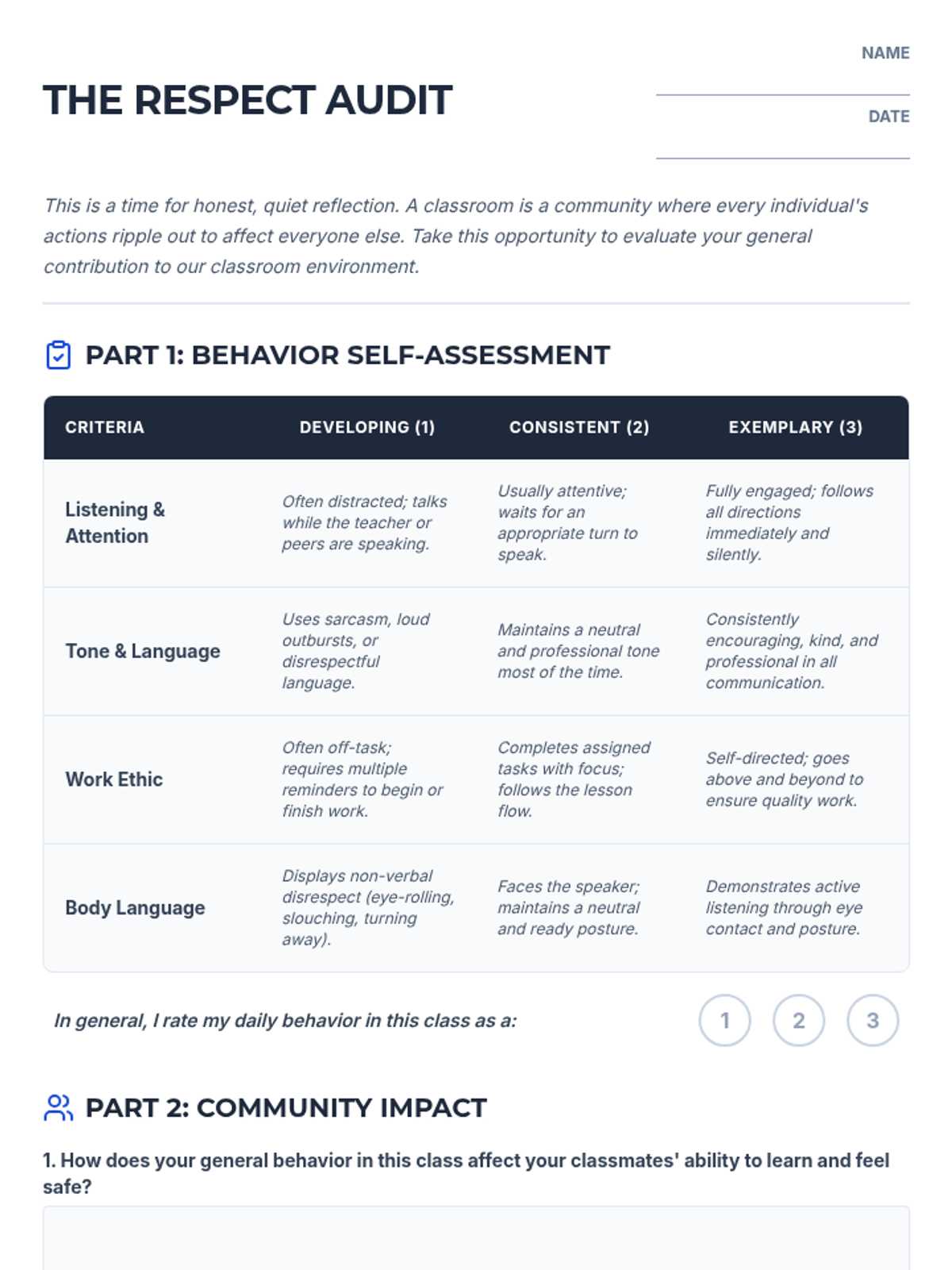 A self-guided reflection lesson designed to help students evaluate their behavior, understand its impact on the classroom community, and set concrete goals for improvement.