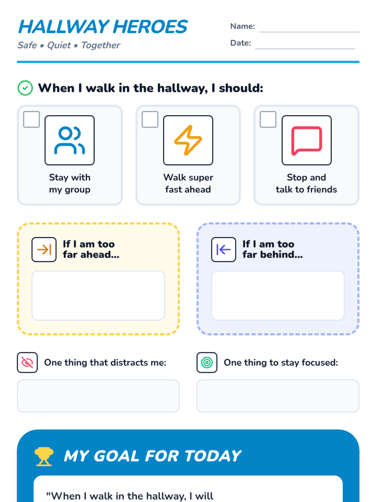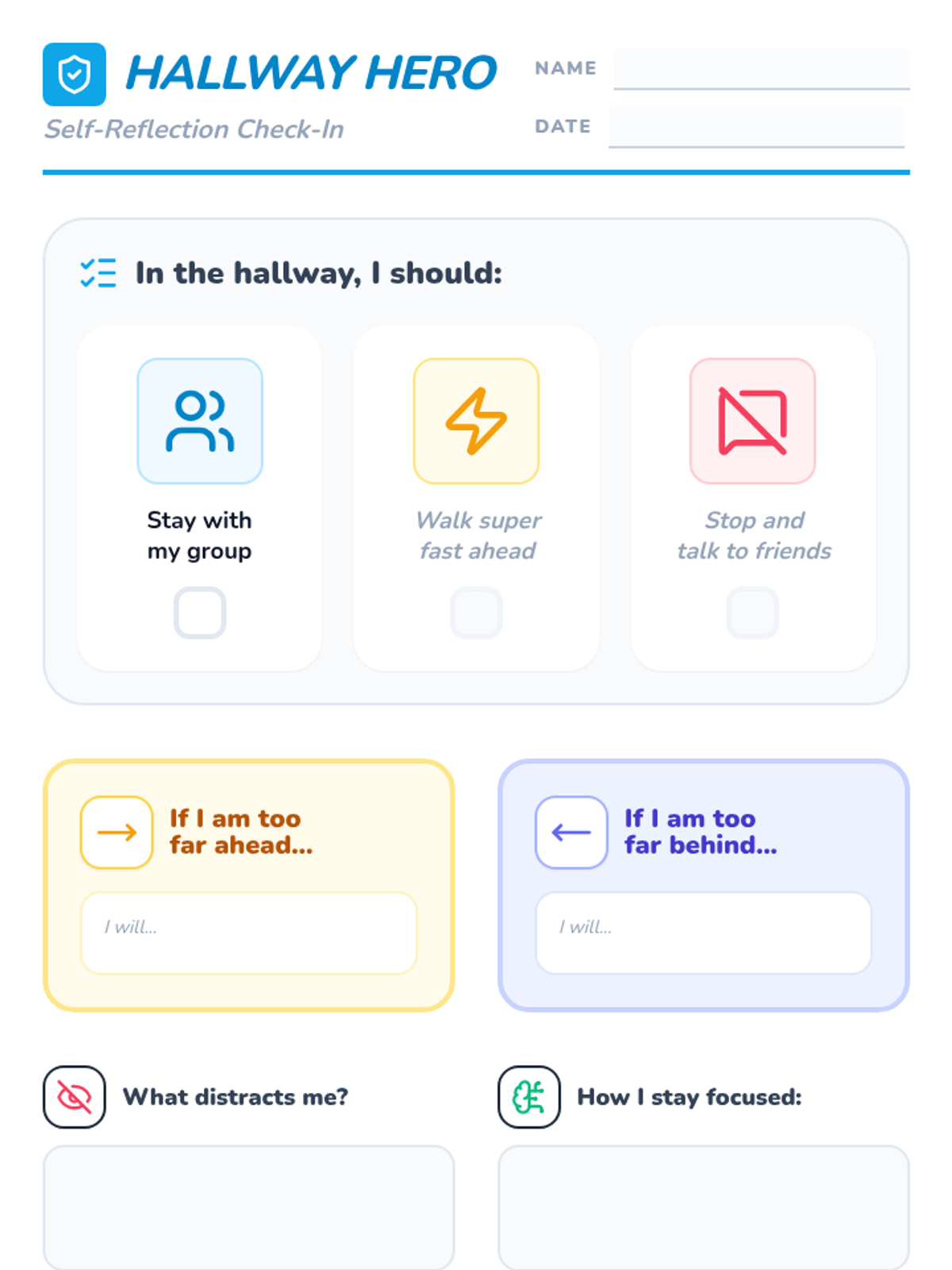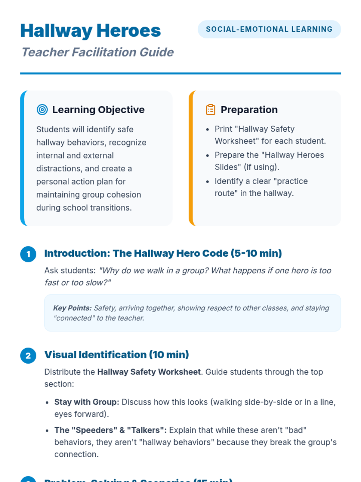 A social-emotional learning lesson focused on hallway safety, group cohesion, and self-regulation during transitions. Includes a visual self-reflection worksheet and a teacher facilitation guide.