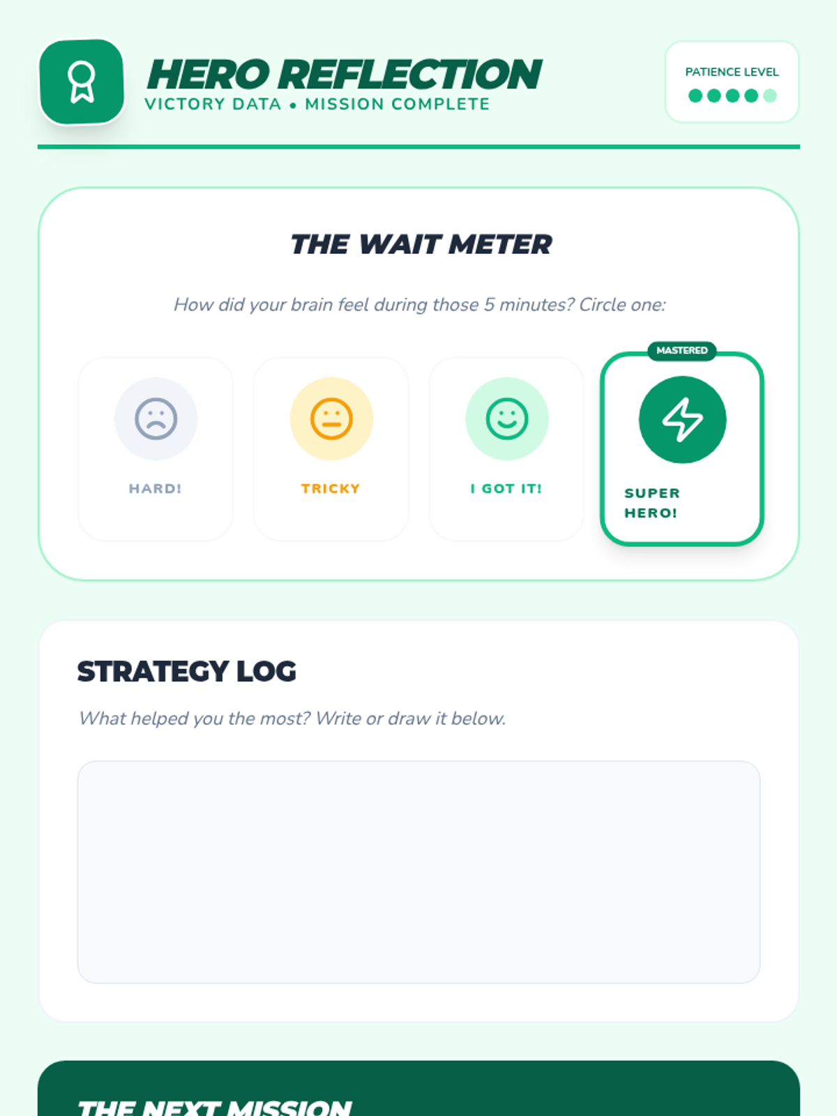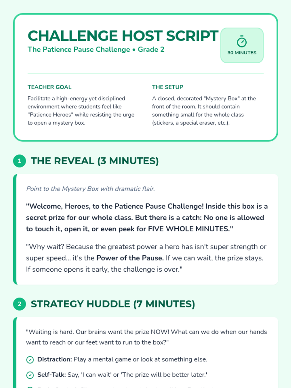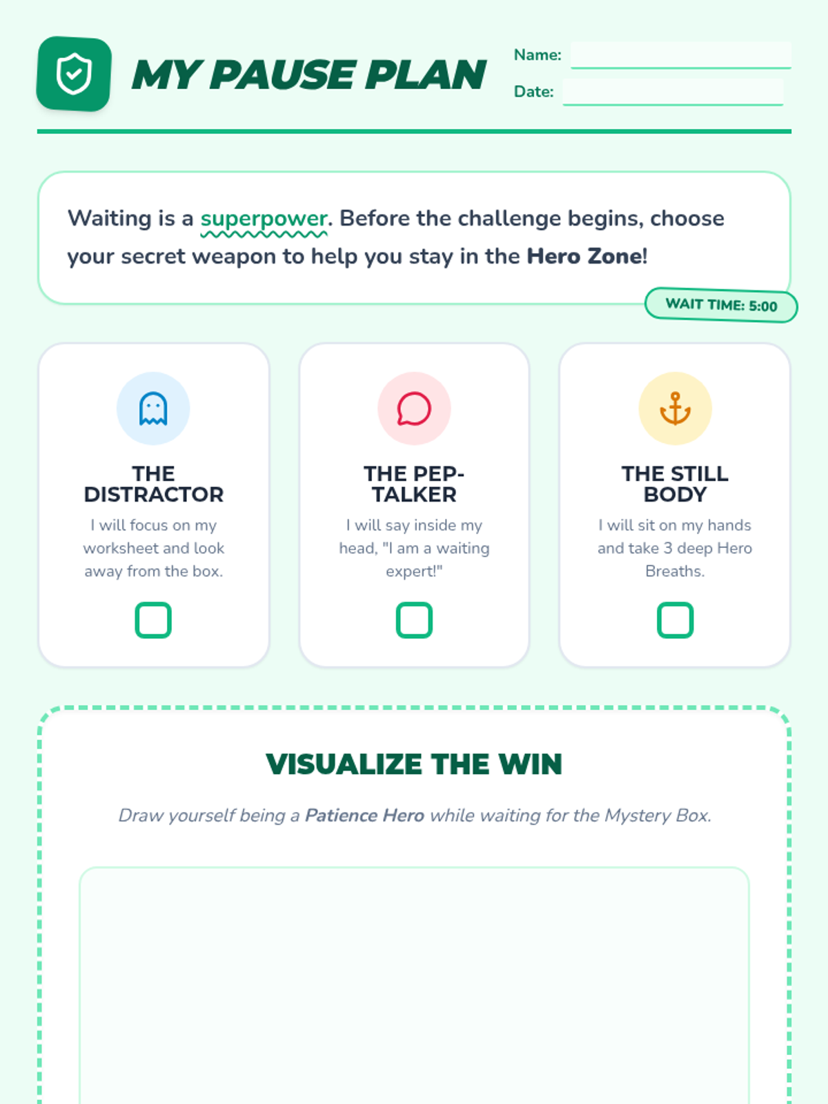 A 30-minute social-emotional learning lesson where students practice the 'superpower' of waiting. Students will develop strategies for delayed gratification, test their self-control with a mystery box challenge, and reflect on their emotional journey.