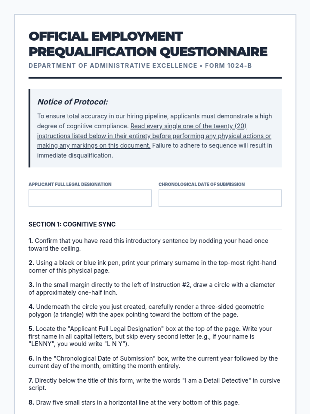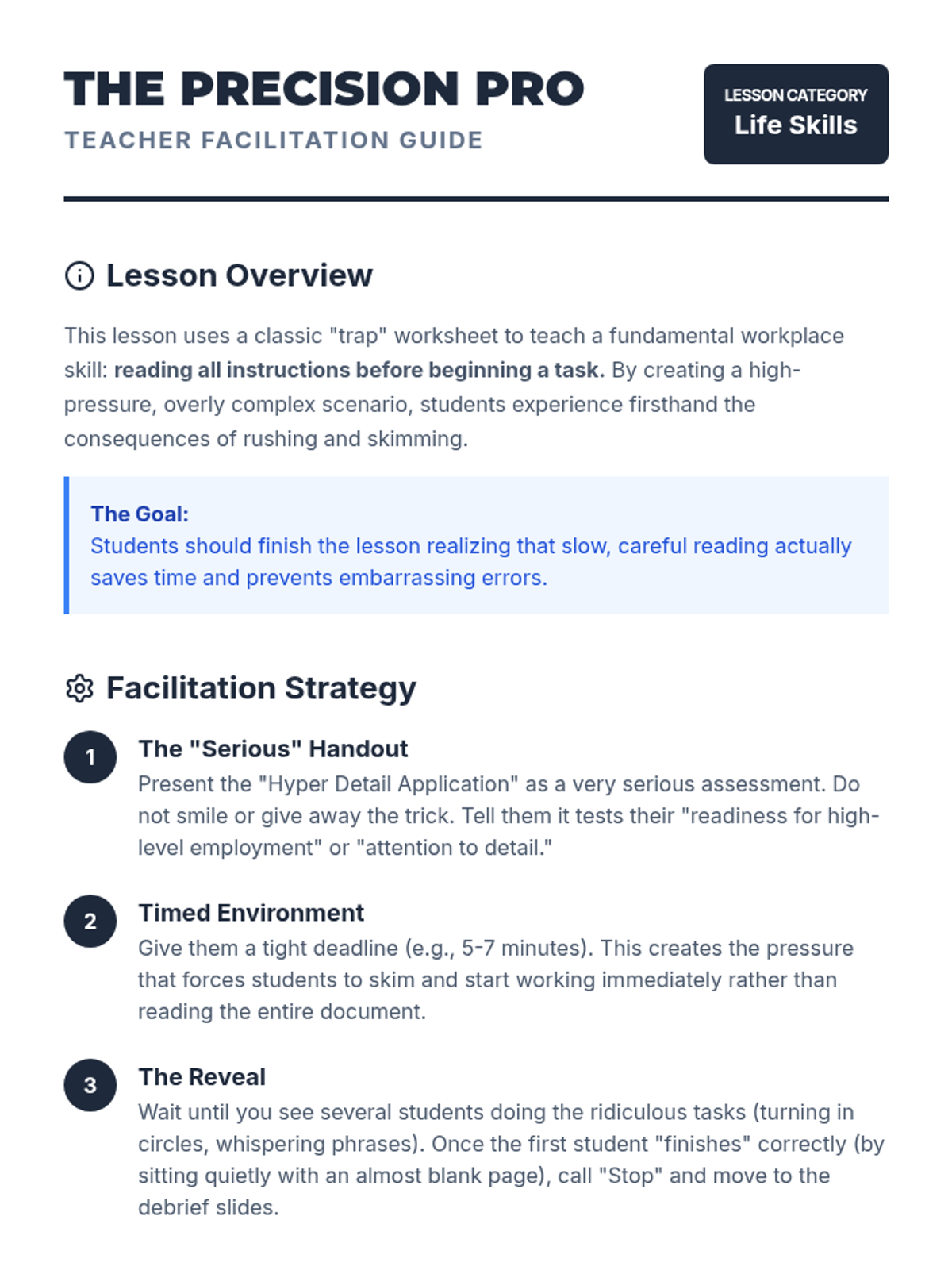 A lesson centered on a 'follow the directions' challenge themed as an overly complex job application to teach the importance of reading all instructions before beginning a task.