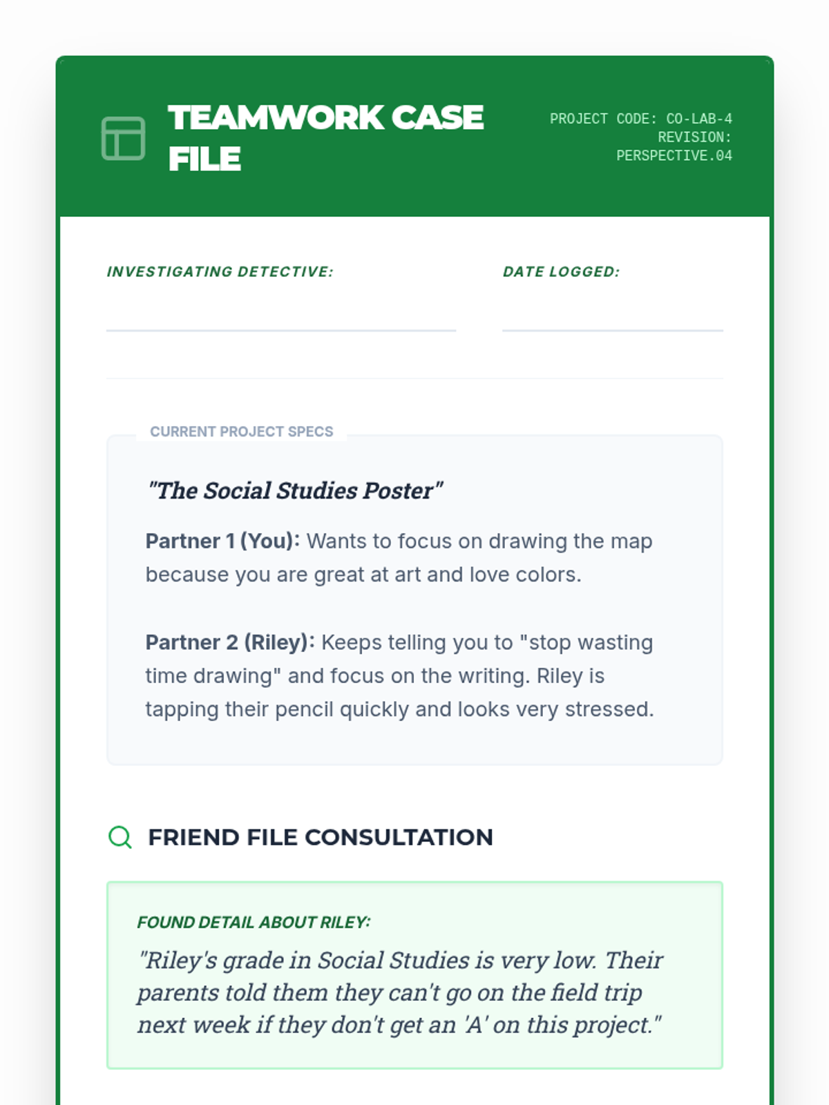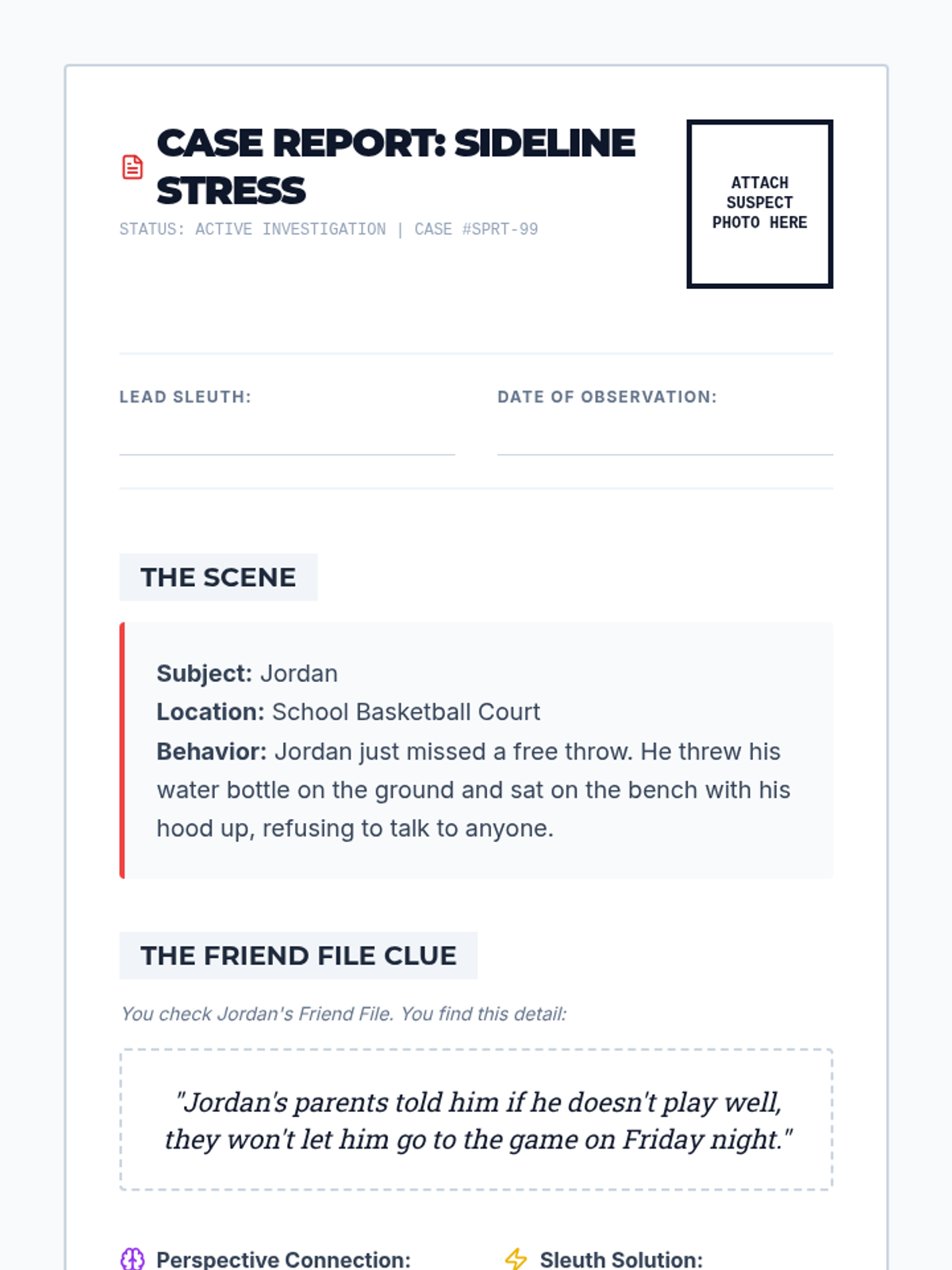 Applying perspective-taking to sports and competition. Students use Friend Files to understand why a teammate might be frustrated or overly competitive and find solutions that keep the game fun for everyone.