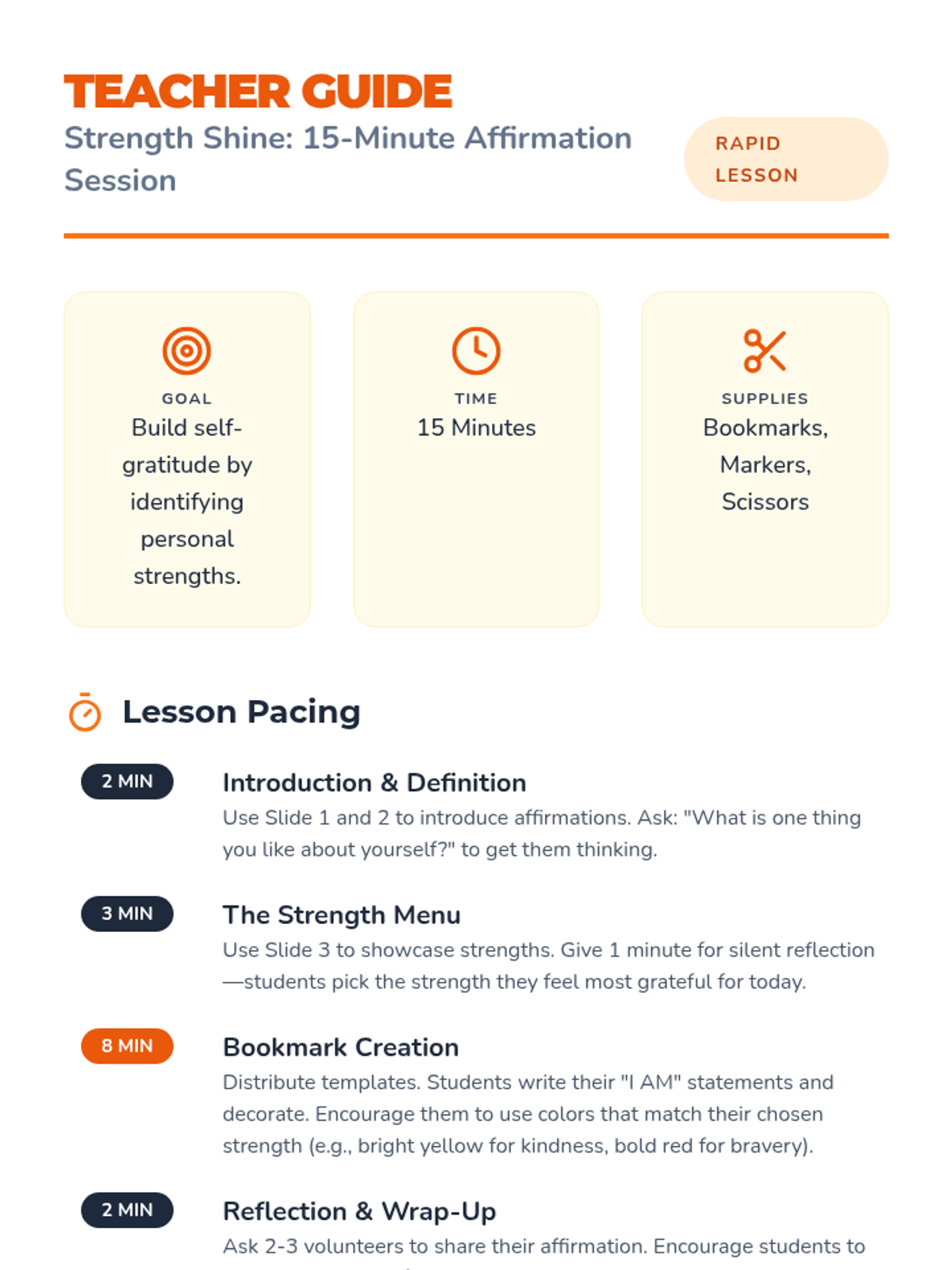 A quick, impactful 15-minute lesson focused on self-gratitude. Students identify their personal strengths and transform them into positive affirmations on custom bookmarks.