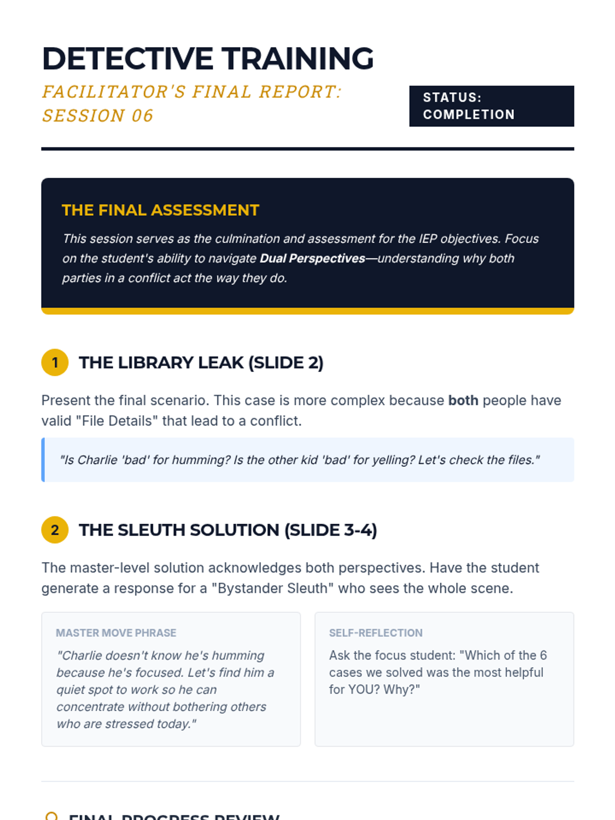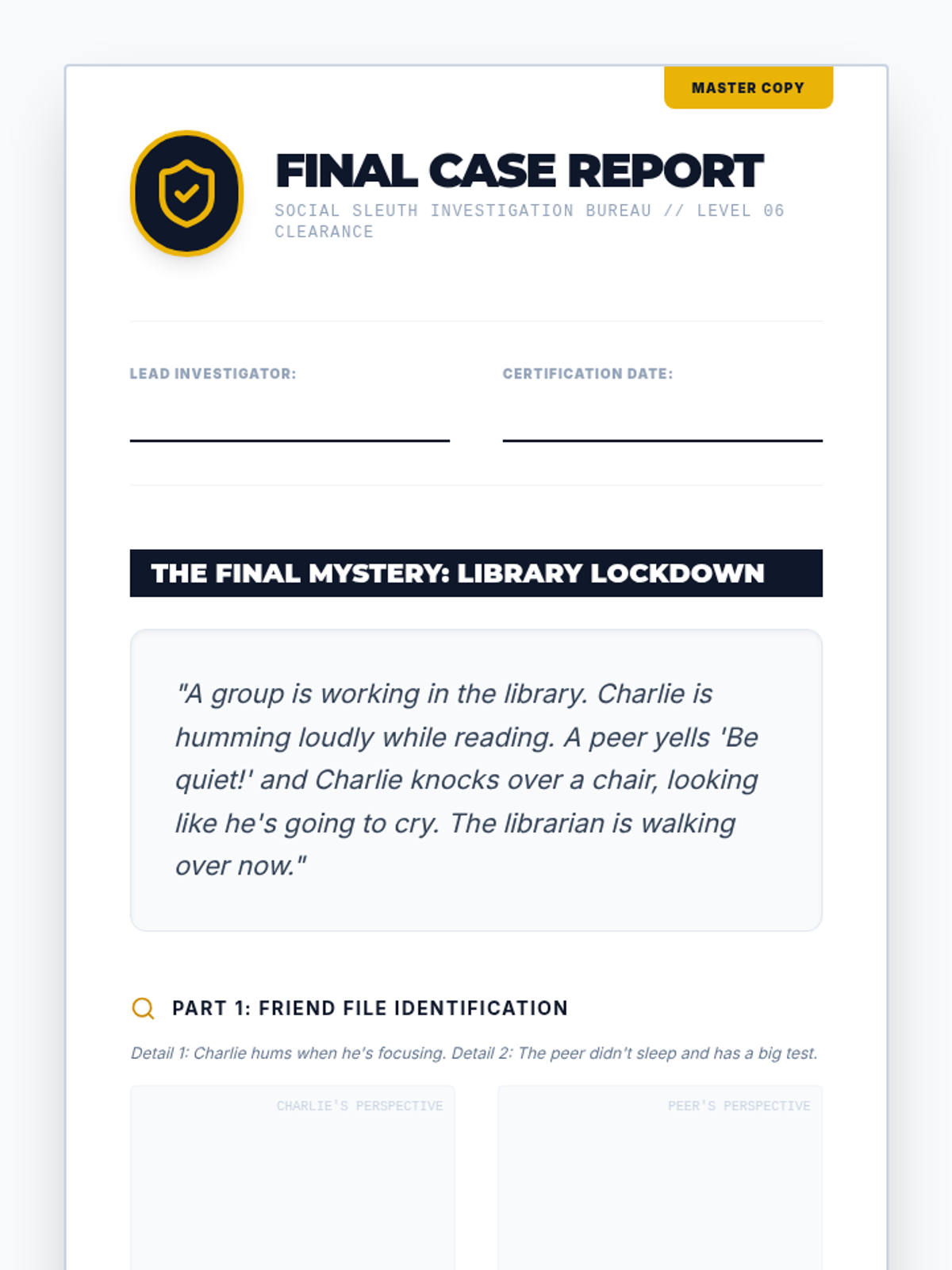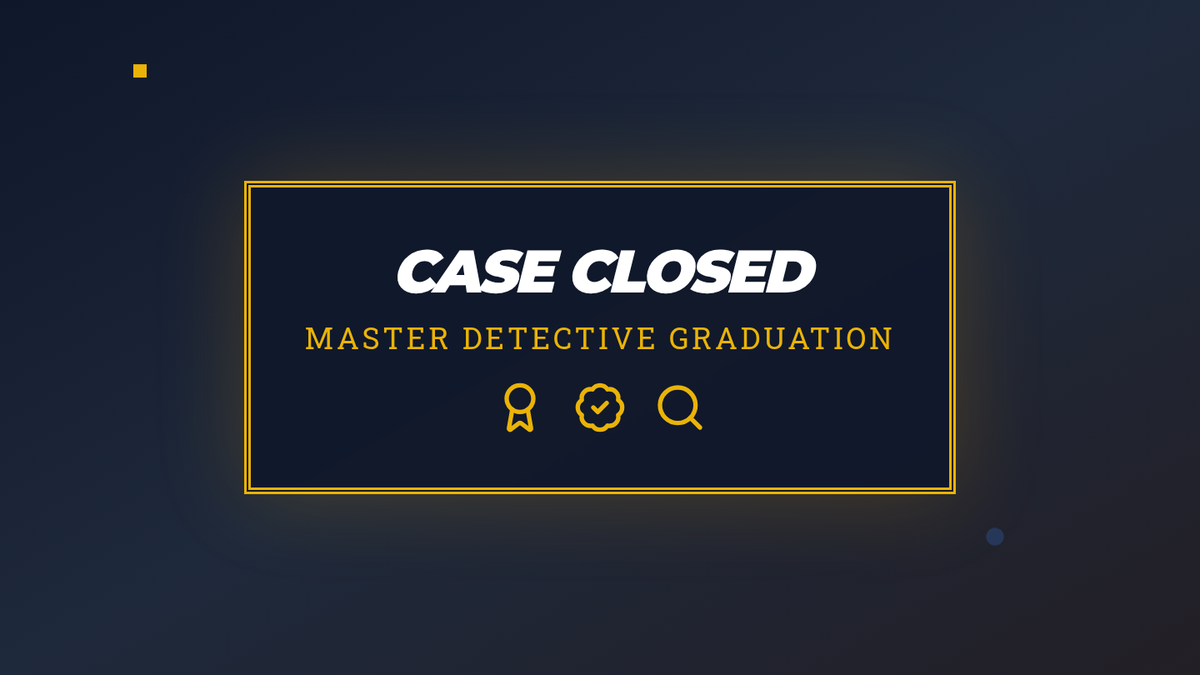 The final assessment and graduation. Students apply all their sleuthing skills to a complex multi-perspective case and receive their Master Detective certification.