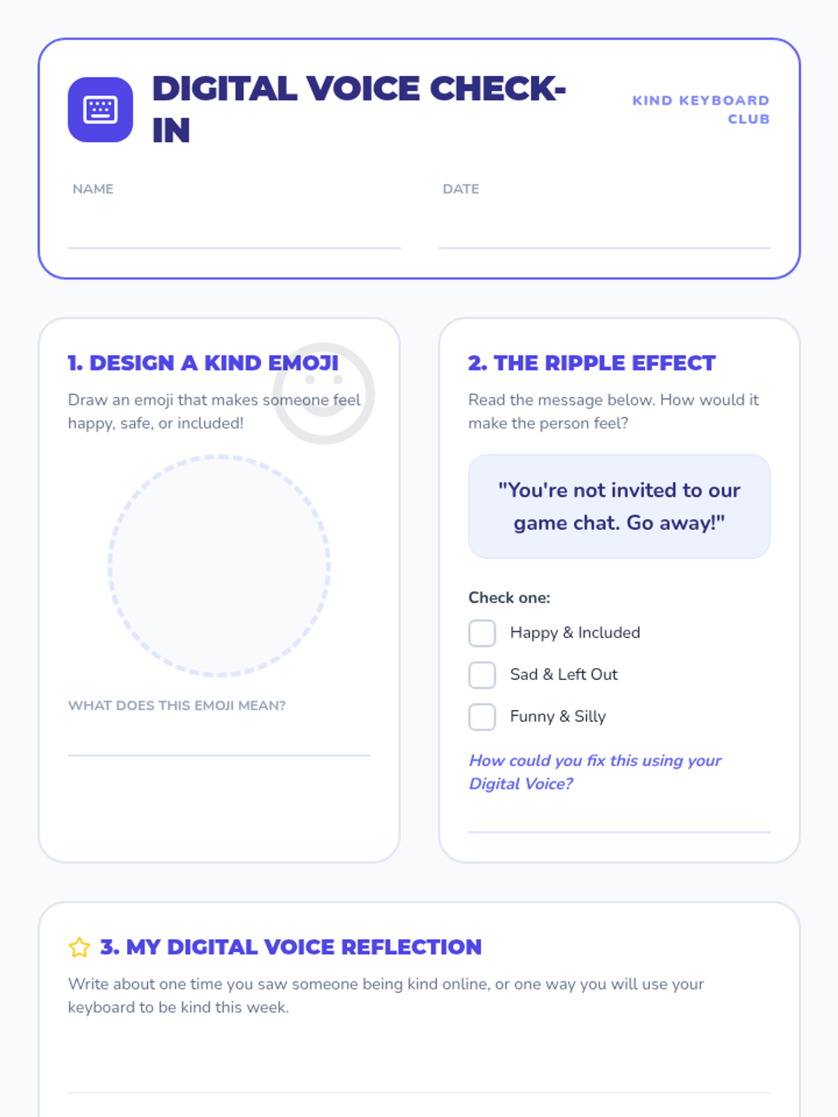 In this lesson, 2nd and 3rd-grade students join 'The Kind Keyboard Club' to explore the impact of their digital voices. Through a 'Choose Your Own Path' adventure, they navigate online social scenarios to learn how positive communication builds community and prevents harm.