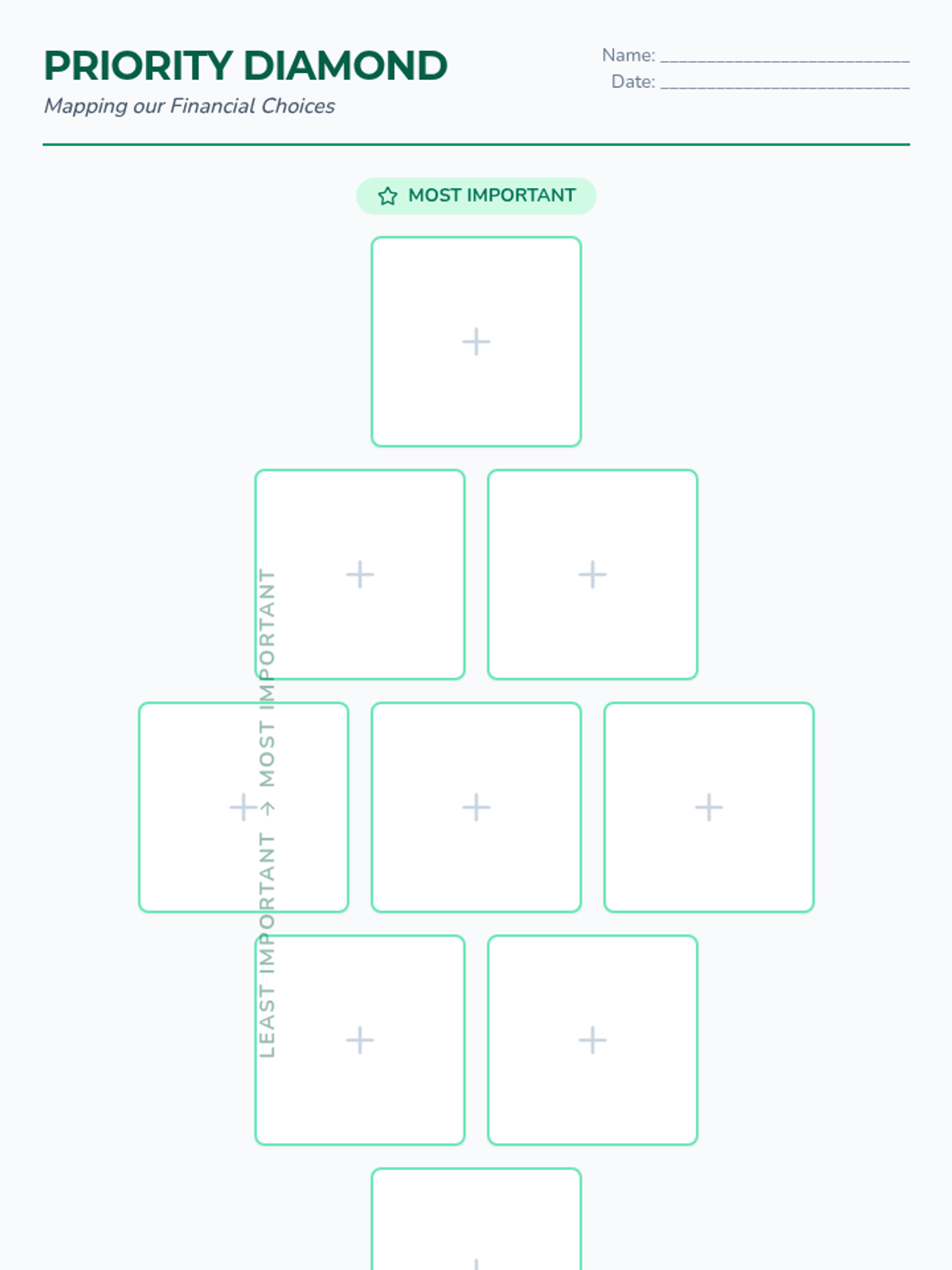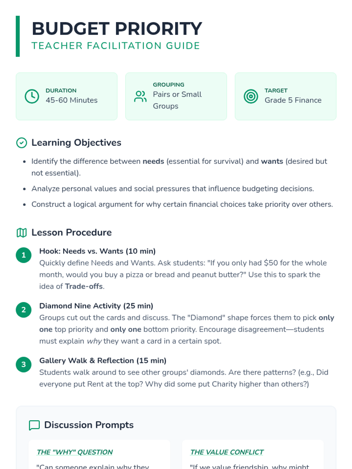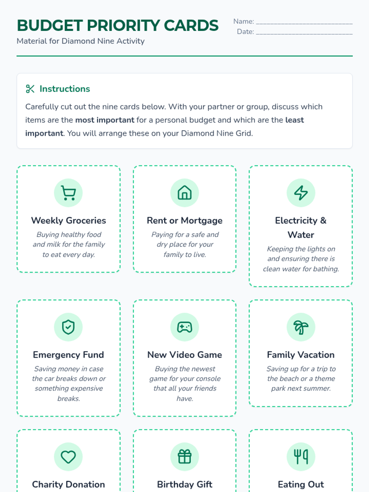 In this lesson, students explore personal finance by ranking nine different budgeting priorities. They will distinguish between needs and wants while justifying their financial decisions through a Diamond Nine collaborative activity.