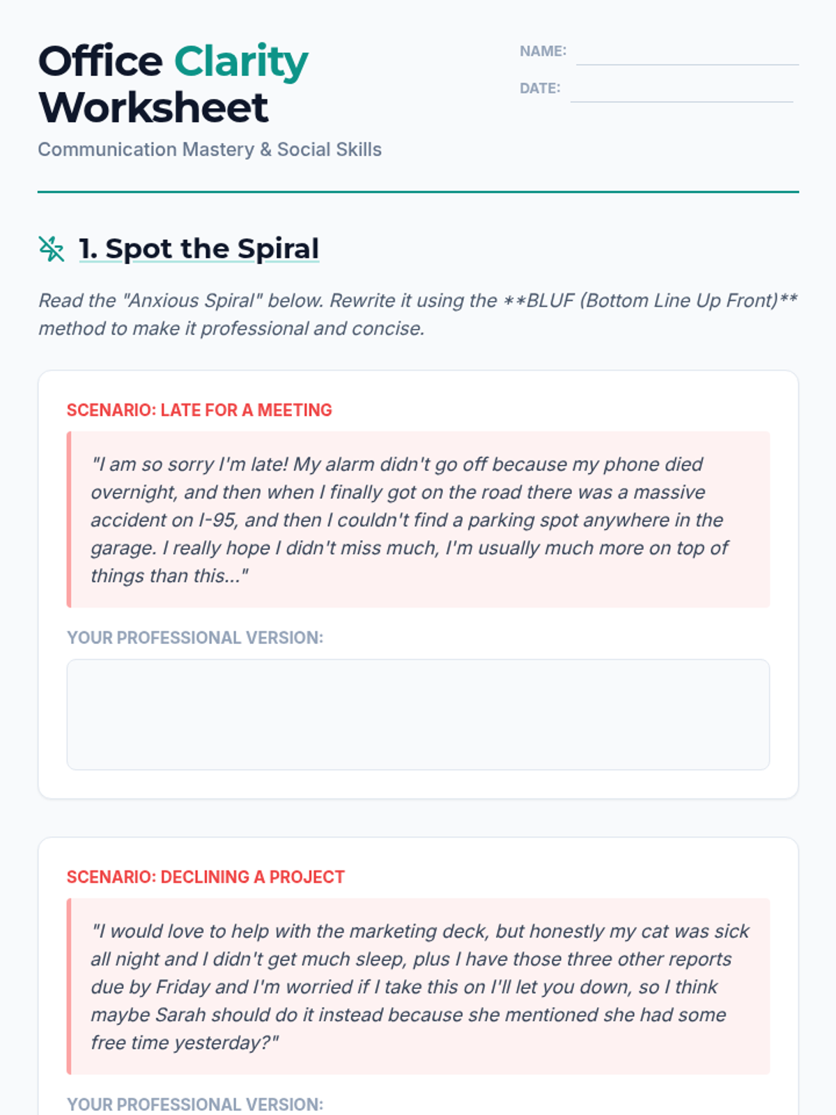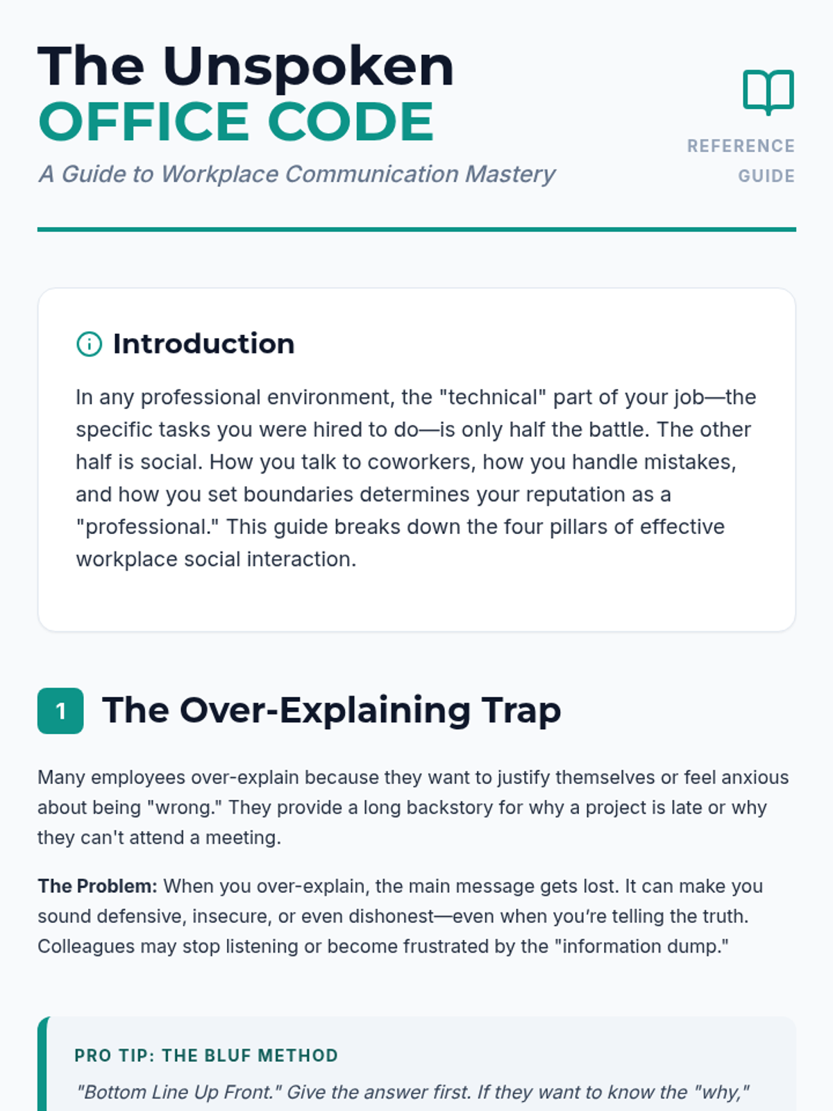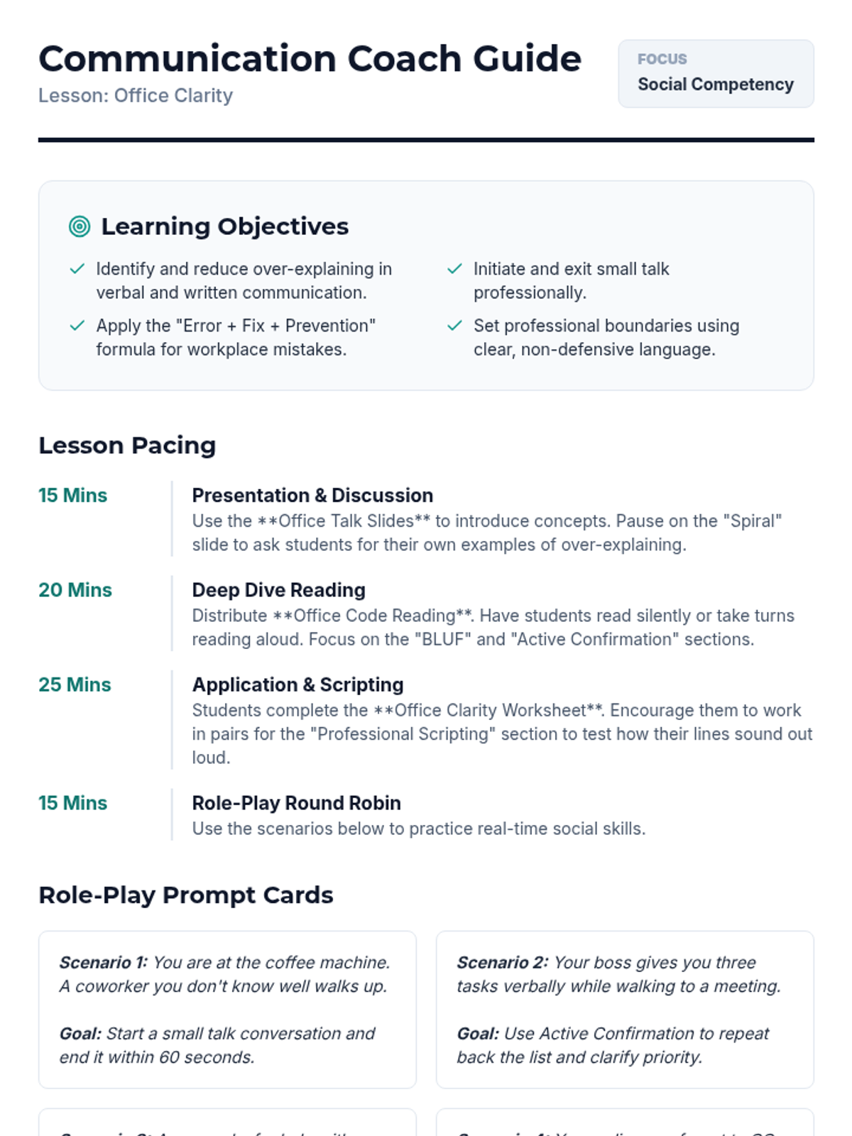 A comprehensive lesson designed to help learners master workplace communication by reducing over-explaining, mastering small talk, following directions, reporting errors, and setting boundaries.