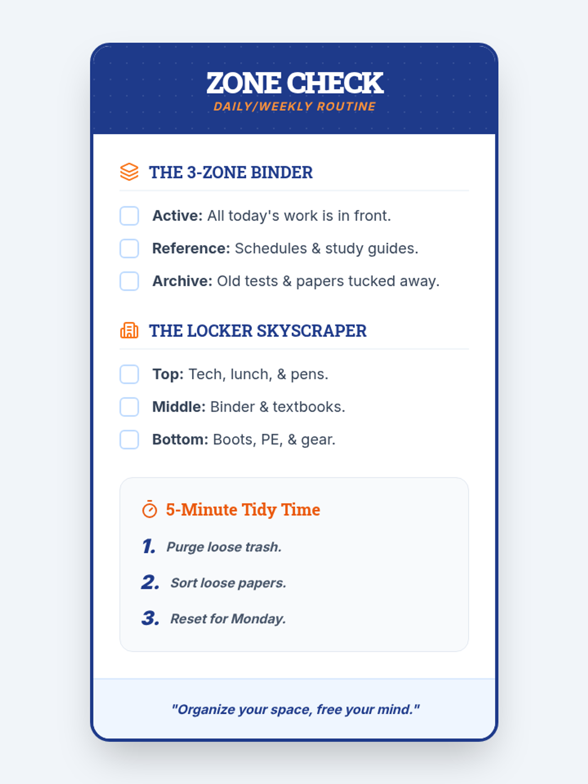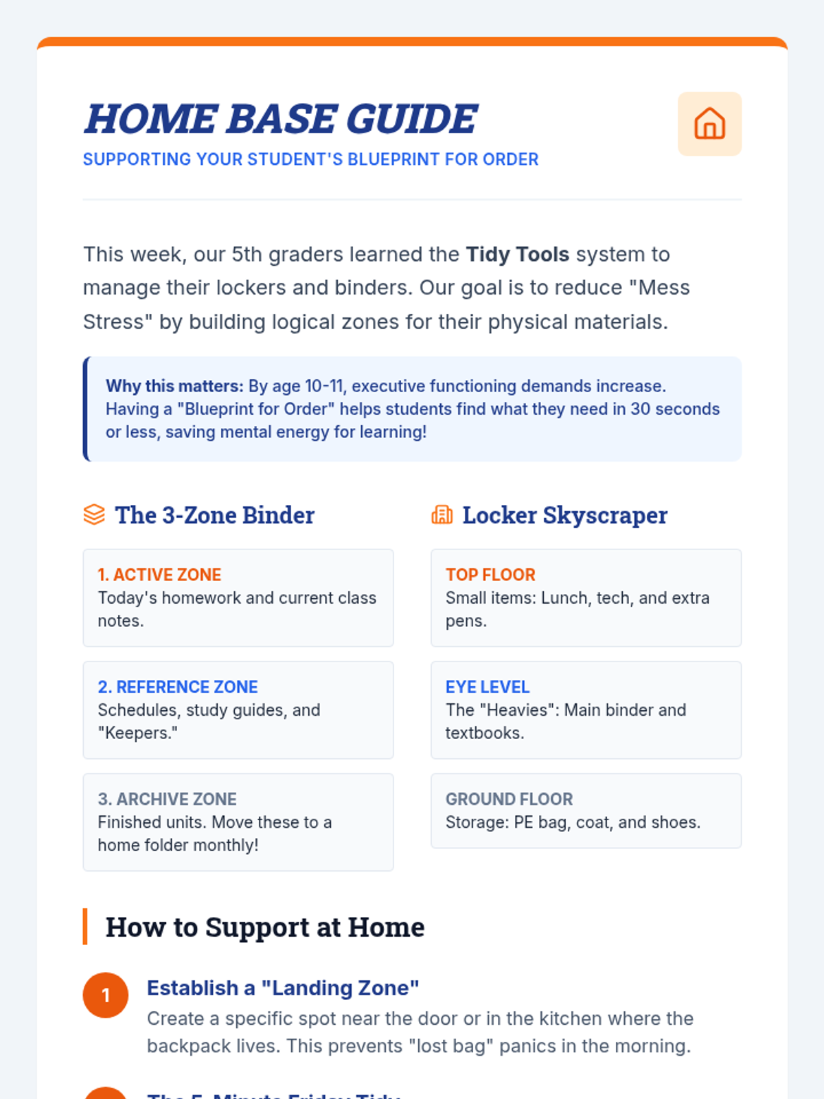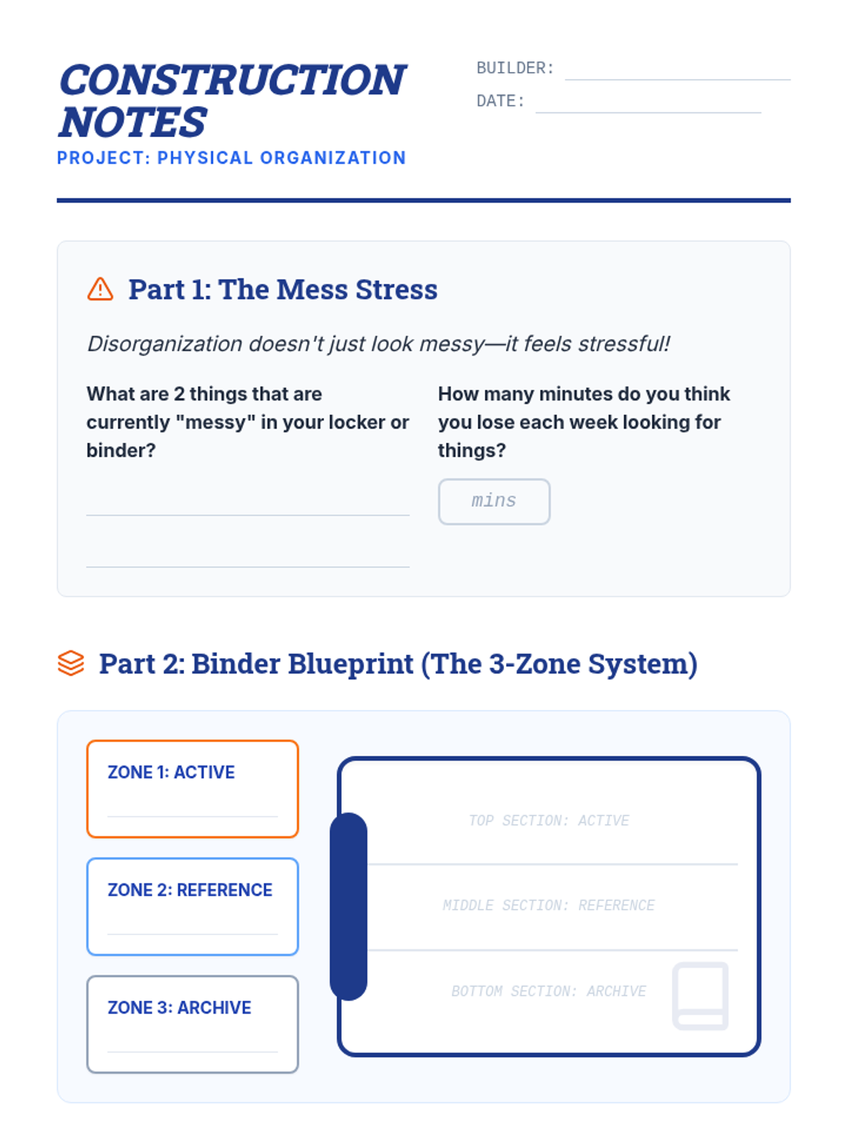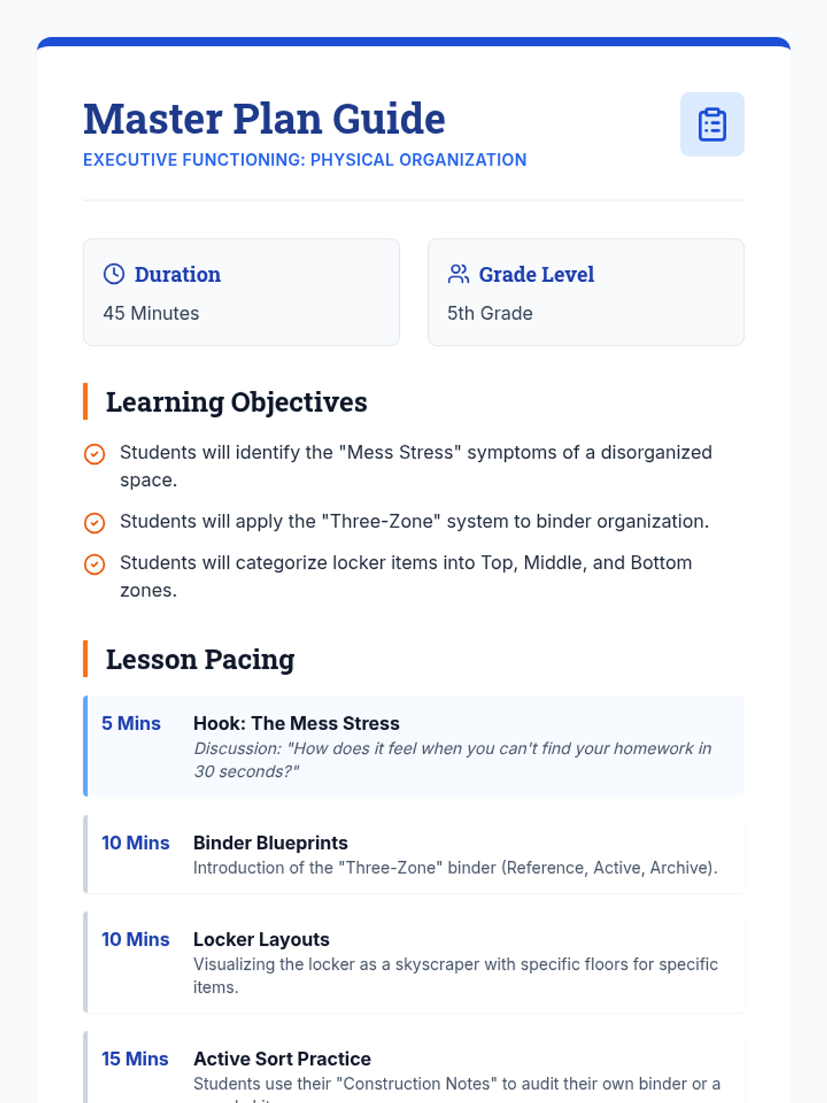 A 45-minute intervention lesson for 5th graders focusing on practical organizational systems for lockers and binders to reduce stress and improve efficiency.