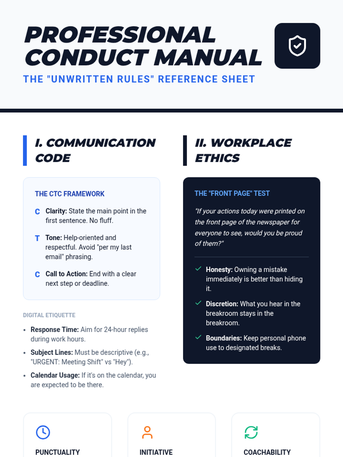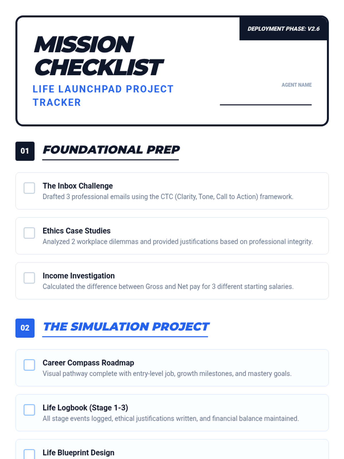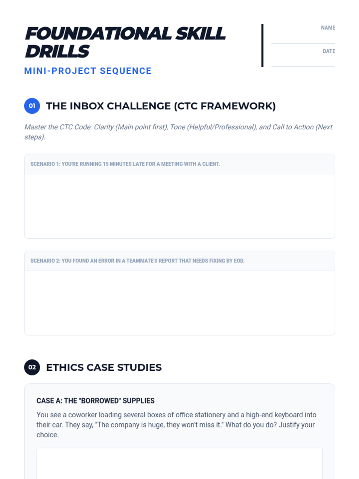 A preparatory lesson focused on mastering the foundational skills of workplace ethics, professional communication, and financial literacy before beginning the full-scale simulation.