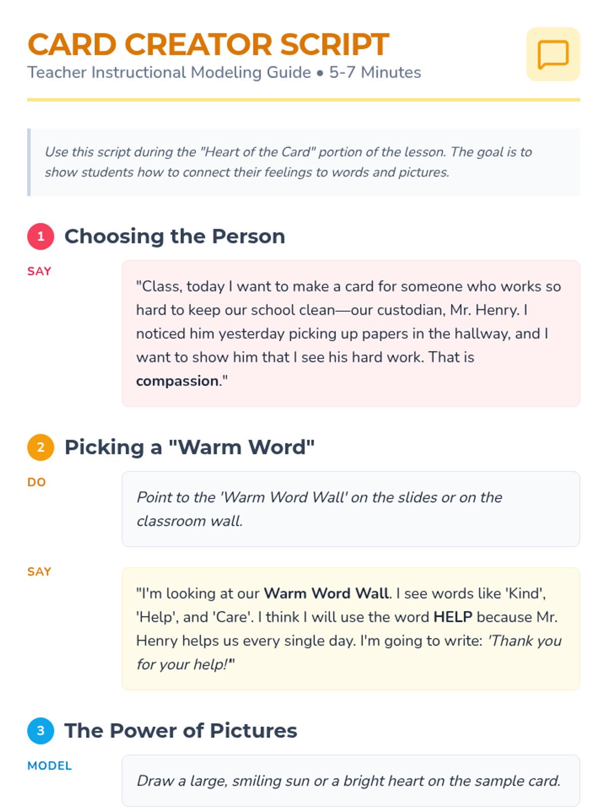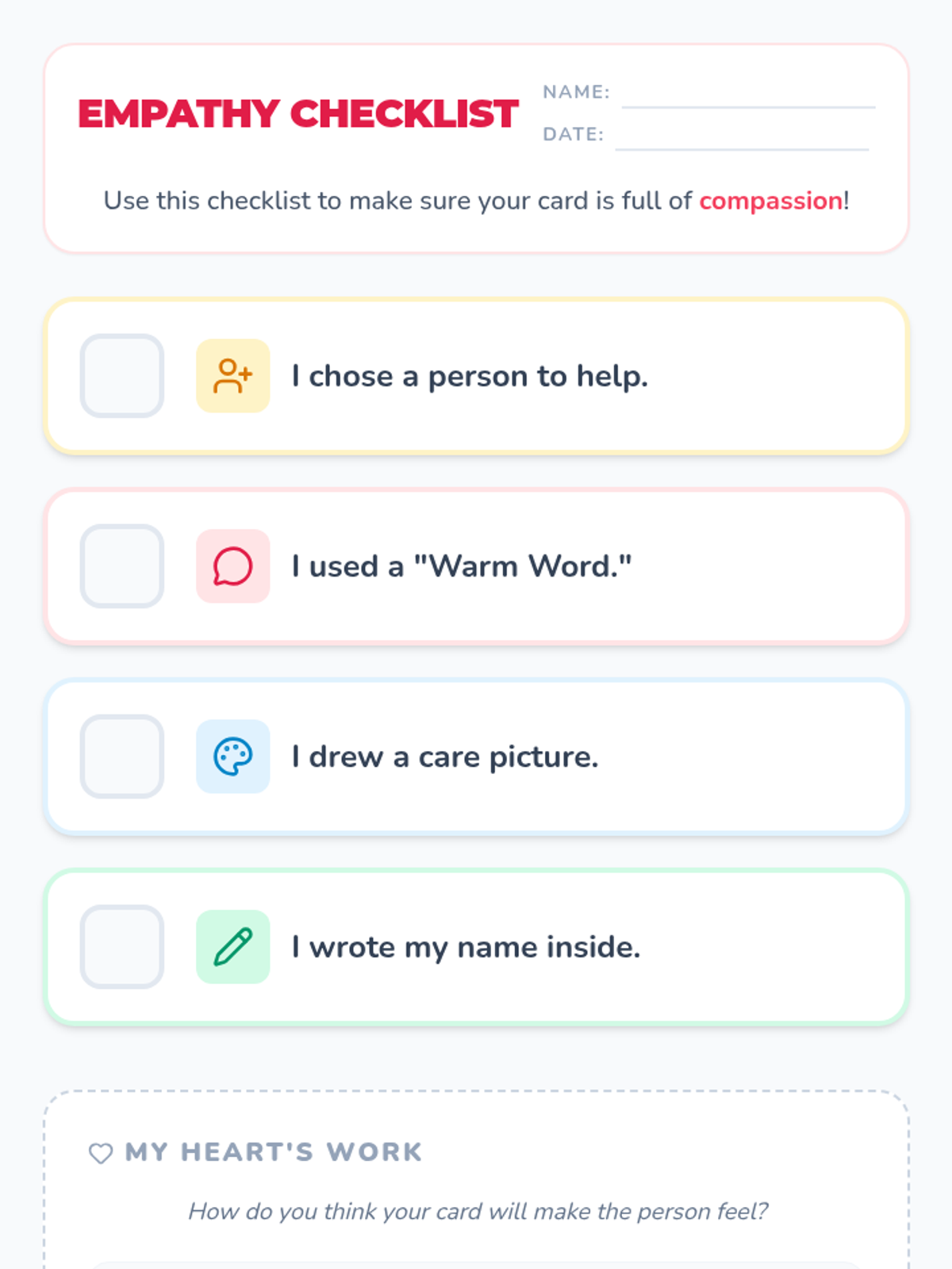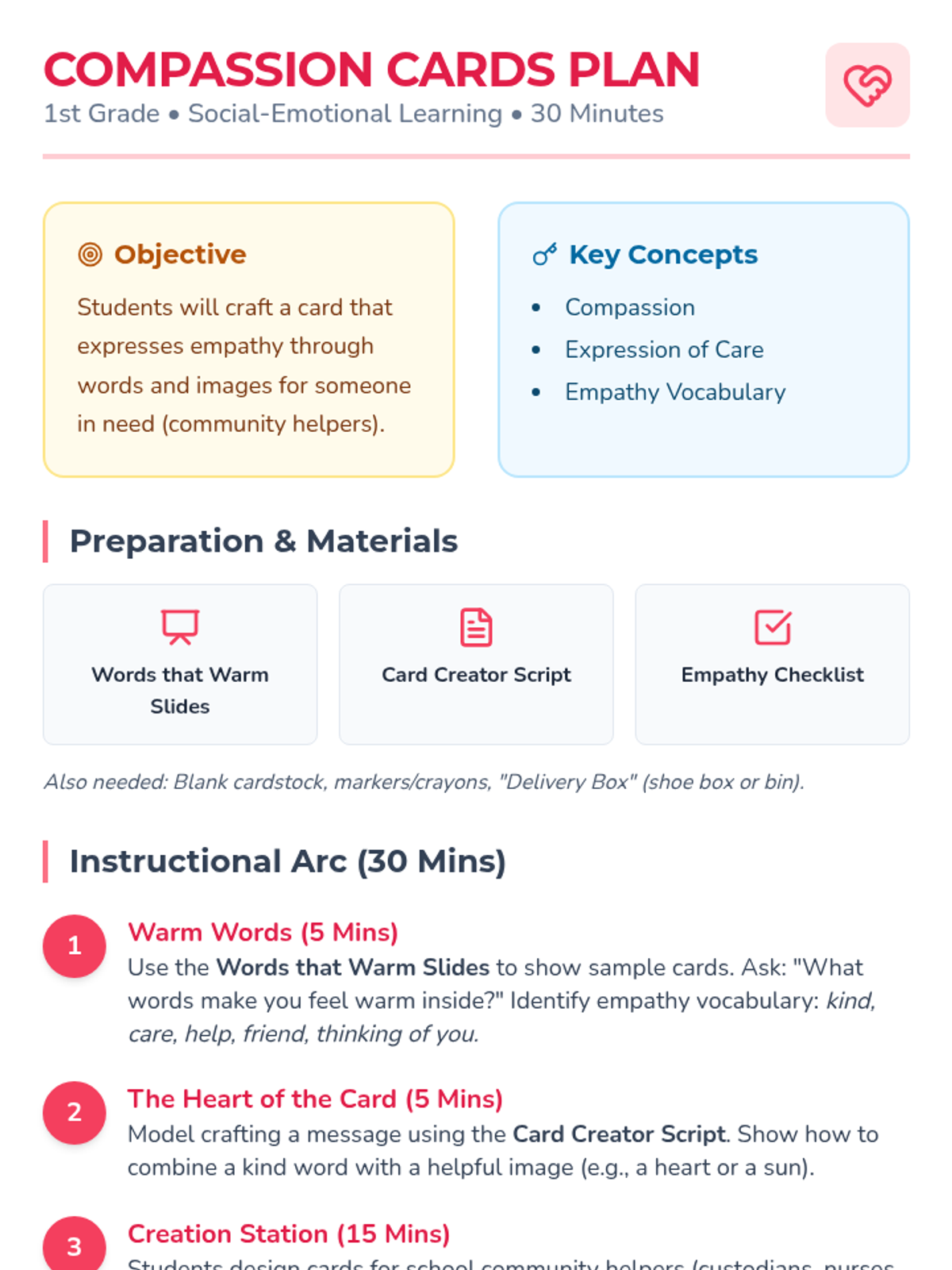 In this 30-minute social-emotional learning lesson, 1st-grade students explore the concept of compassion by creating heartfelt cards for community helpers. They will learn empathy vocabulary and use both words and illustrations to express care and appreciation.