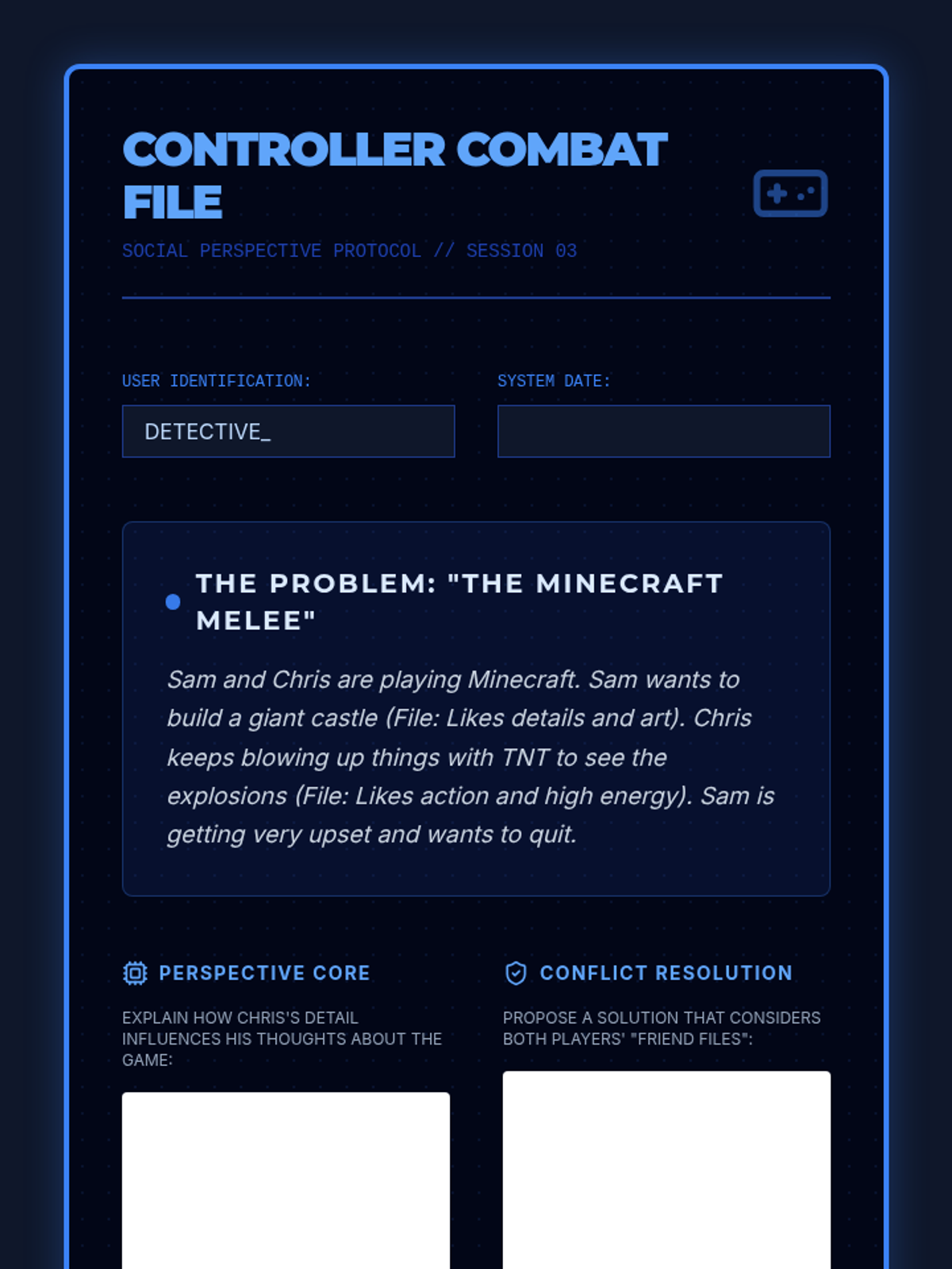 Navigating the world of video games and shared hobbies. Students use Friend Files to predict how different play styles and preferences impact social interactions during gaming sessions.