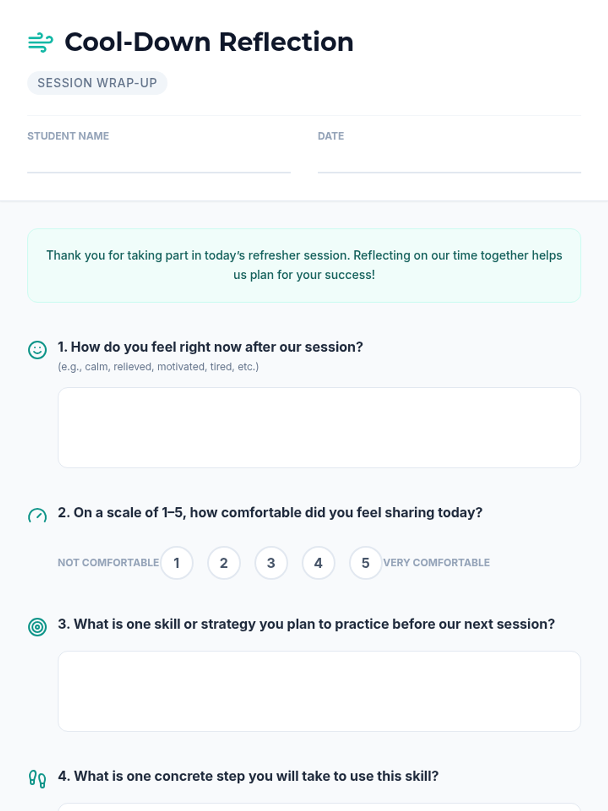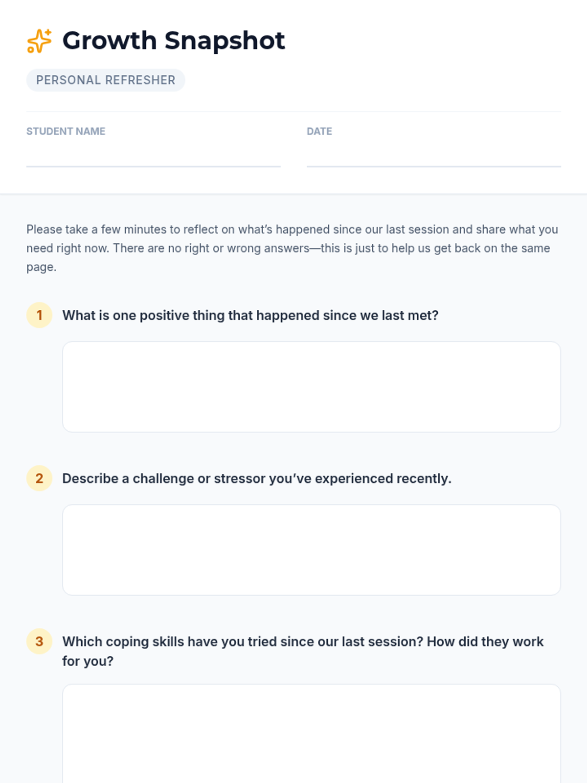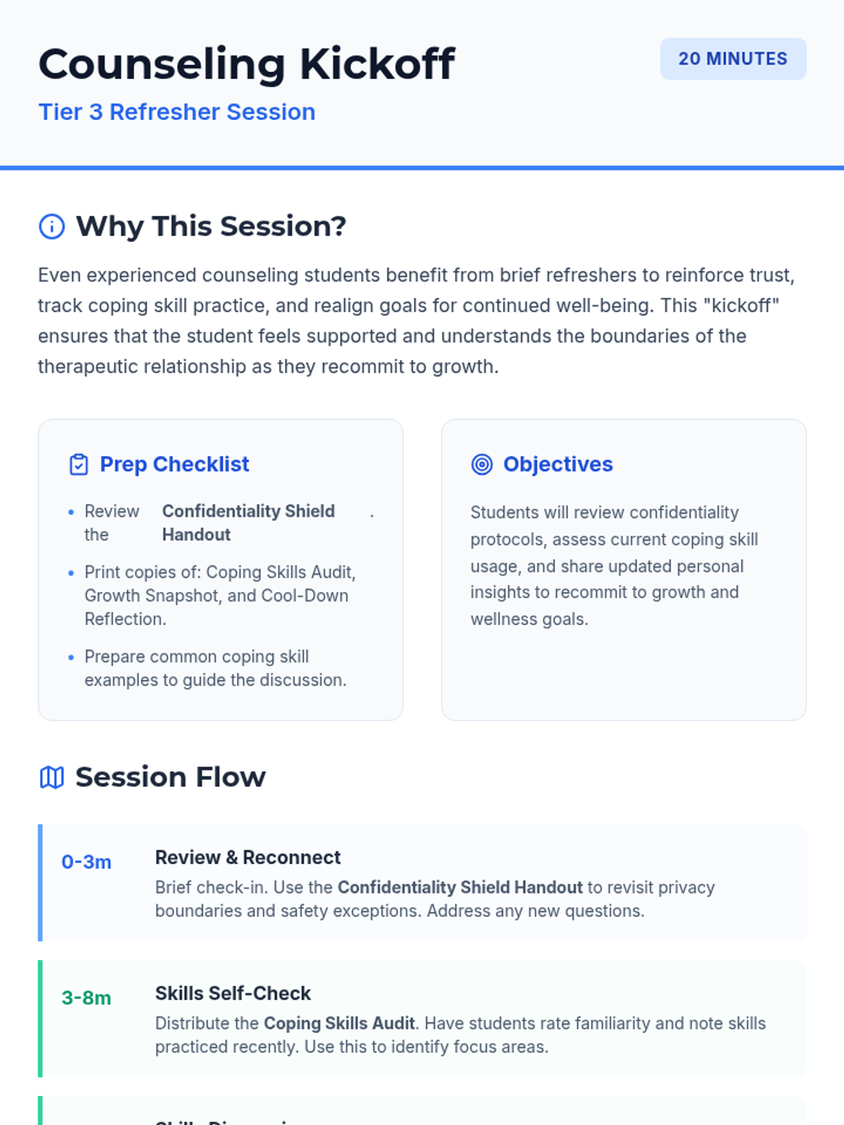 A 20-minute Tier 3 refresher session for middle schoolers to reconnect with the counseling process, review confidentiality, and update coping skill goals.
