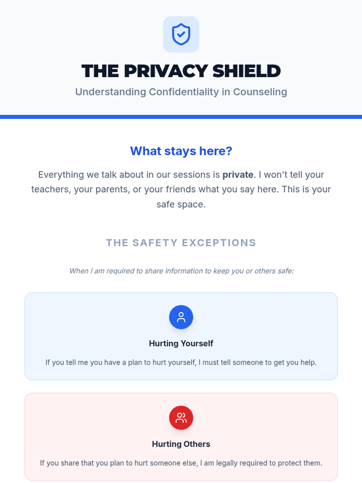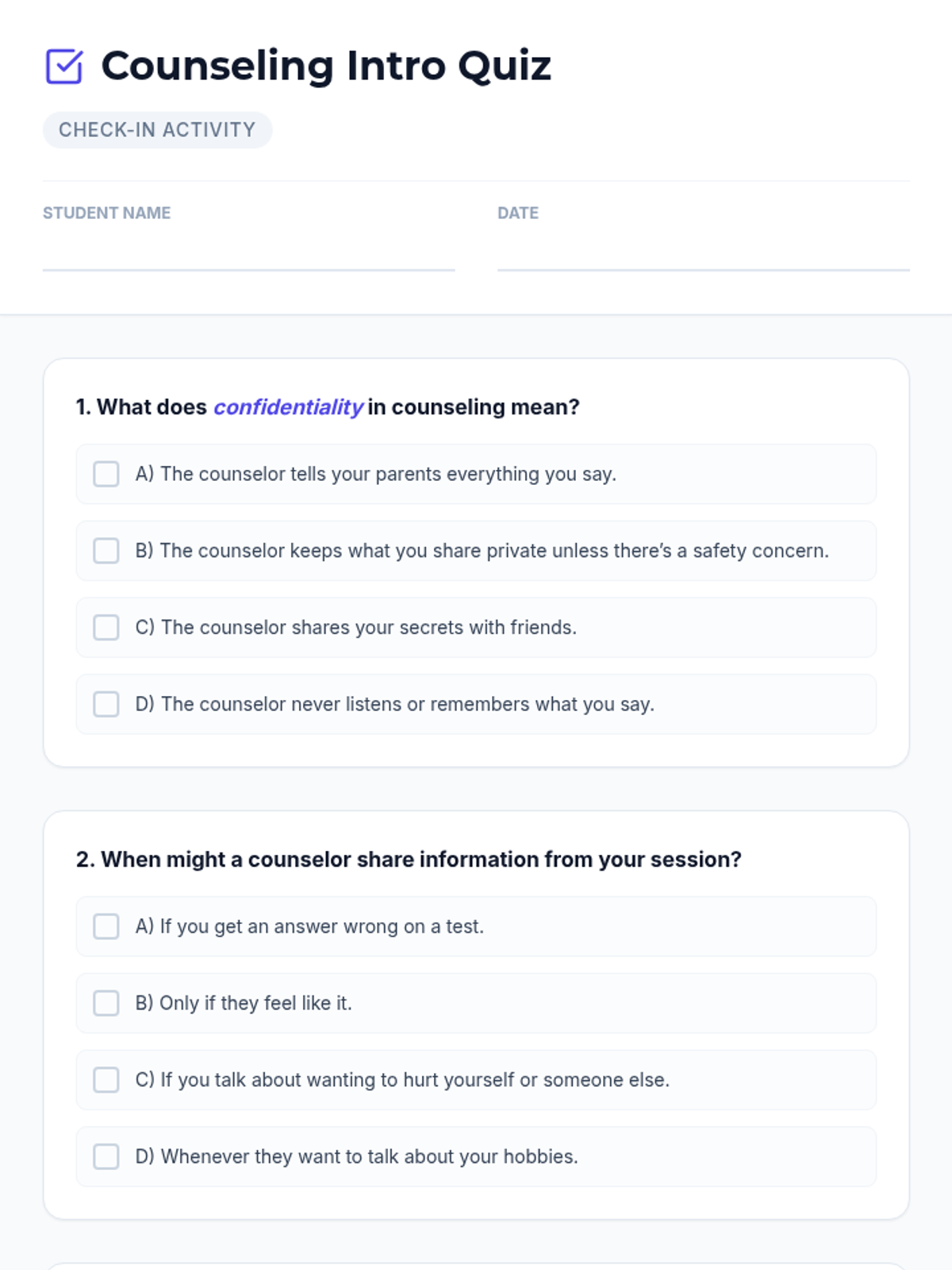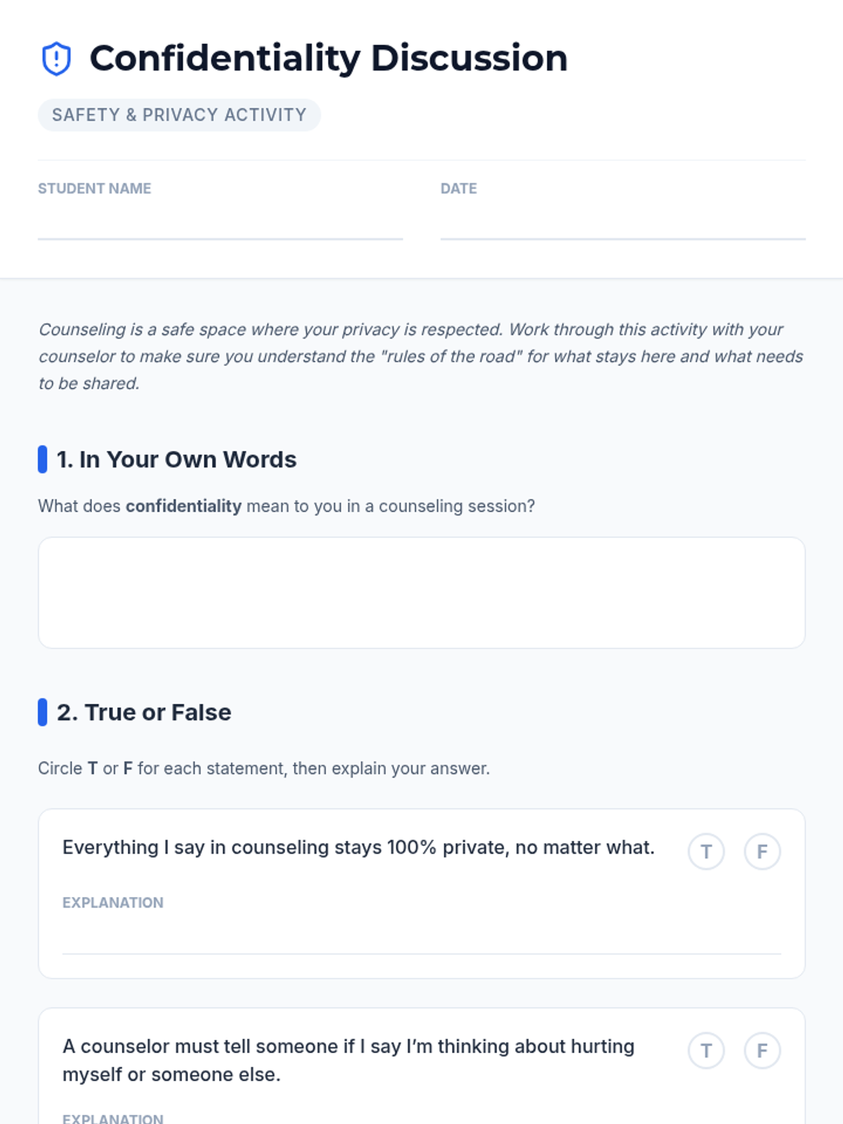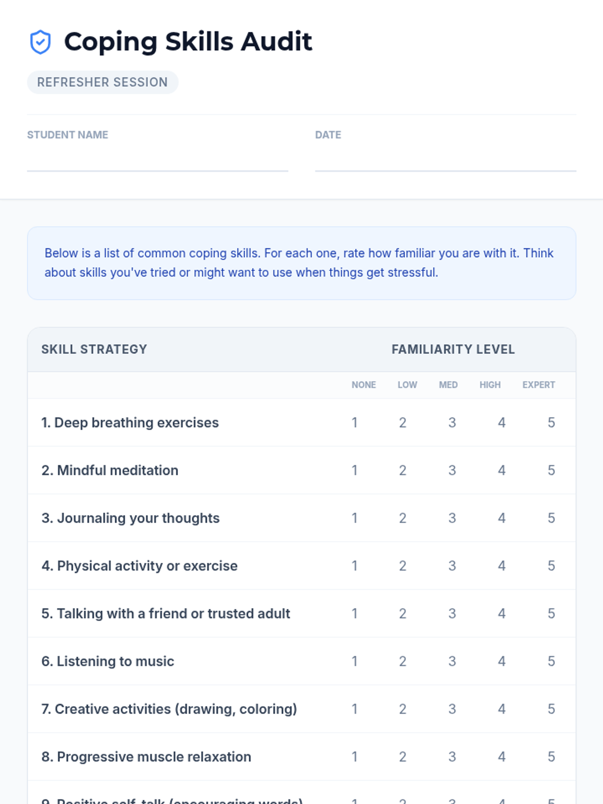 A 20-minute Tier 3 refresher session for middle schoolers to reconnect with the counseling process, review confidentiality, and update coping skill goals.