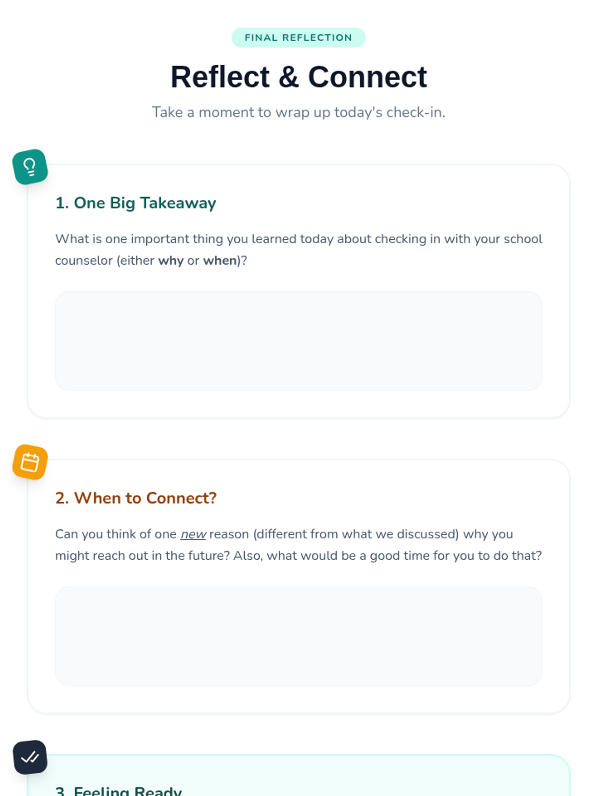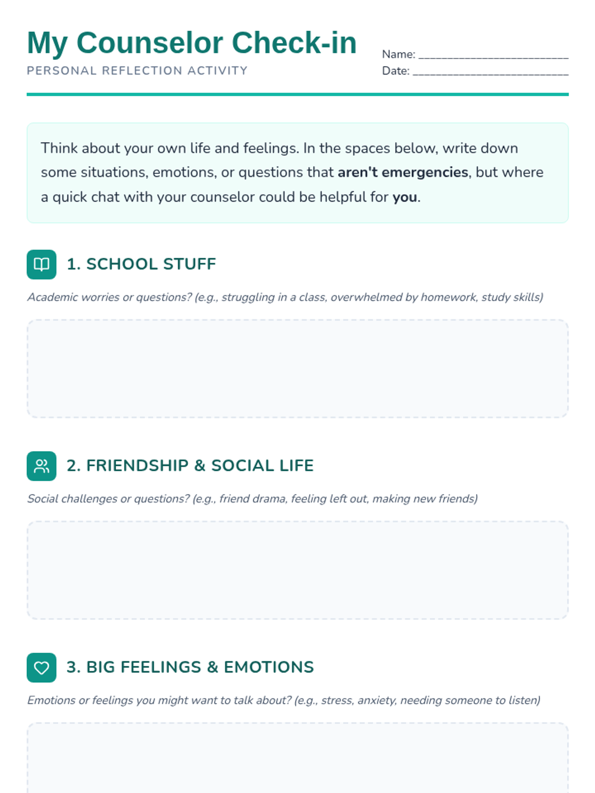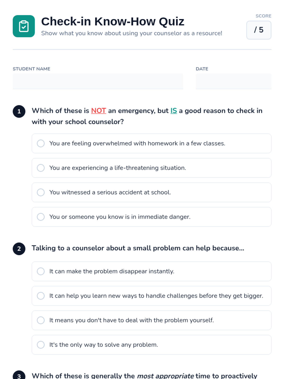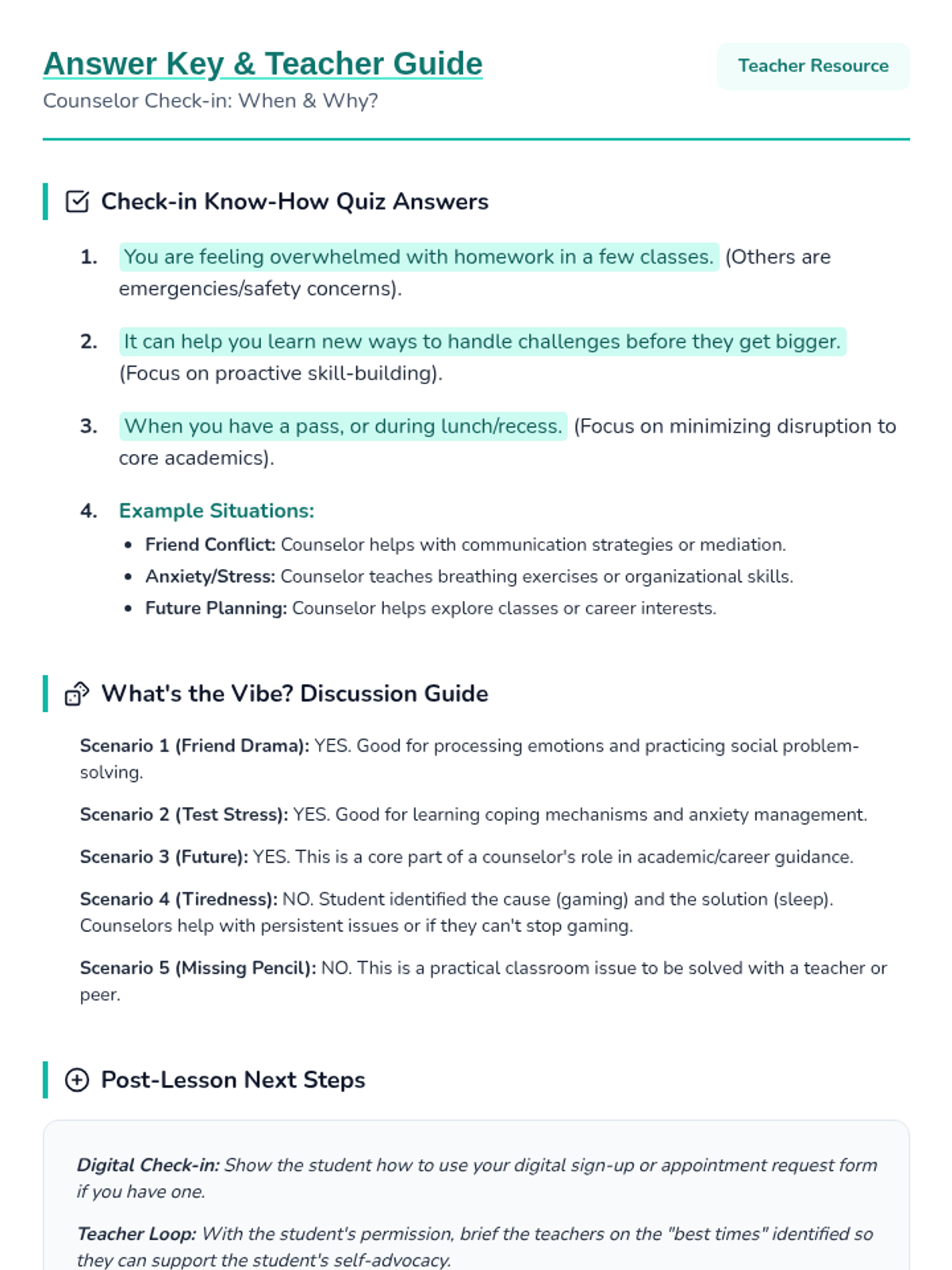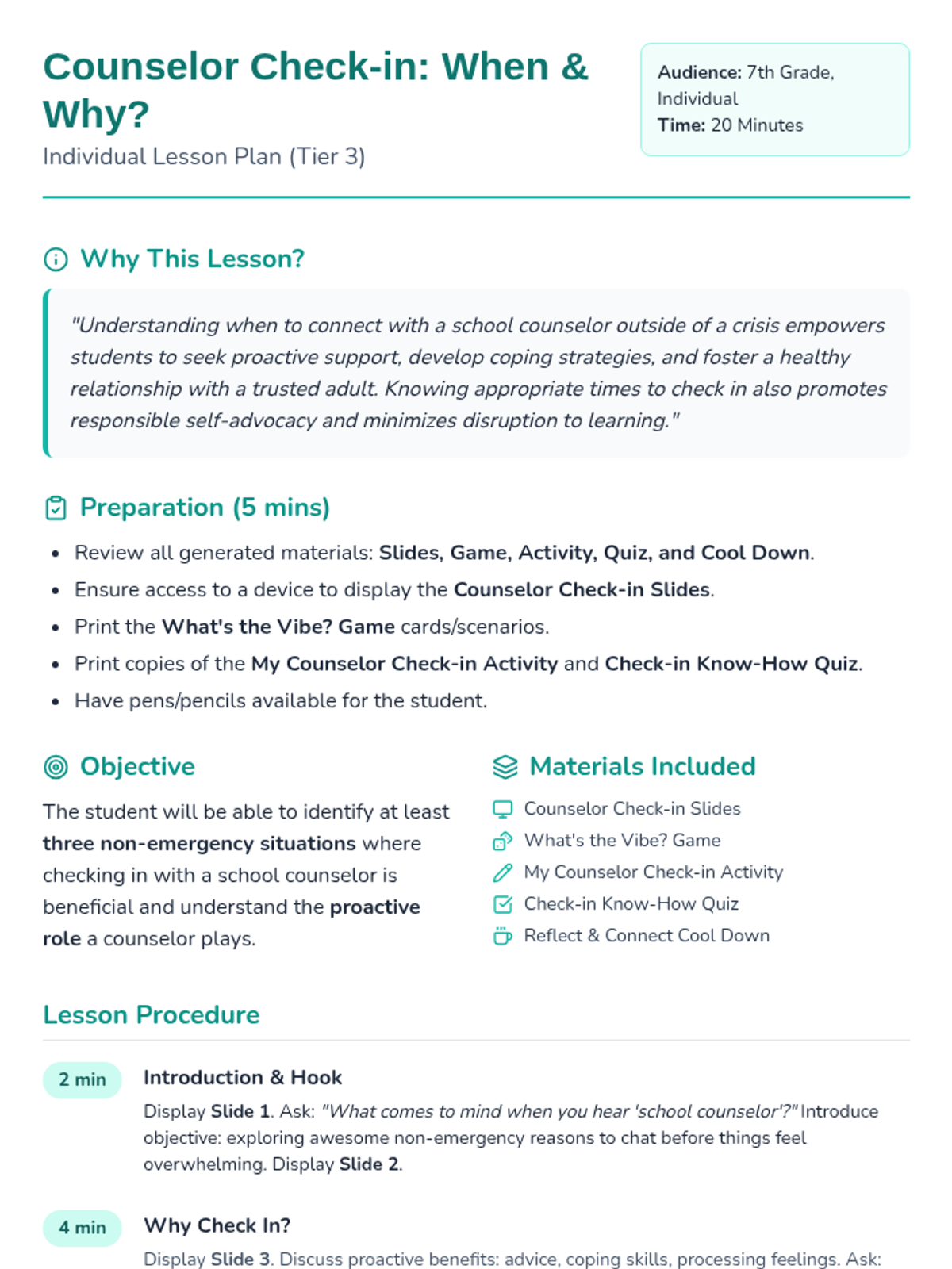 A 20-minute individualized Tier 3 lesson for 7th-grade students to identify proactive, non-emergency reasons to visit their school counselor and the best times to do so.