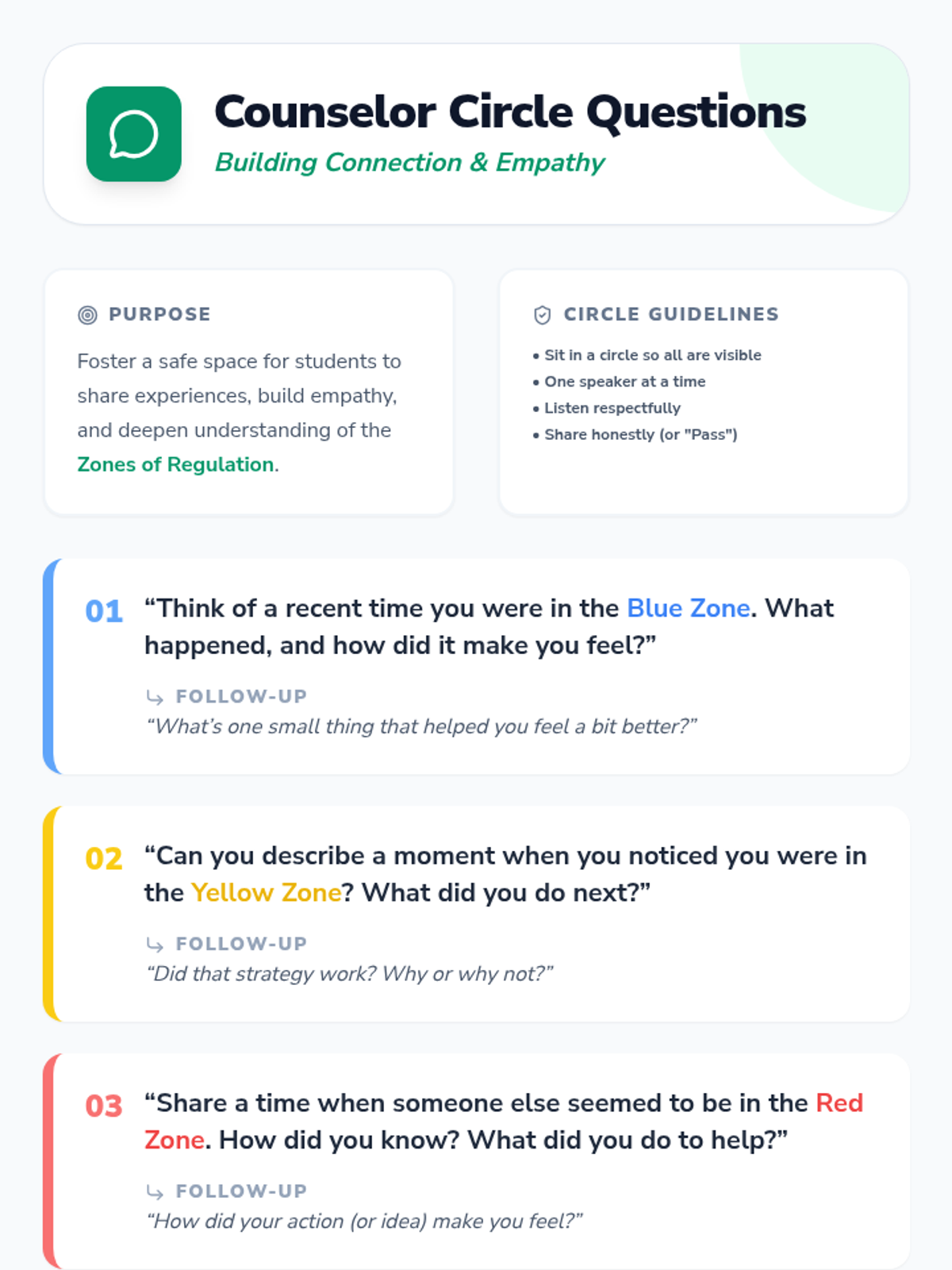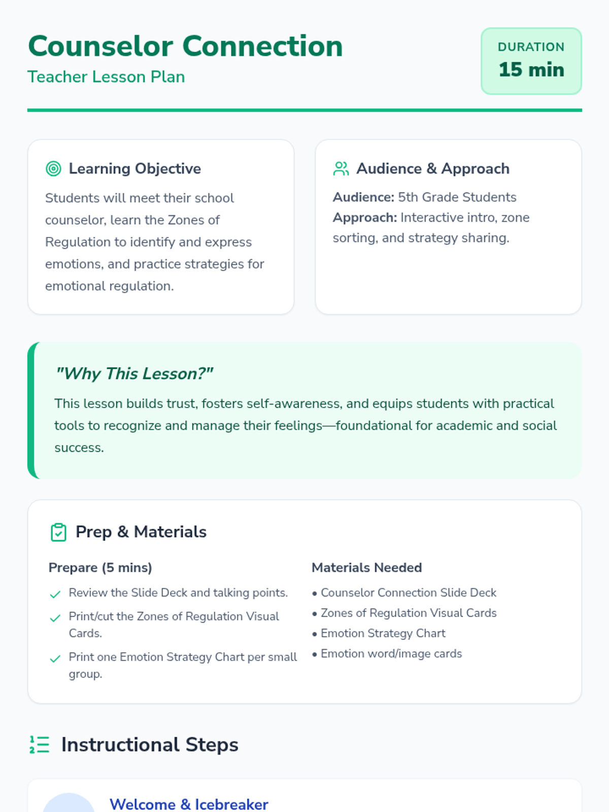A short, high-impact introductory lesson for 5th graders to meet their school counselor and master the Zones of Regulation.