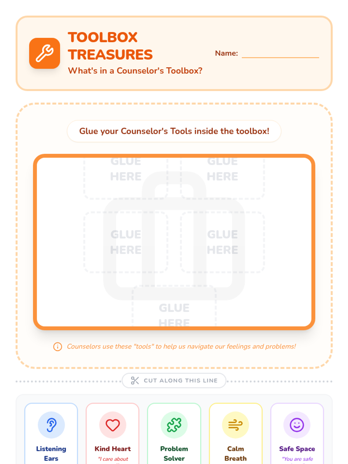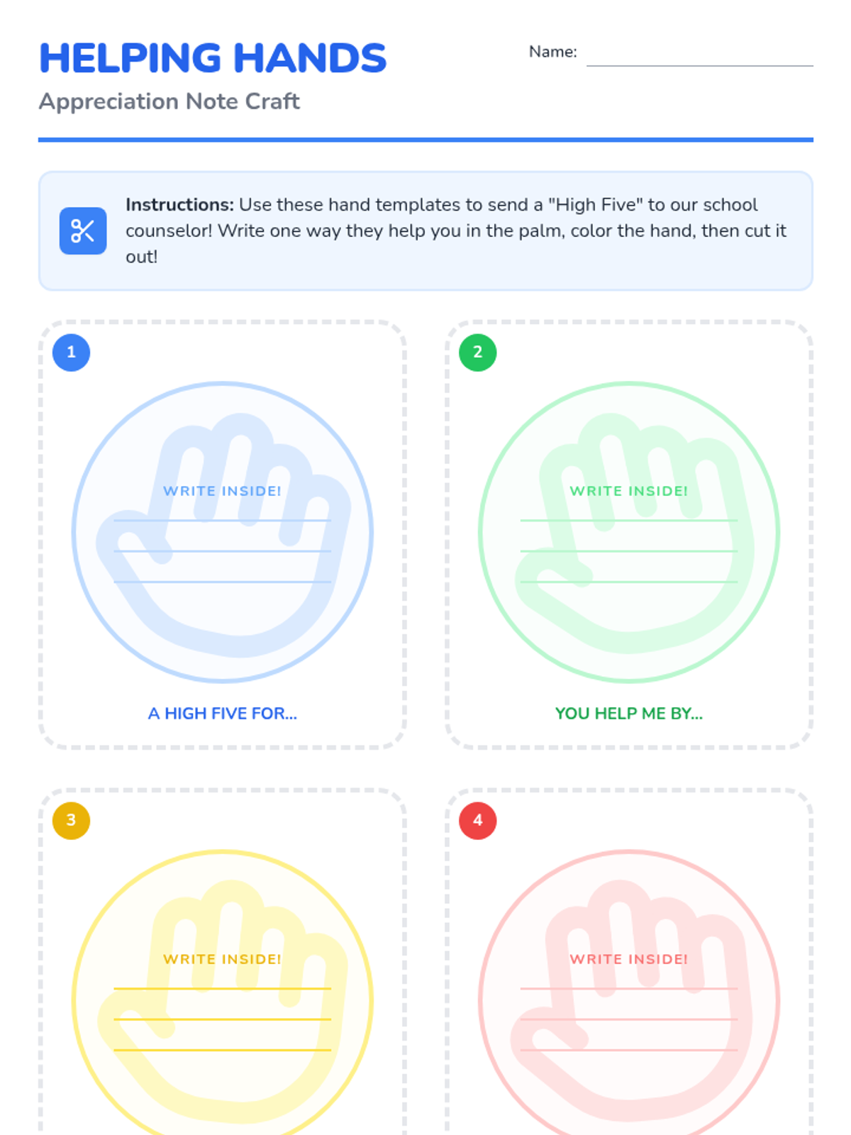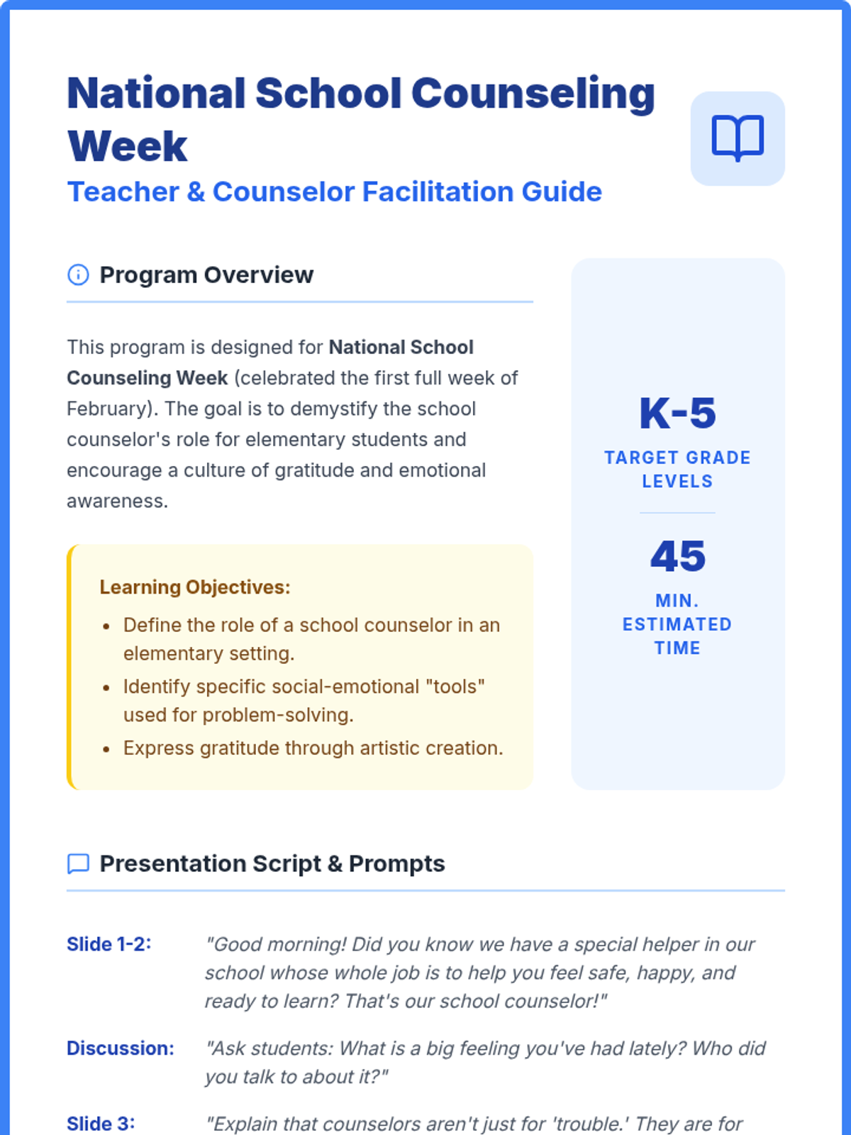 A collection of hands-on activities for Elementary students to celebrate National School Counseling Week, focusing on understanding the counselor's role and expressing gratitude.