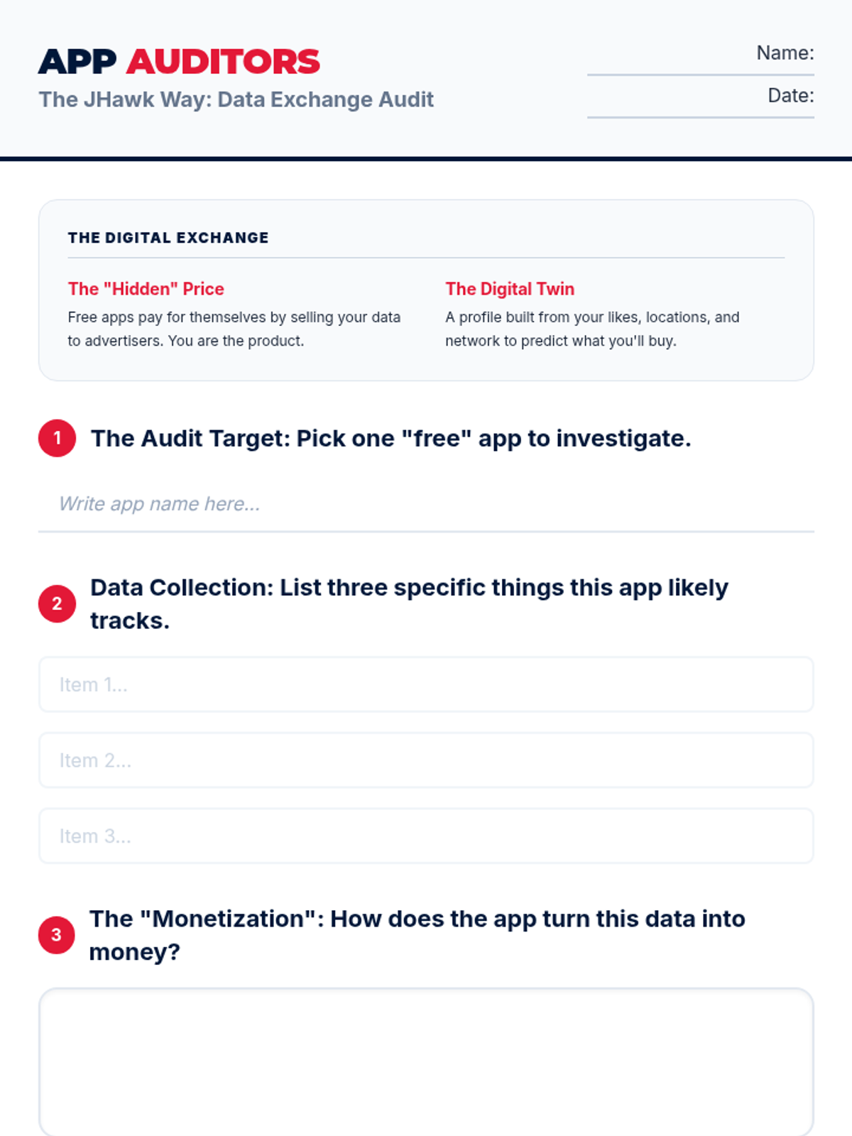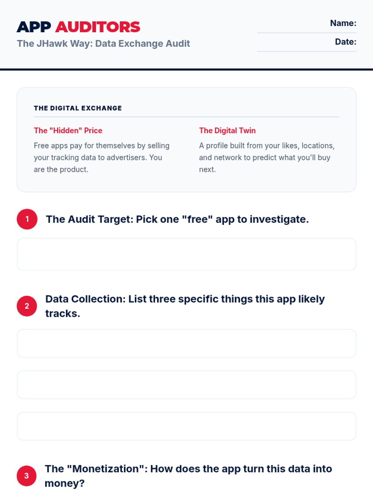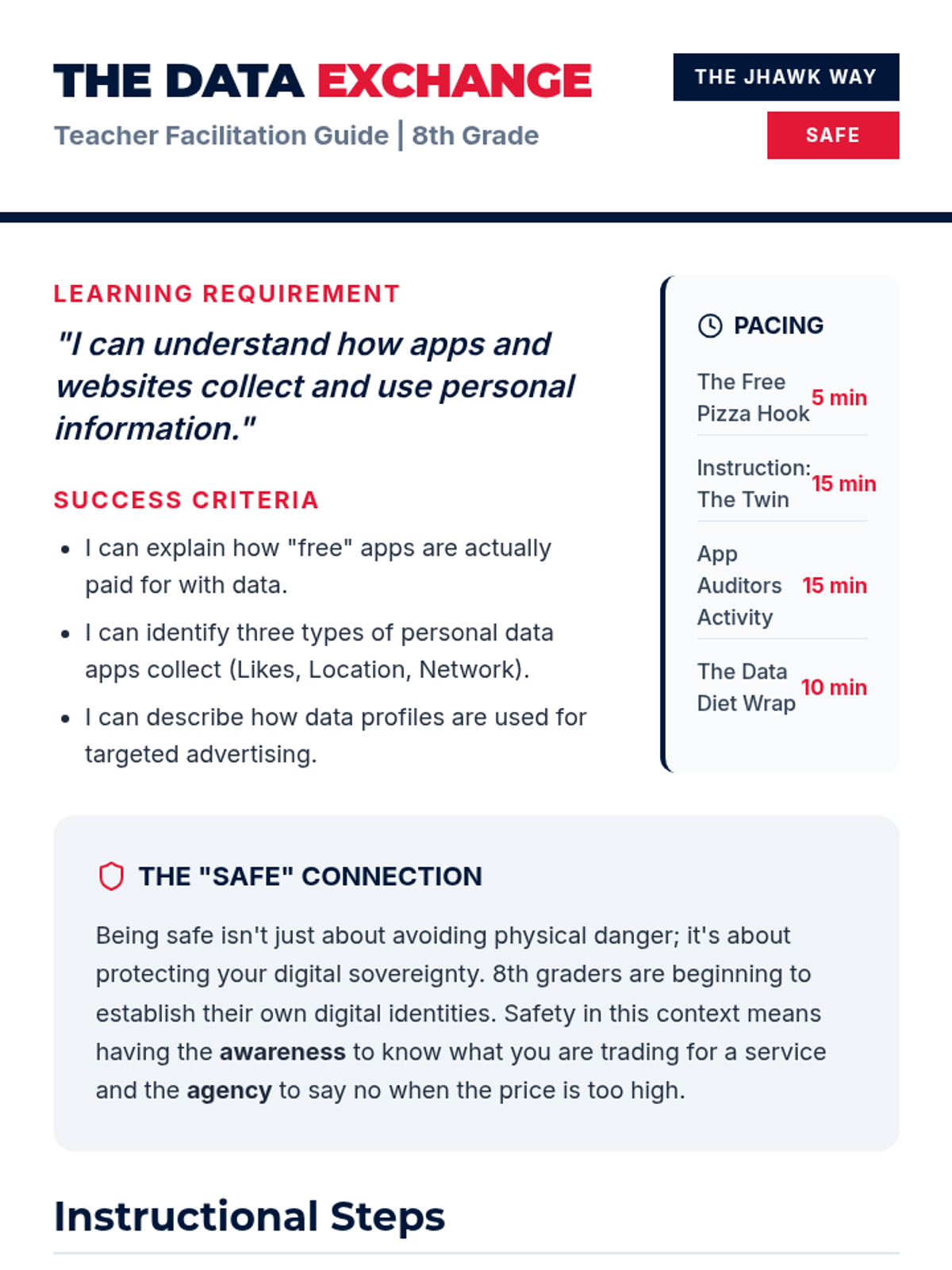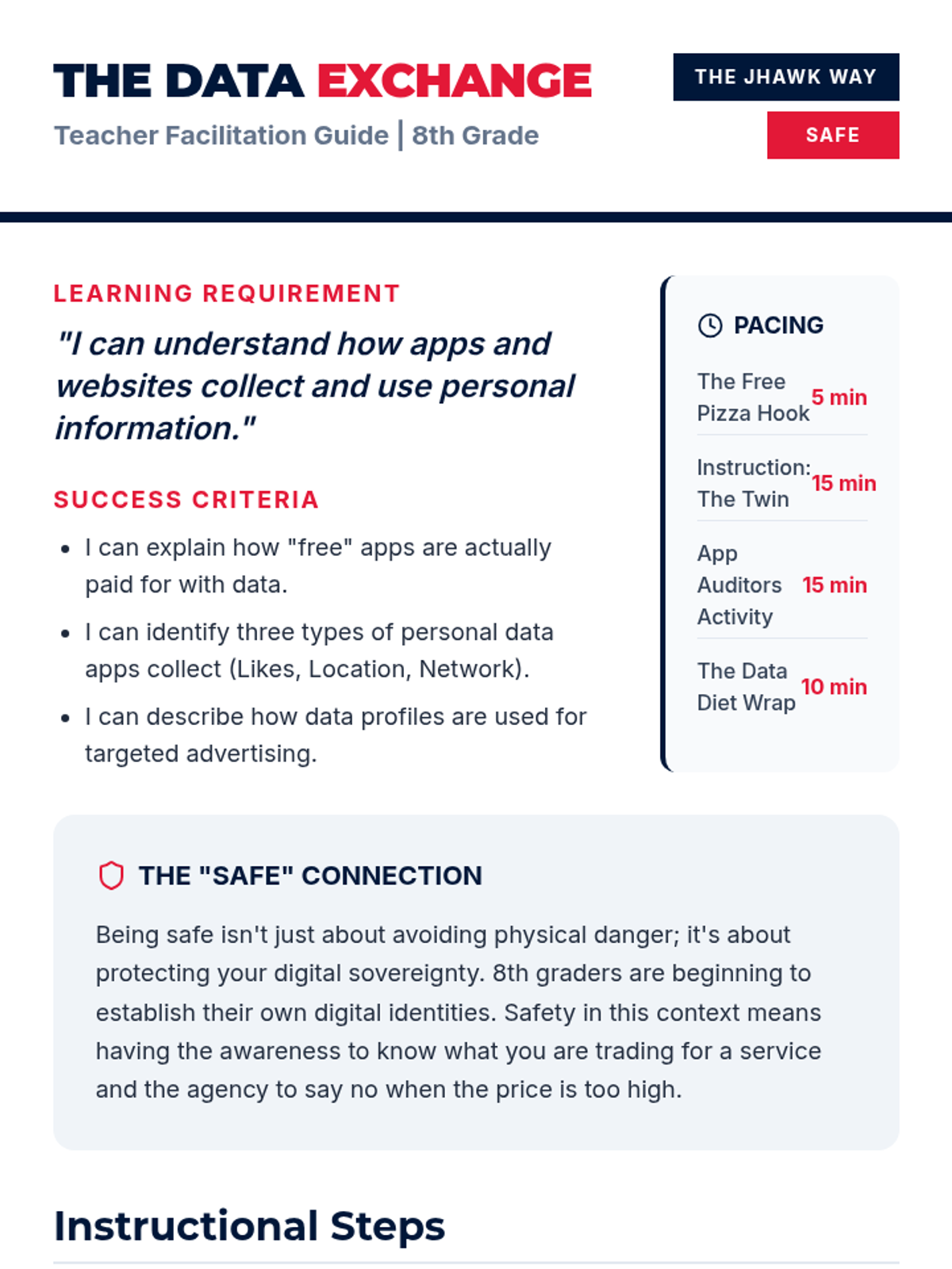 An 8th-grade lesson on understanding data collection and the 'hidden price' of free apps. Students explore how their data is tracked and used for advertising through the JHawk Way lens of being Safe.