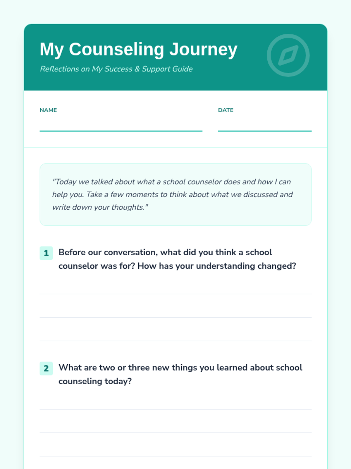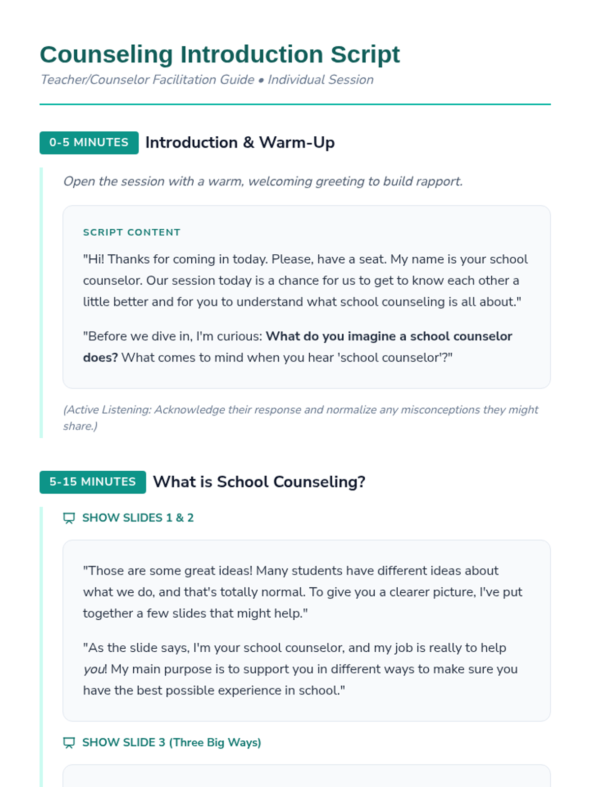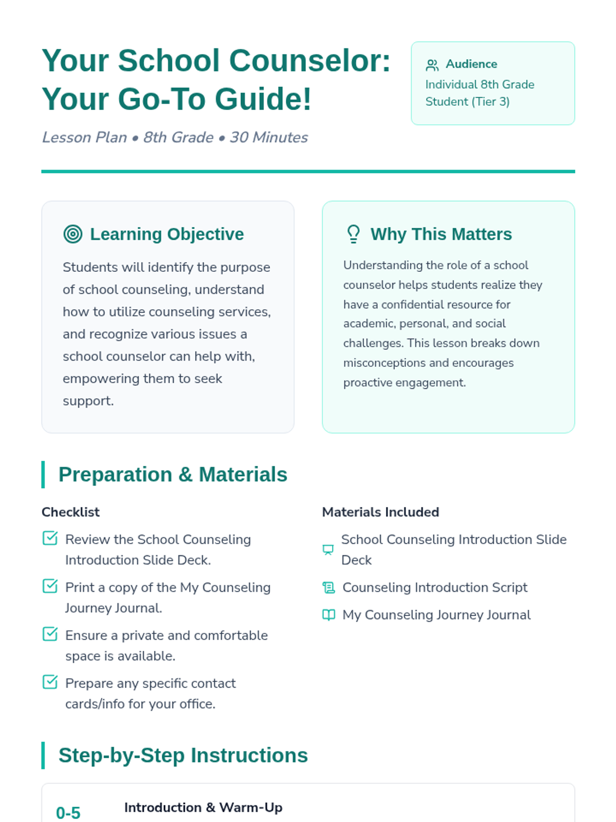 An individual Tier 3 lesson for 8th-grade students that introduces the role of a school counselor, explains confidentiality, and empowers students to utilize counseling services for academic, social, and career support.
