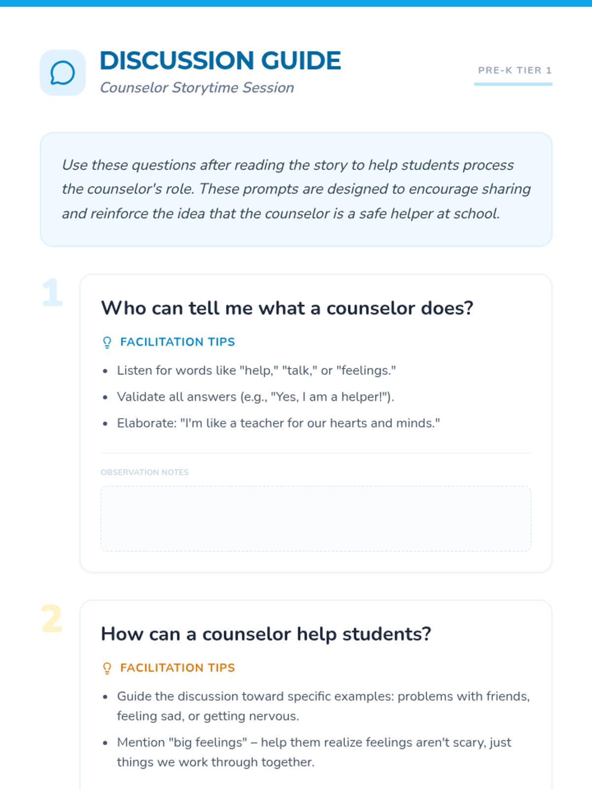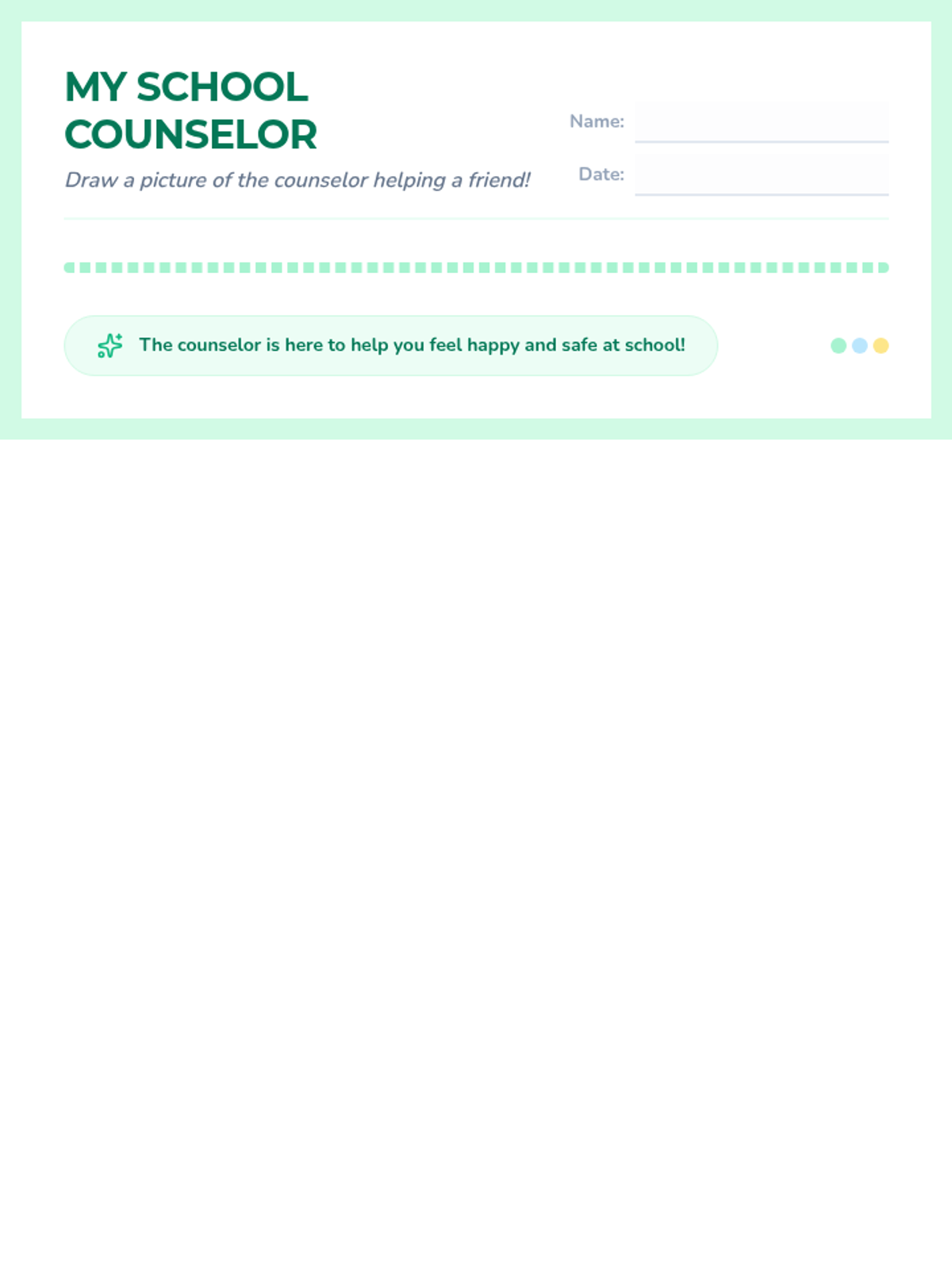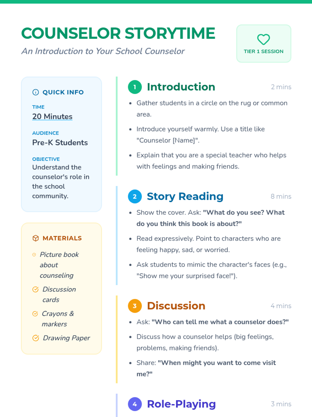 A 20-minute introductory session for Pre-K students to meet their school counselor and understand how they provide support through a story and creative activity.