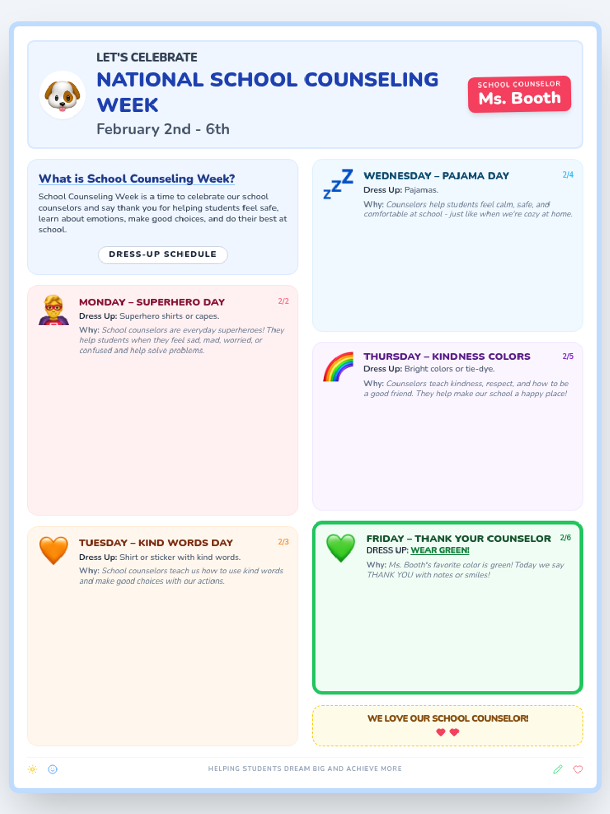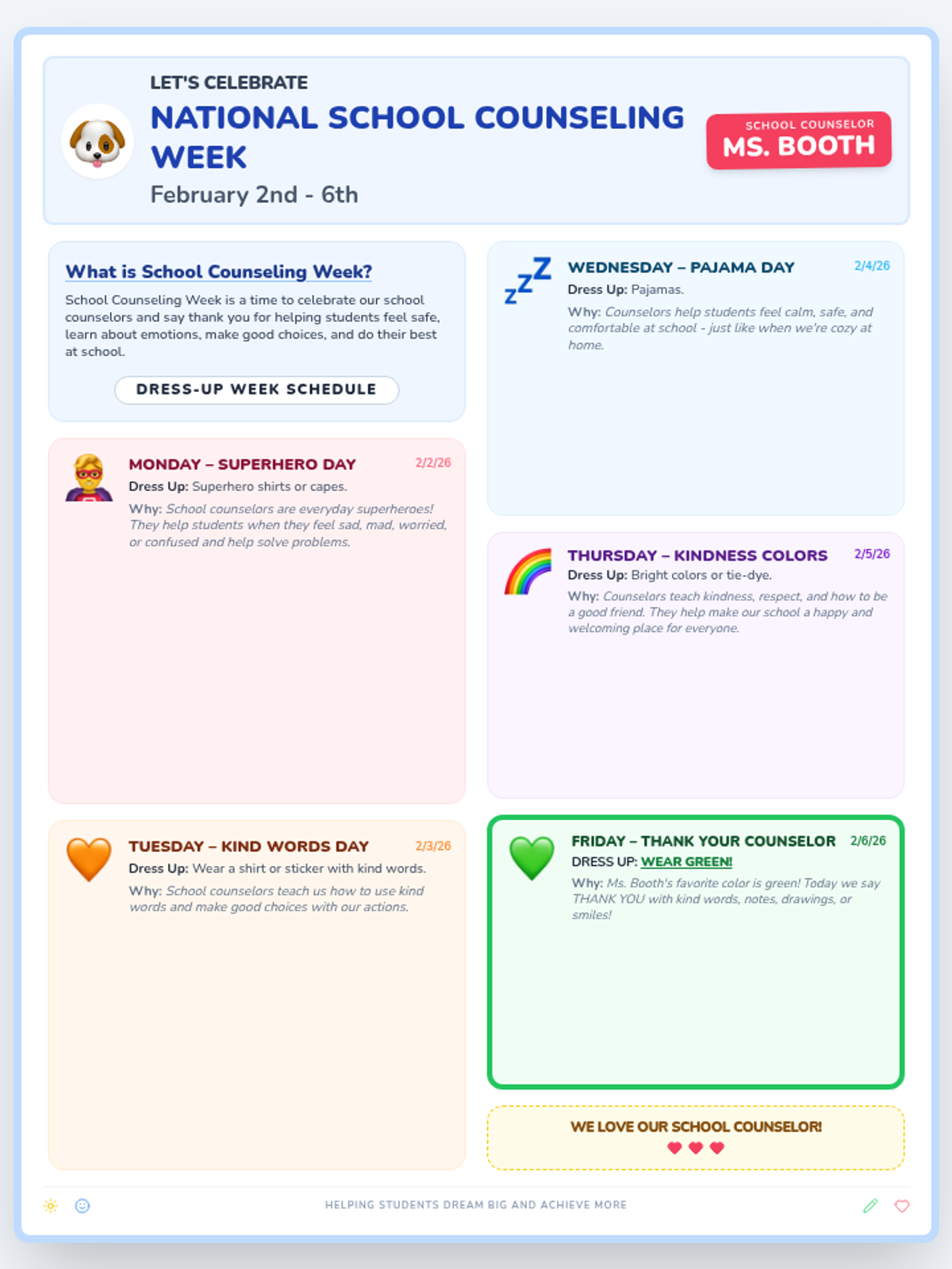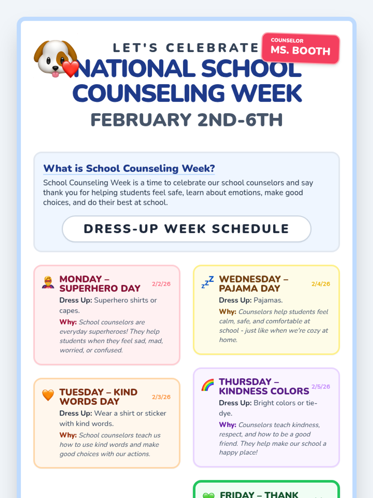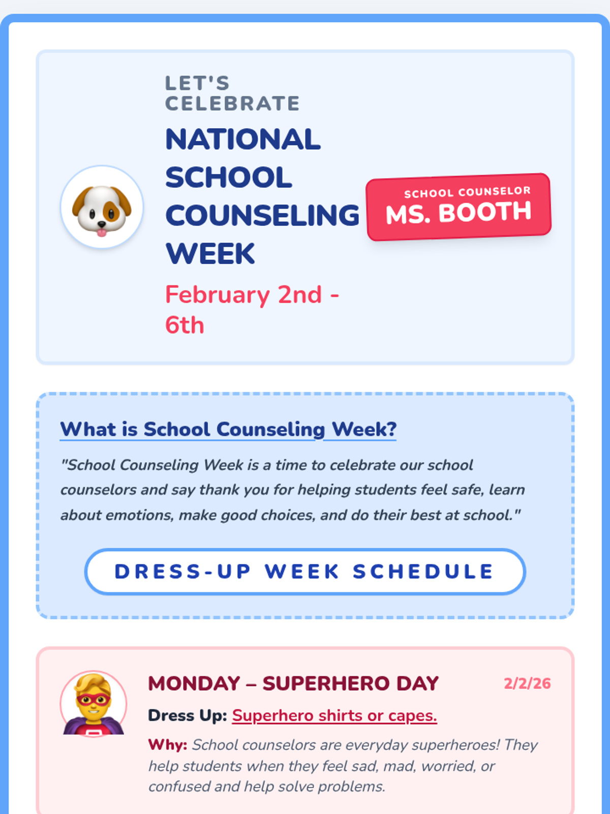 Materials for celebrating School Counselor Week, featuring flyers for students and parents.